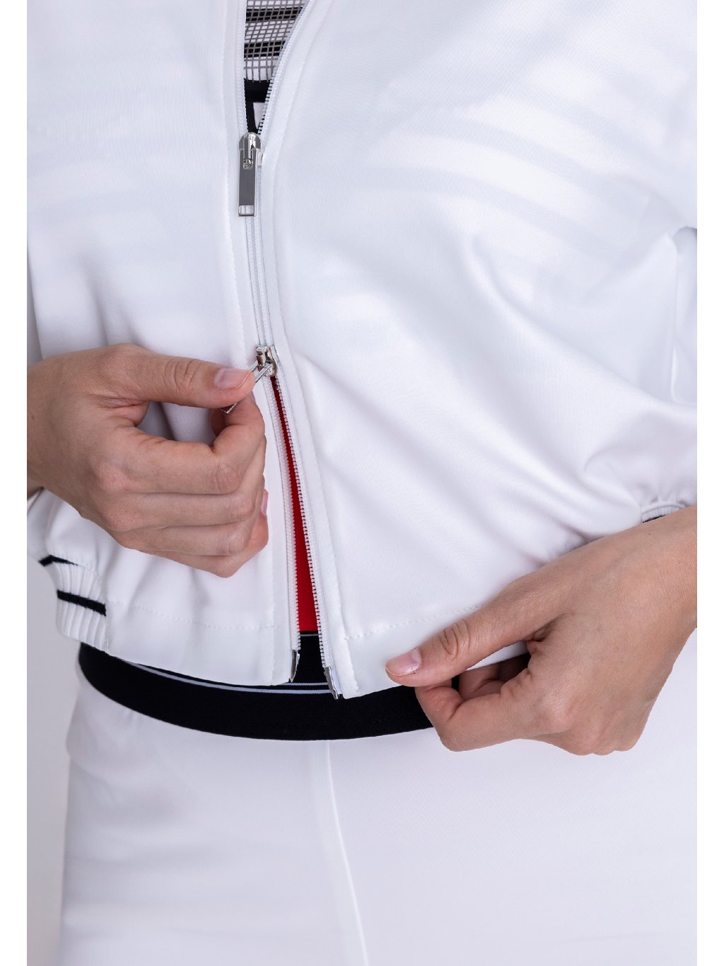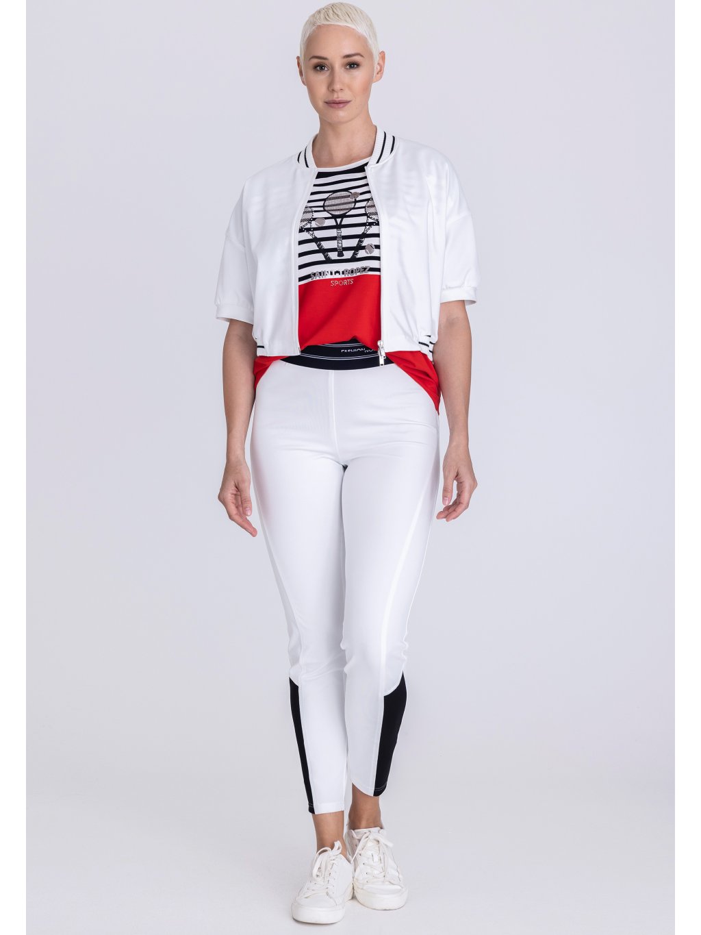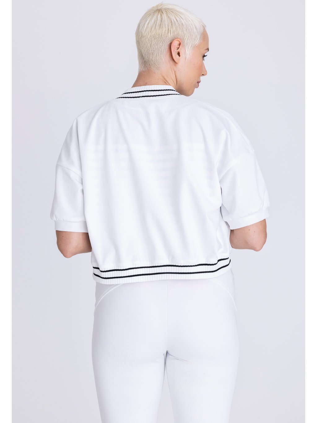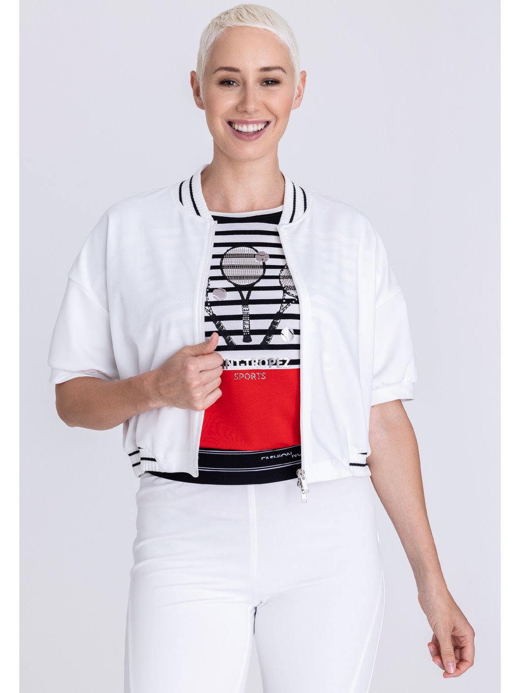 Krátká bundička Tuzzi v čistě bílé barvě má stojáček, krátké rukávy s manžetami a zip. Stojáček a lem je oživen černými kontrastními pruhy. Krásný jednoduchý kousek, který je výrazný a oživí každý outfit,.