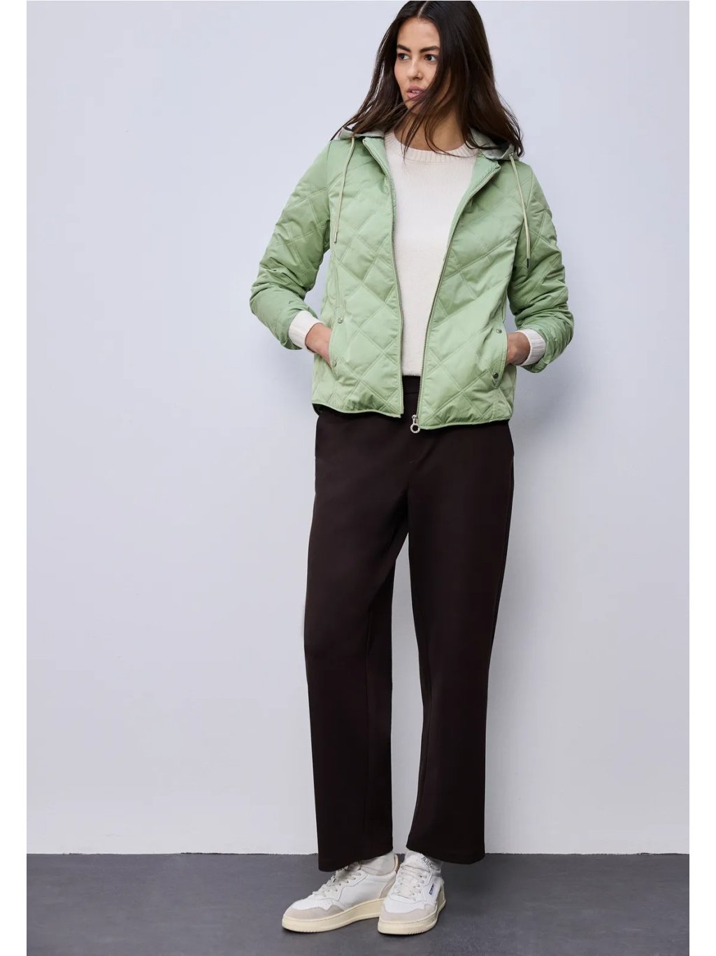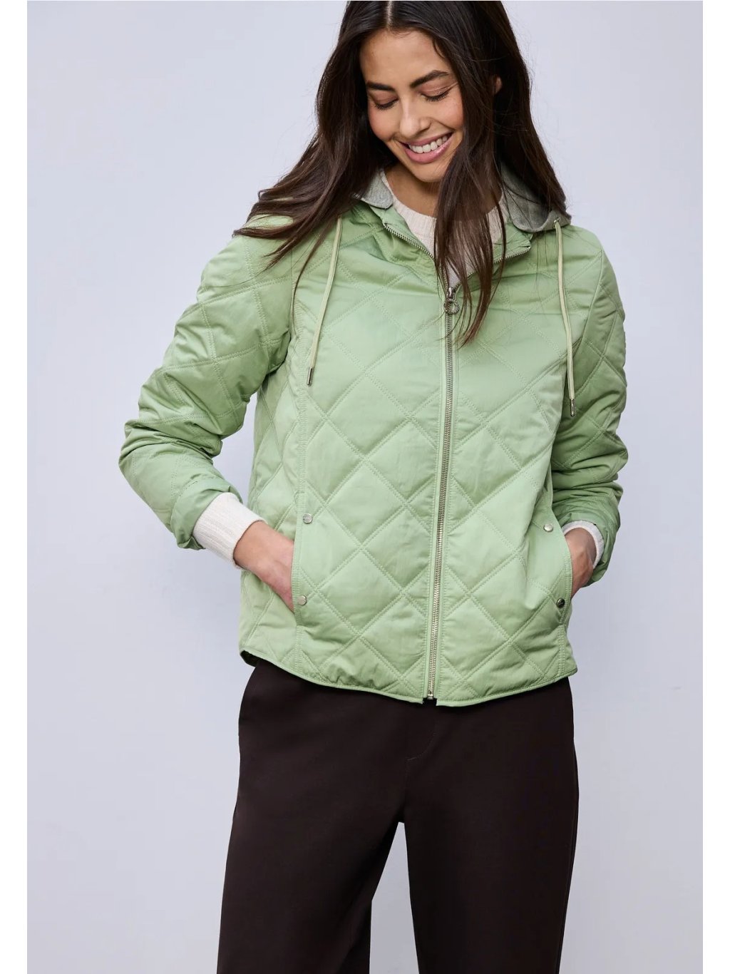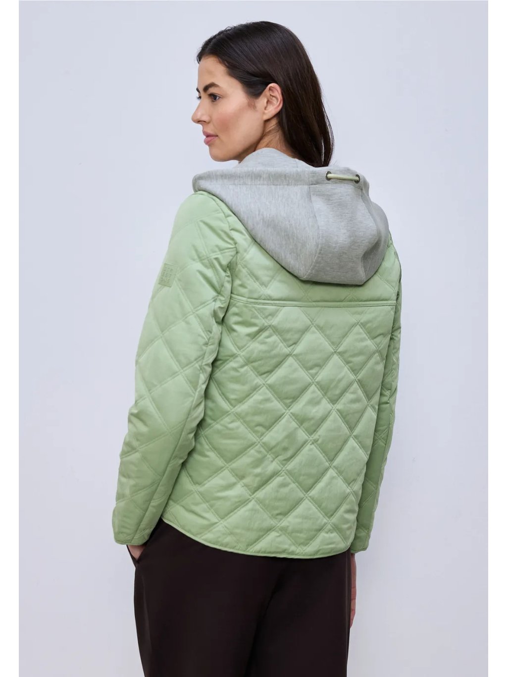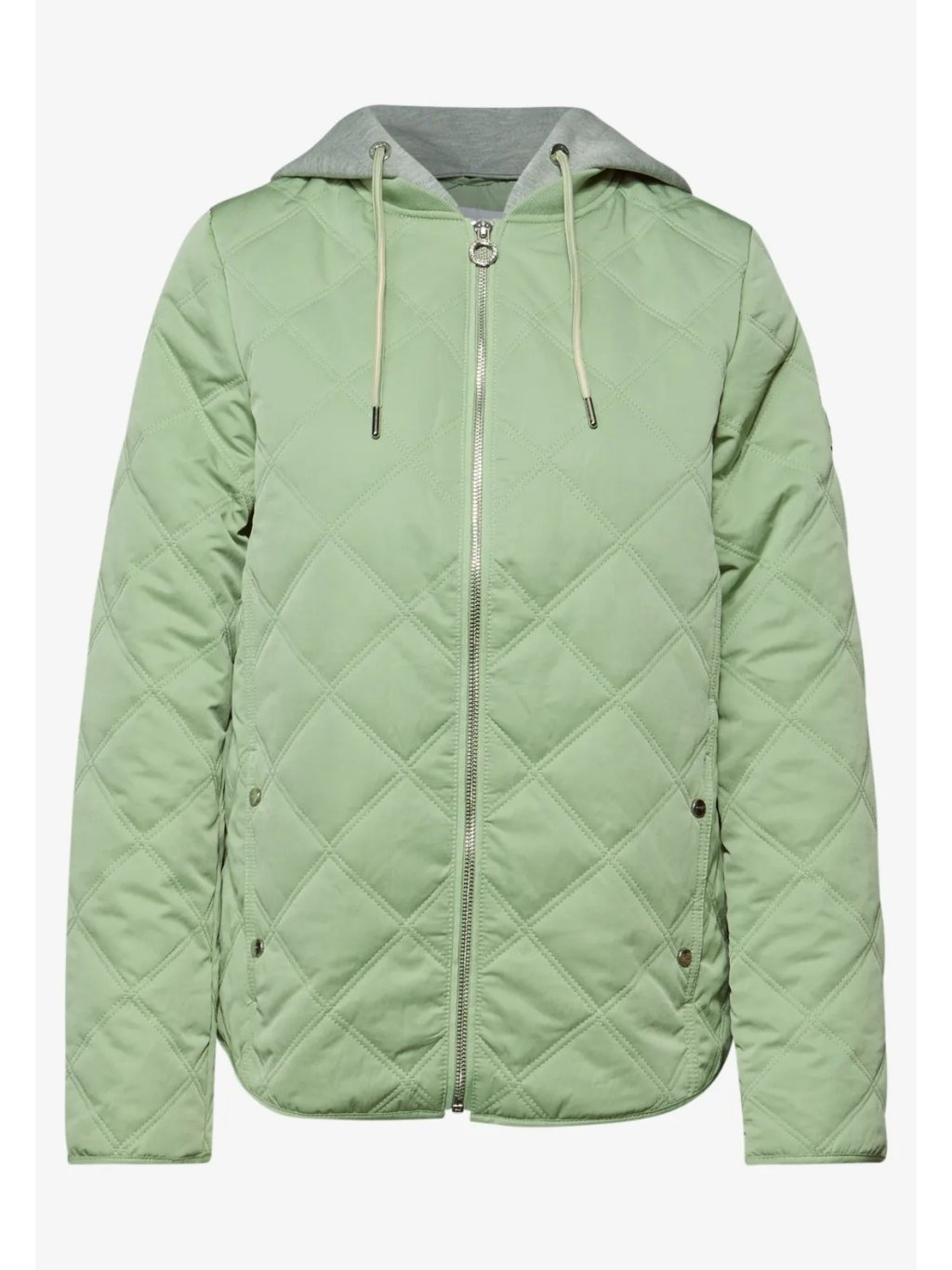 S touto krátkou prošívanou bundou od Street One pro ženy získáte ležérního společníka pro mírné dny: odnímatelná žerzejová kapuce se stahovací šňůrkou, obousměrný zip a boční kapsy zajišťují funkčnost a každodenní praktičnost. Žebrované manžety na rukávech a diamantový prošívaný vzor dodávají bundě strukturu a moderní šmrnc. Vyberte si tuto prošívanou bundu, pokud se chcete cítit pohodlně i během přechodných ročních období.