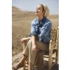 Světlejší riflová bunda do pasu, s vyšívanými detaily okolo manžet, strečová. Vhodná k šatům.