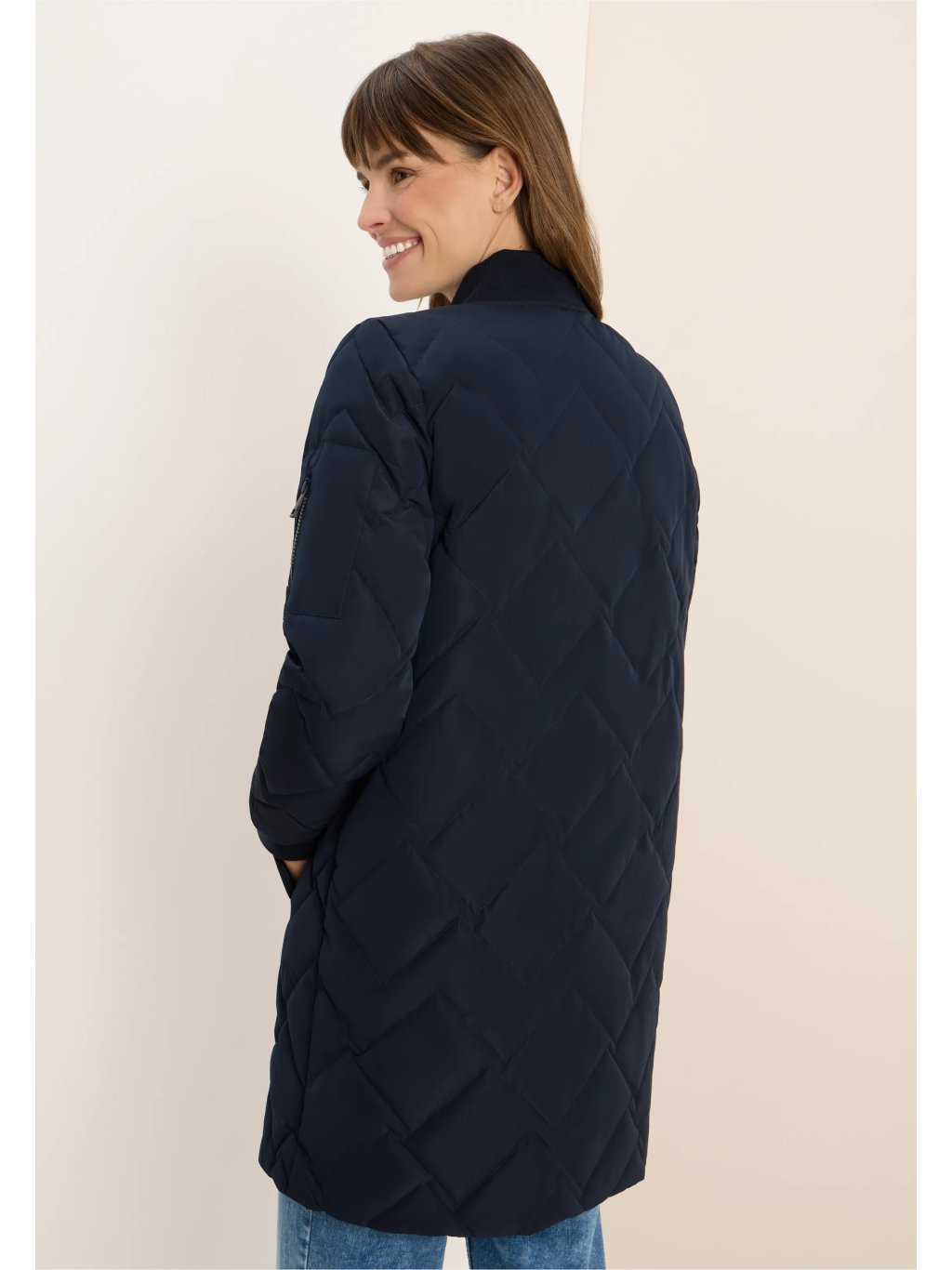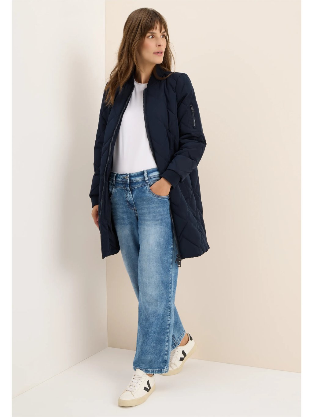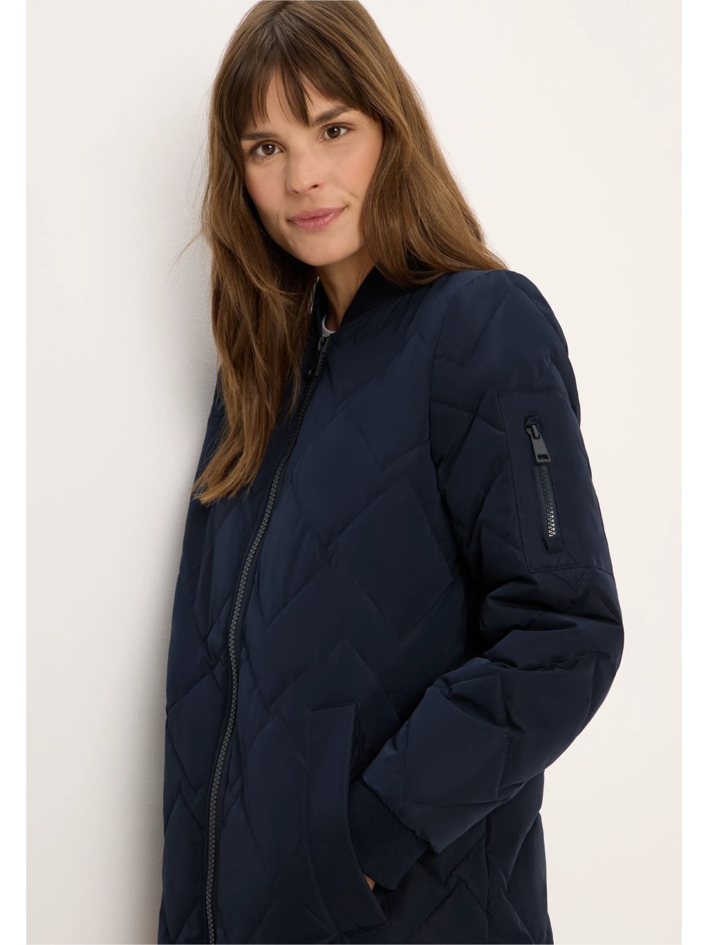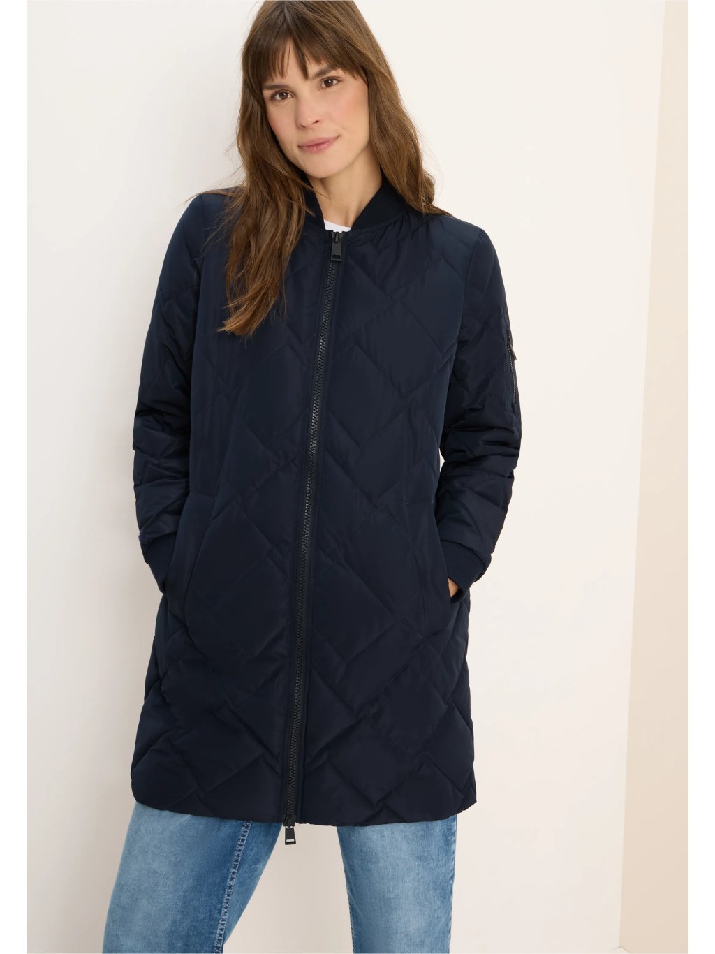 Tato dlouhá prošívaná bunda od značky CECIL pro ženy zaujme svou módní siluetou a pohodlnou lehkostí. Žebrovaný límec, manžety a malá kapsa na zip na rukávu dodávají bundě sportovní nádech. Propracované prošívání a obousměrný zip zajišťují funkčnost a styl v jednom.