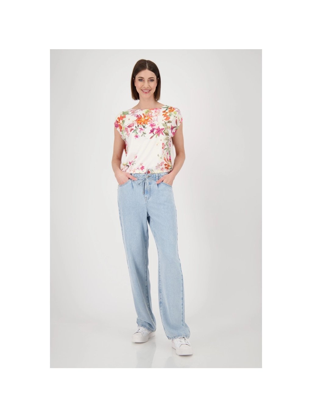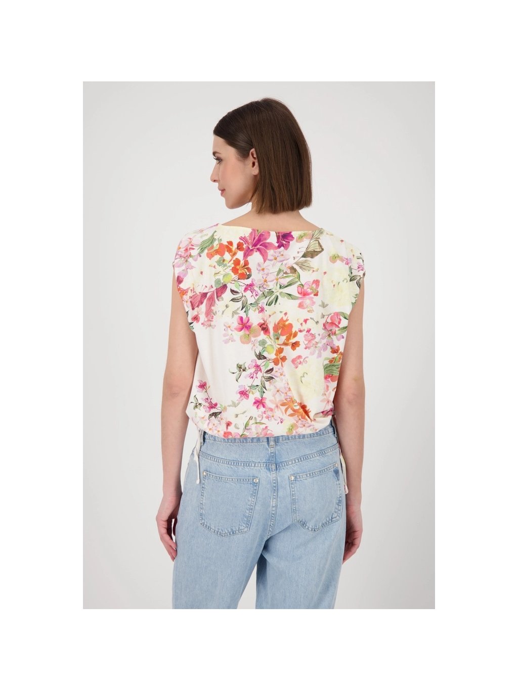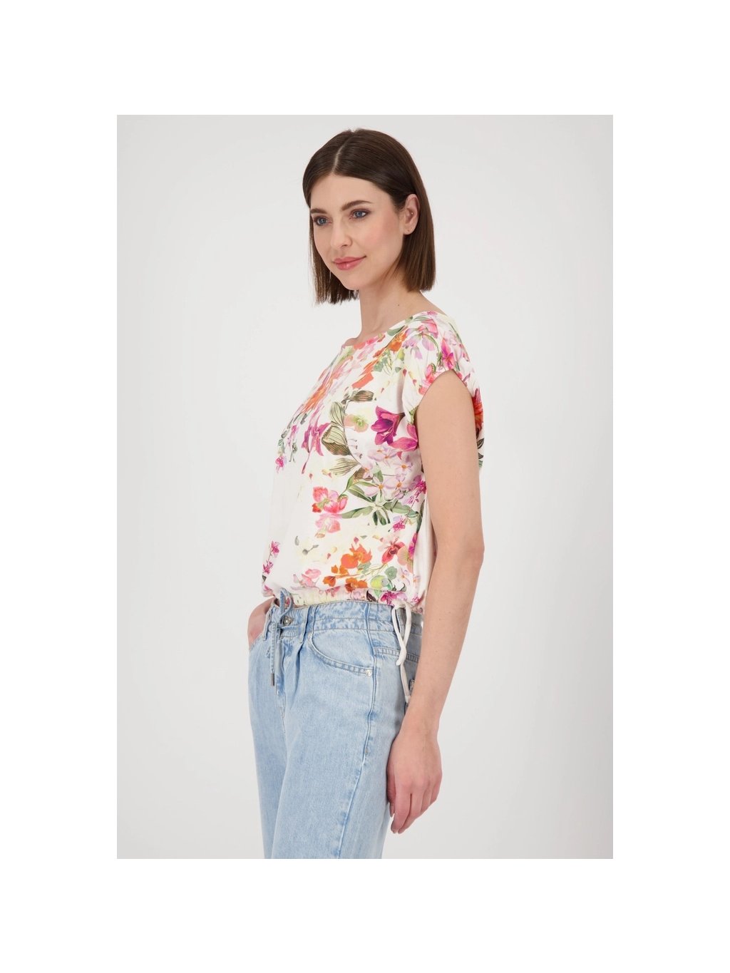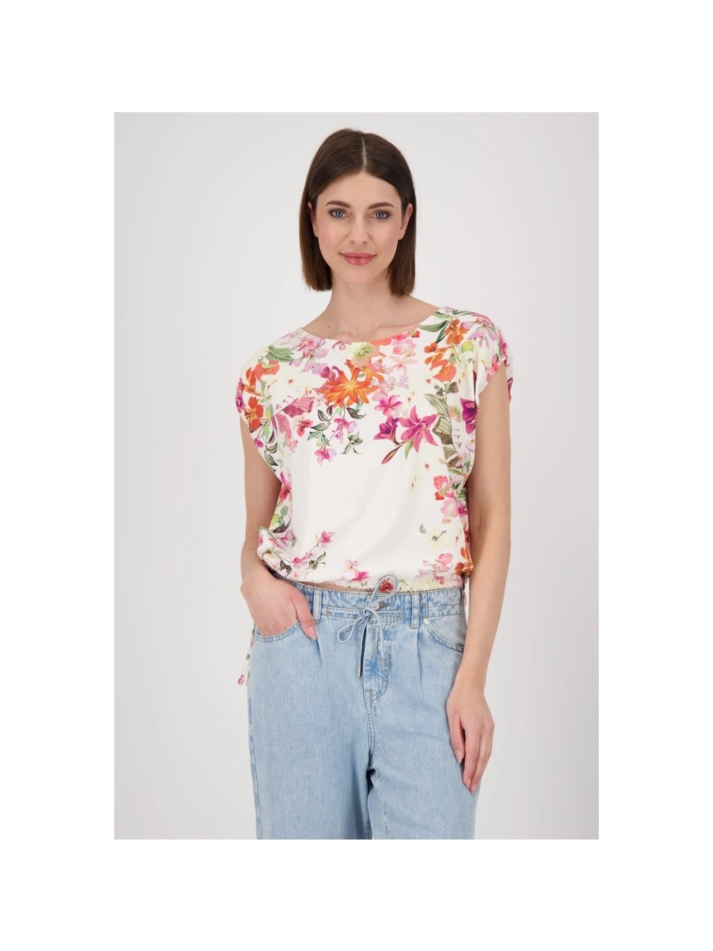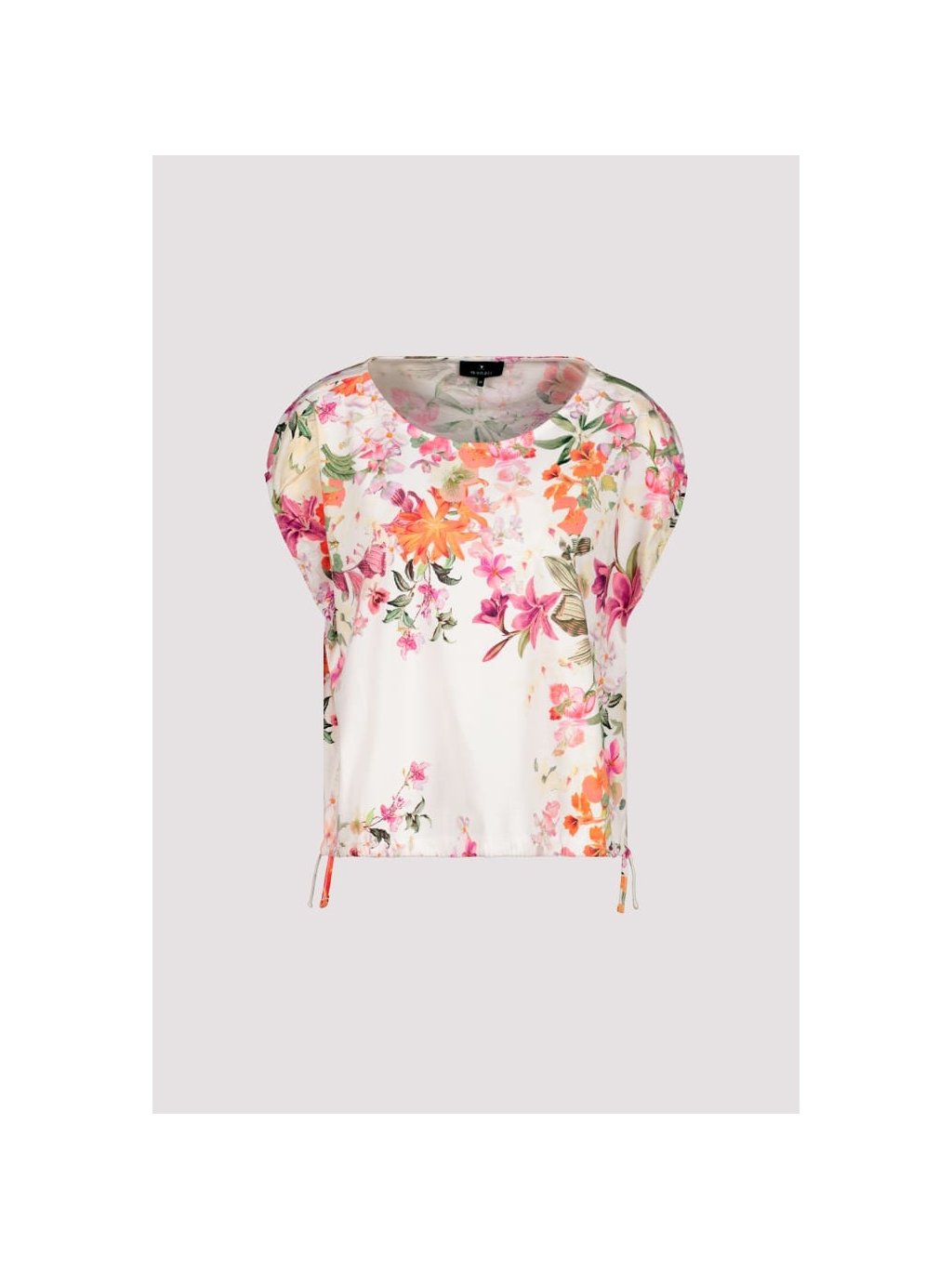 Tričko ze 100% bavlny zaujme svým výrazným květinovým potiskem a dvěma bočními rozparky se zavazováním.