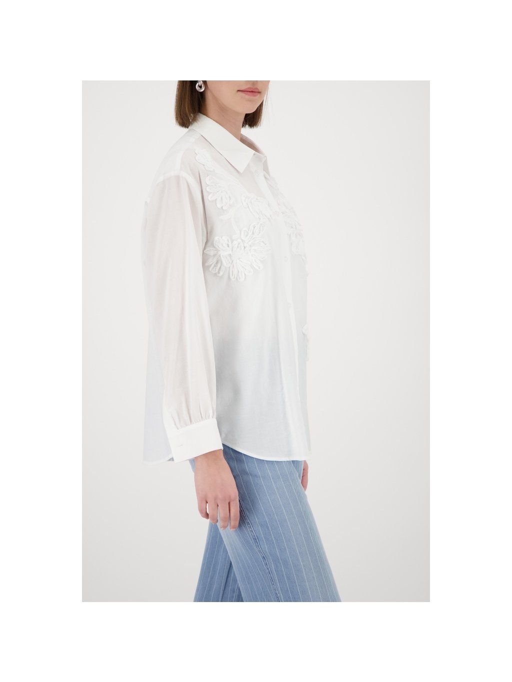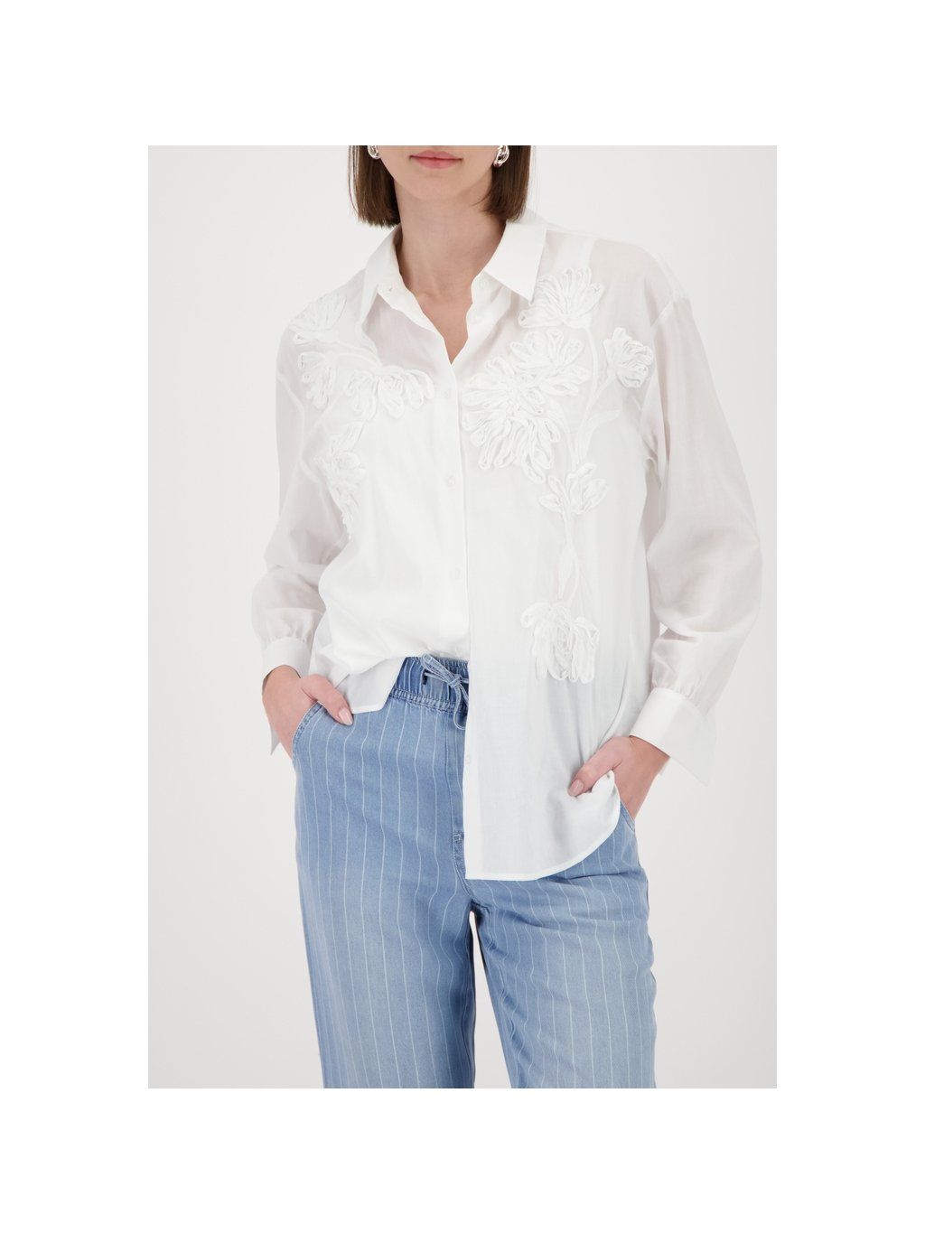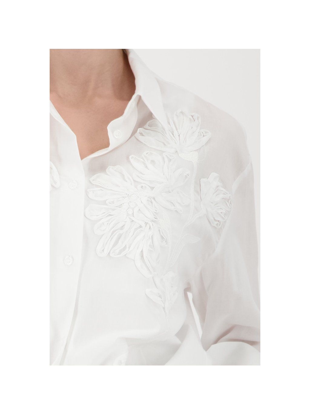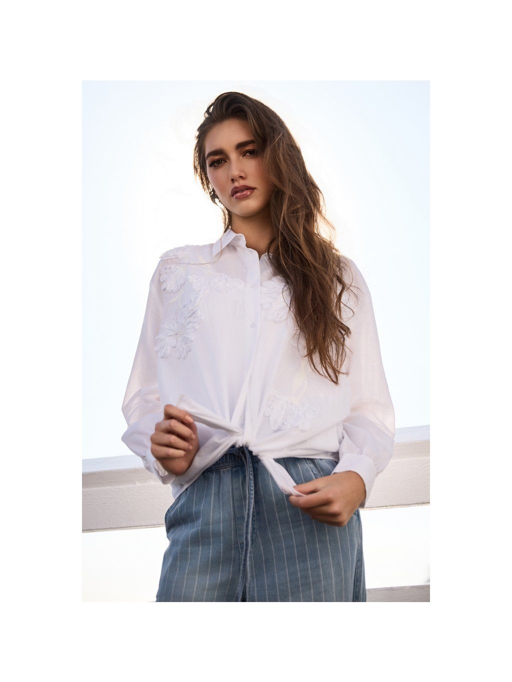 Elegantní košile vyrobená z vysoce kvalitní bavlny a modalu, zdobená jemnou květinovou výšivkou a okouzlujícími volánky. Nezbytný kousek pro ženy, které dbají na styl.