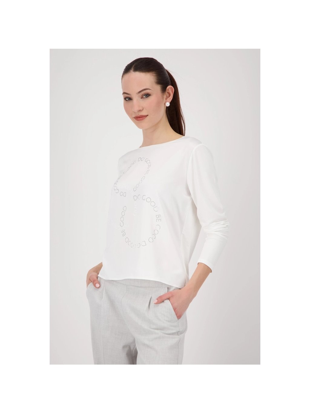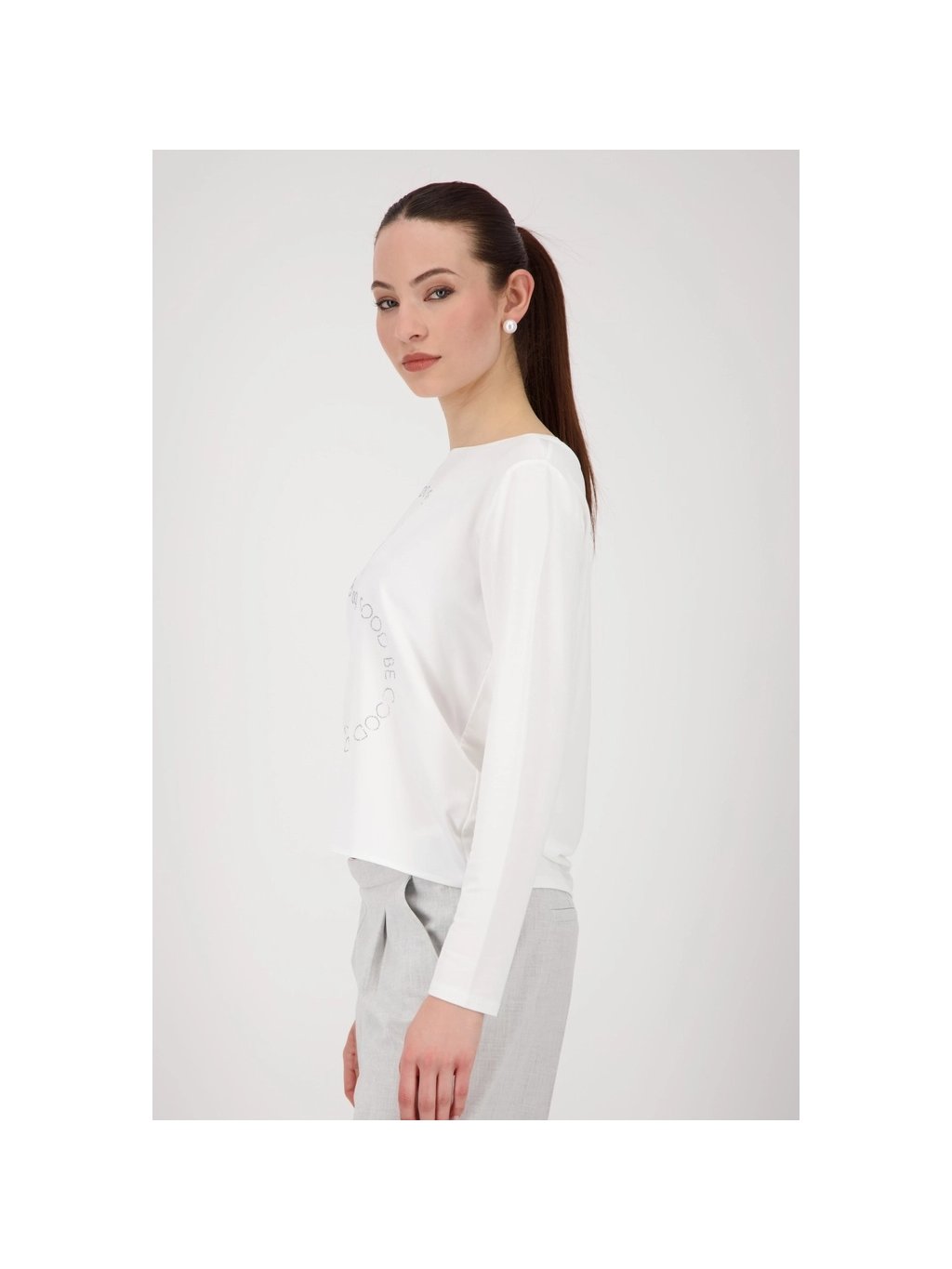 Tato halenka vyrobená ze splývavé viskózy s modalem zaujme svým pružným pohodlným materiálem a elegantním saténovým vzhledem vpředu. Kamínky a logo „Do Good Be Good“ jí dodávají oslnivé detaily.
