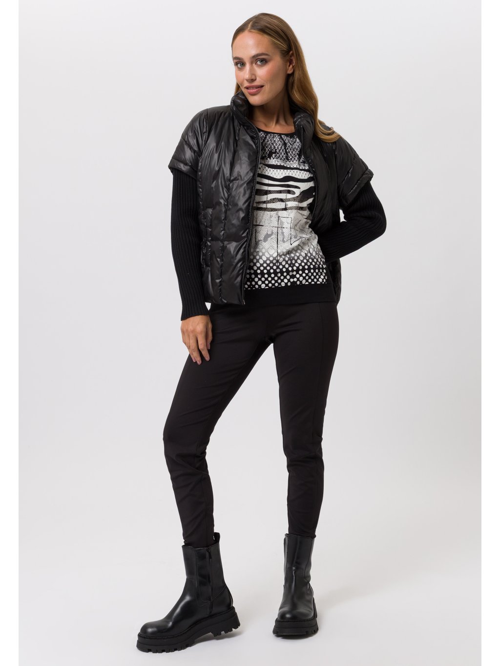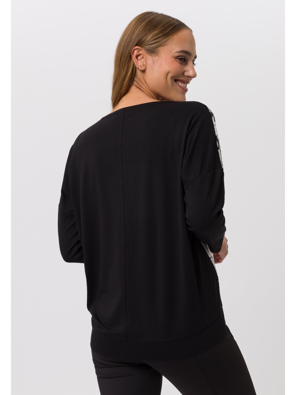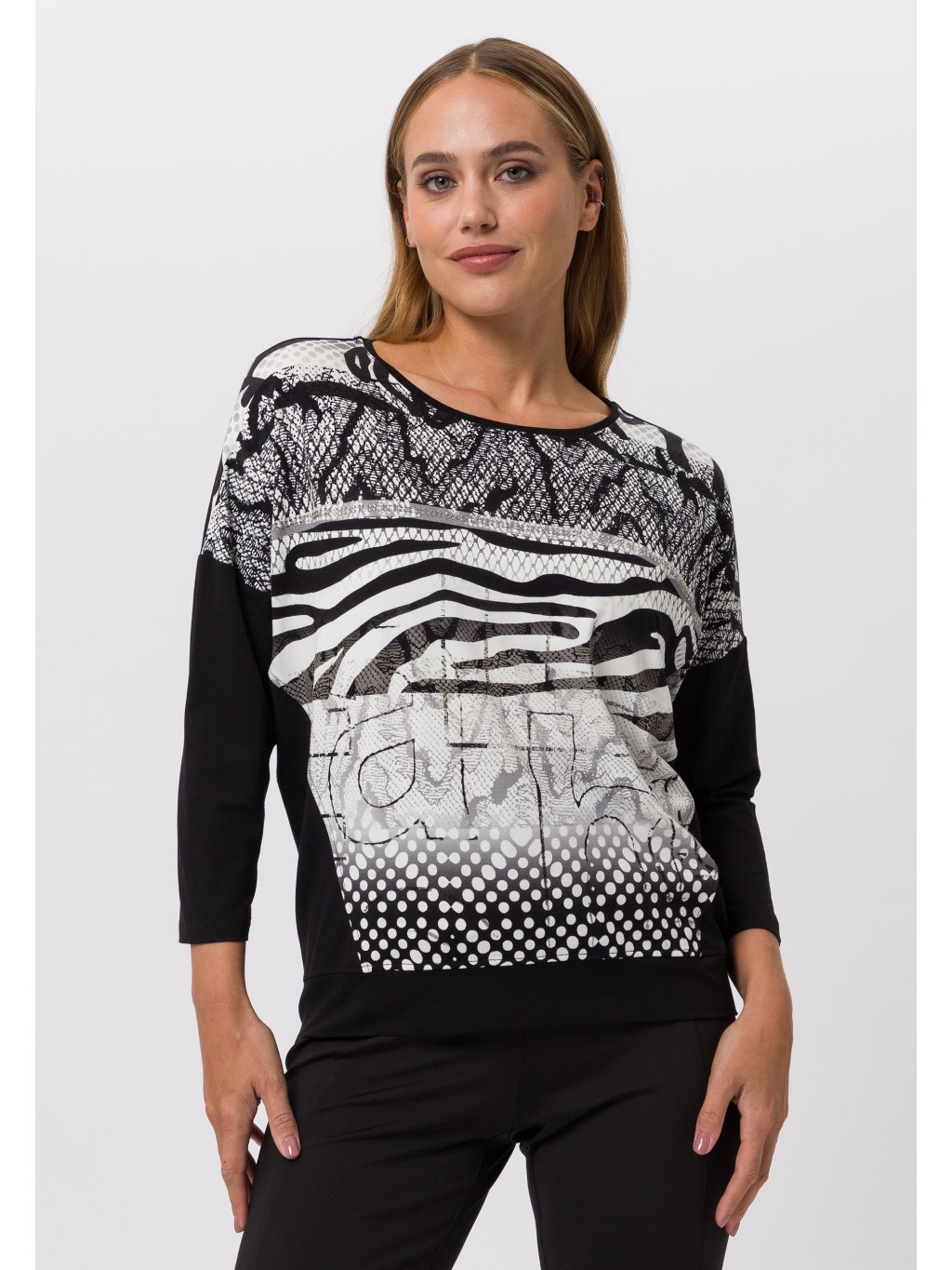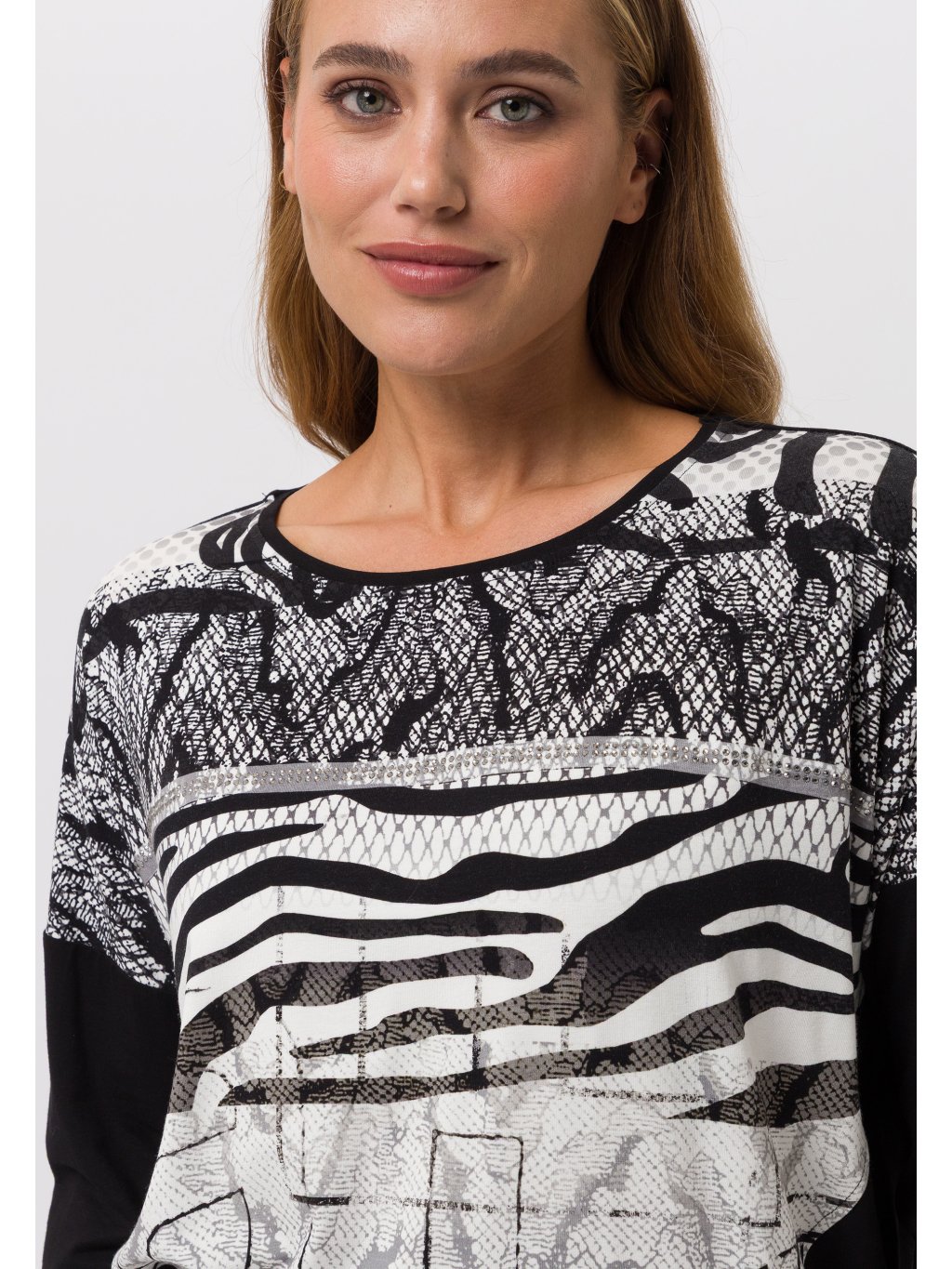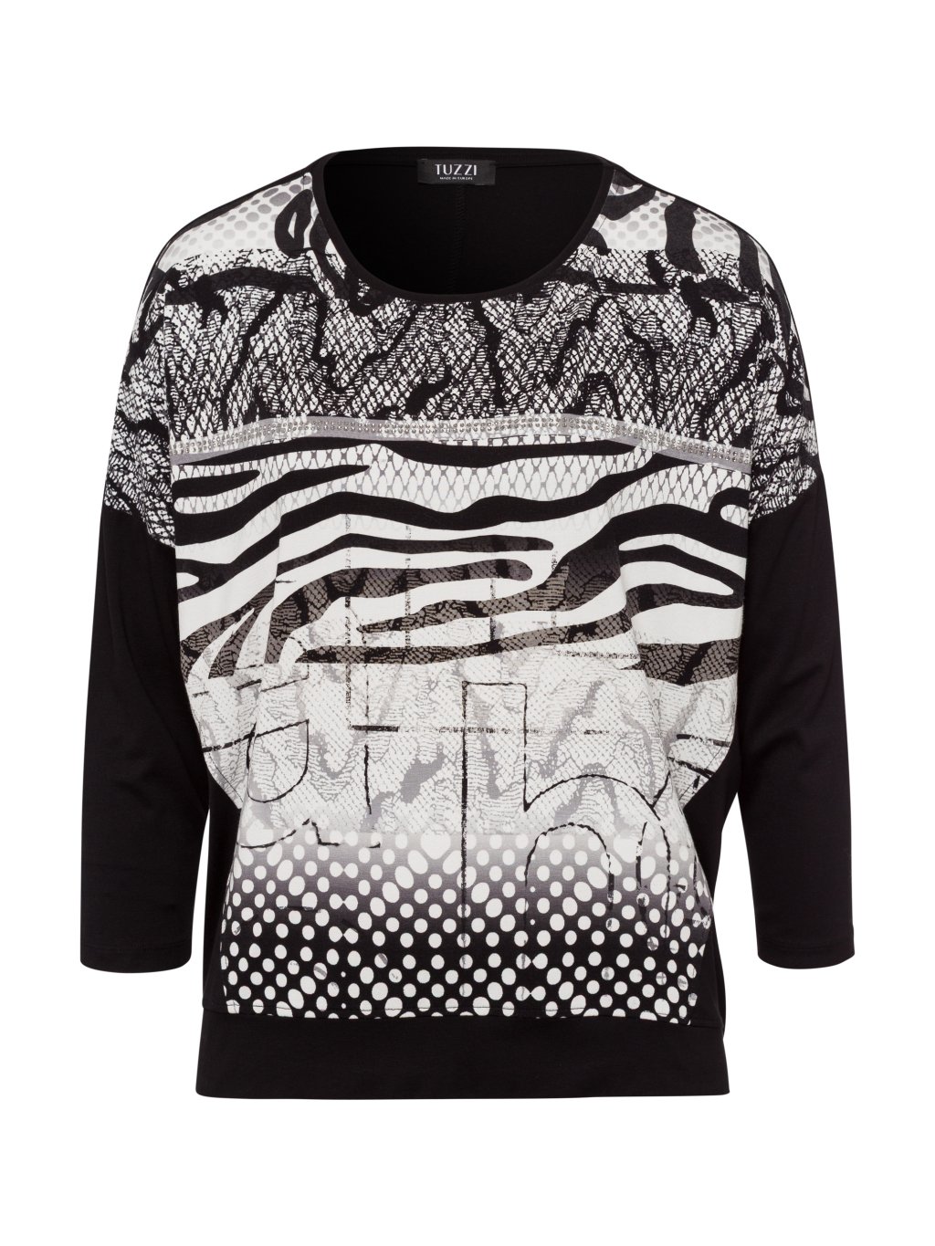 Lehká halenka Tuzzi ze splývavé viskózy má zeštíhlující střih, kulatý výstřih a spadlé rukávy. Halenka má na přední straně poutavý potisk a pruh s kamínky. Krásný, pohodlný a snadno kombinovatelný kousek pro podzimní dny.