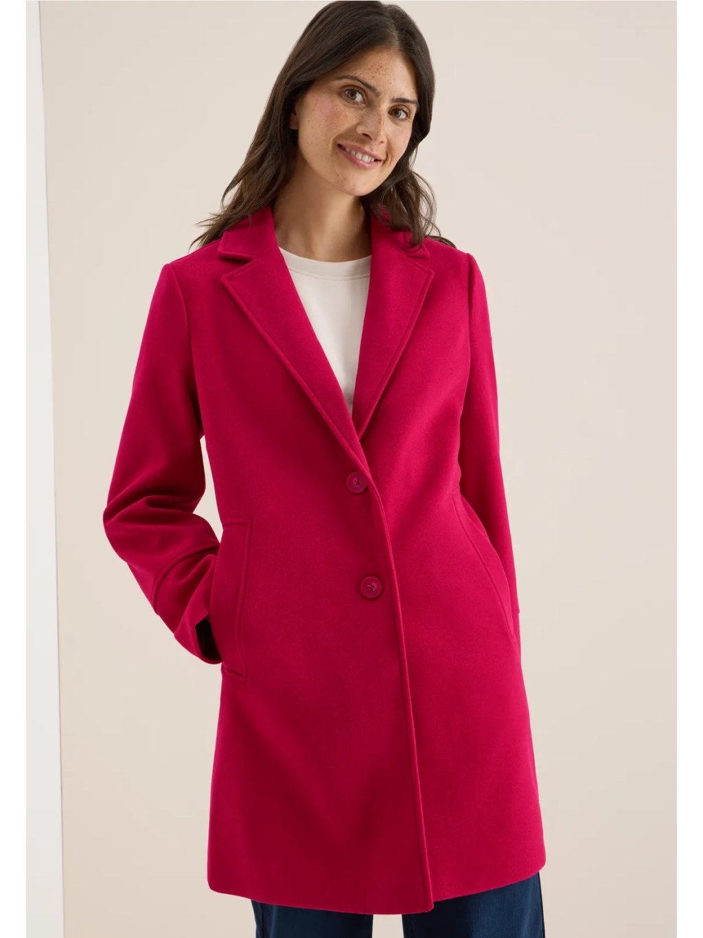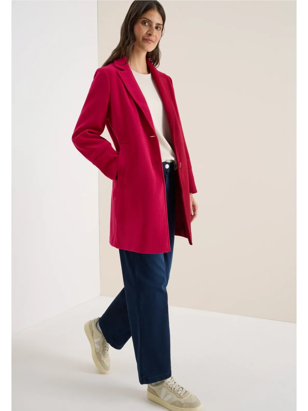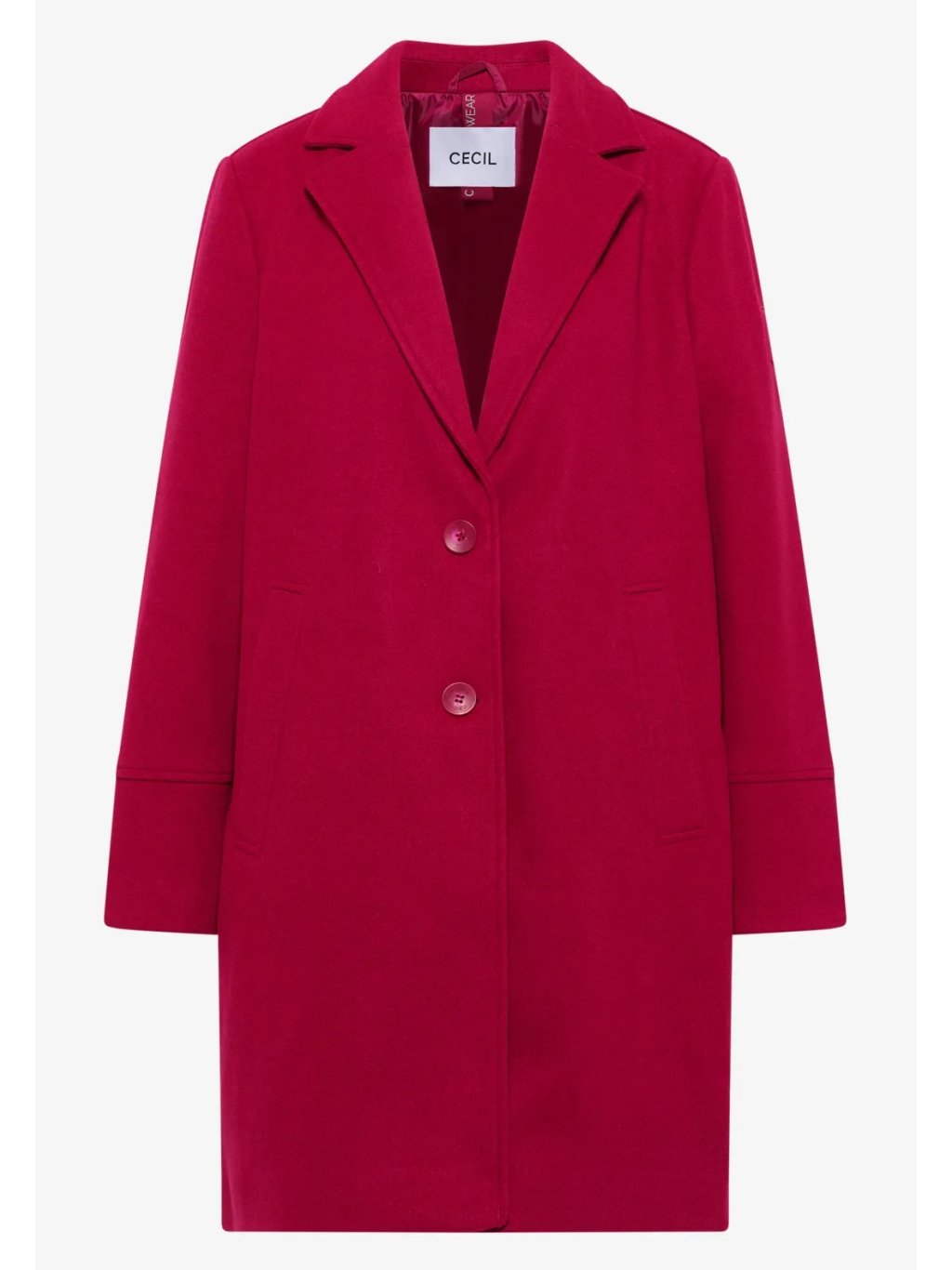 Dámský kabát CECIL zaujme svým moderním vlněným vzhledem a stylovým klopovým límcem. Dva knoflíky, boční kapsy a jemné ozdobné prošívání zdůrazňují klasický design s detaily ve stejném barevném tónu. Pohodlný střih a vysoce kvalitní vzhled z něj činí ideální doplněk do vašeho podzimního a zimního šatníku.