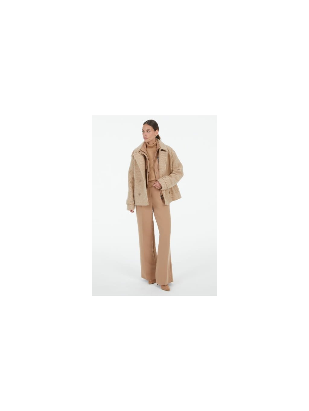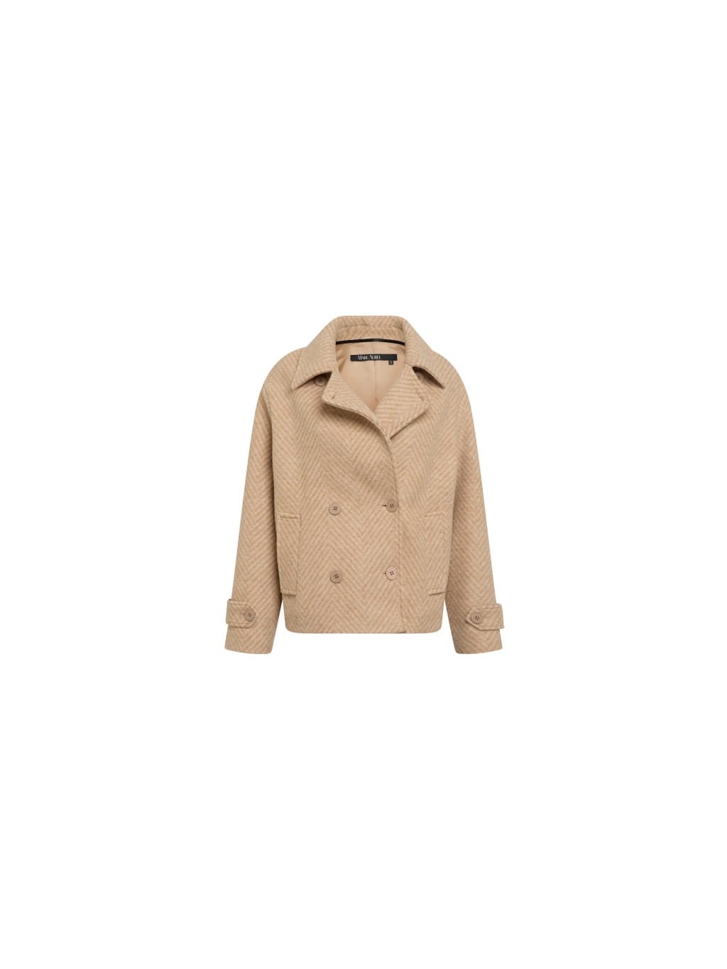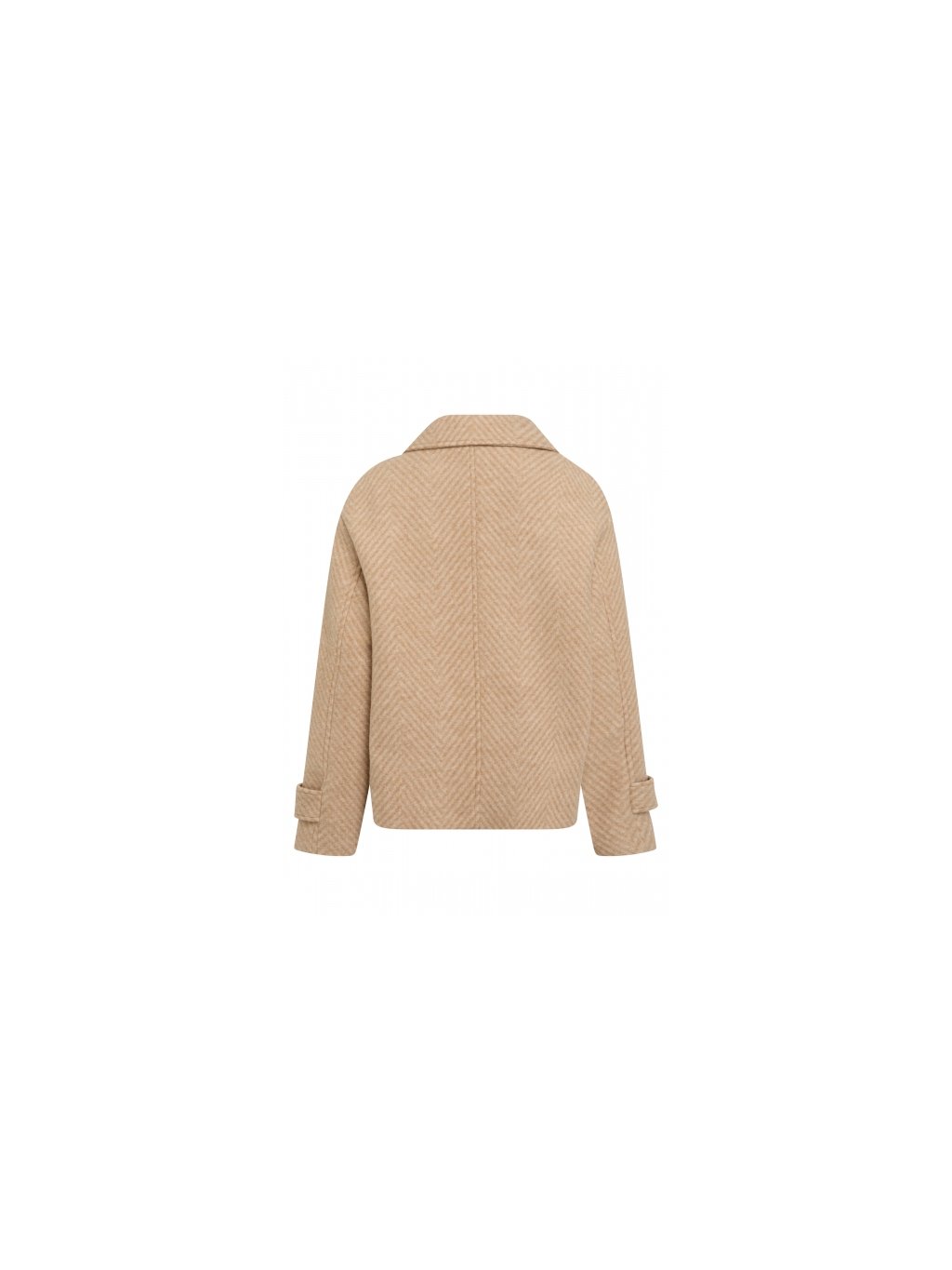 Tento kabátek caban z kartáčované směsi žerzeje a vlny kombinuje klasický střih s moderním objemem. Lemované kapsy a lem rukávů s proužkem vytvářejí sofistikovaný vzhled, zatímco vzor rybí kosti dodává nadčasový charakter. Ideální pro módní vzhled.