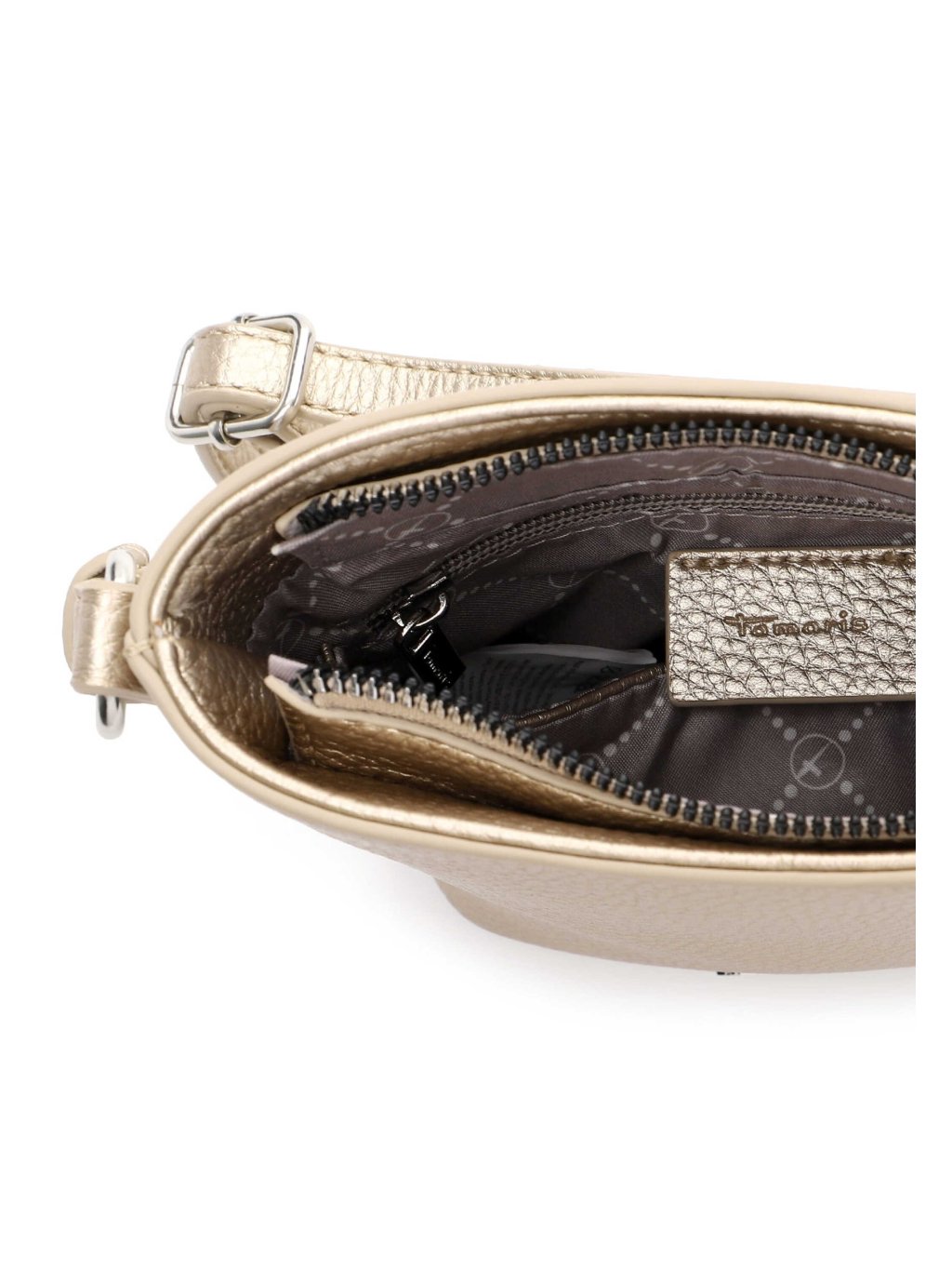Kabelka nabízí přehledný vnitřní prostor s hlavní přihrádkou, praktickou zadní kapsou na zip a bočním panelem na zip, který poskytuje další bezpečné místo pro uložení drobností. Díky tomu budete mít mobil, peněženku i další nezbytnosti vždy po ruce.