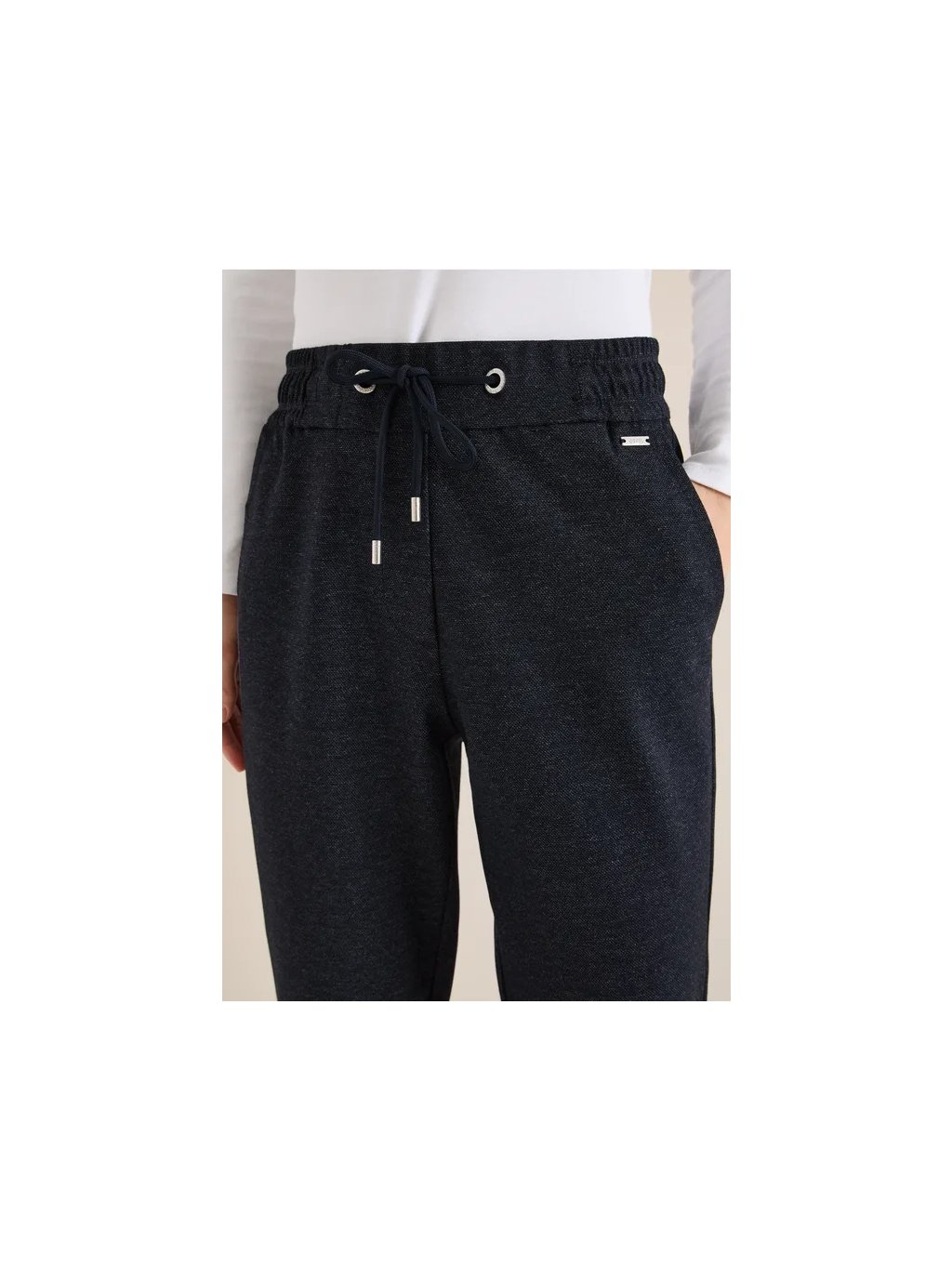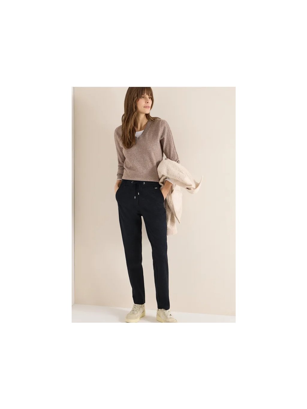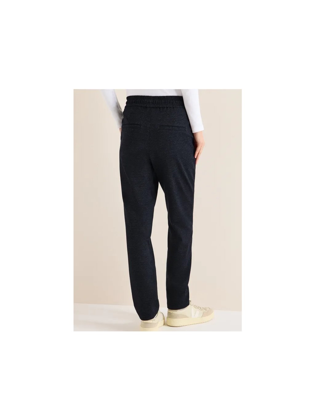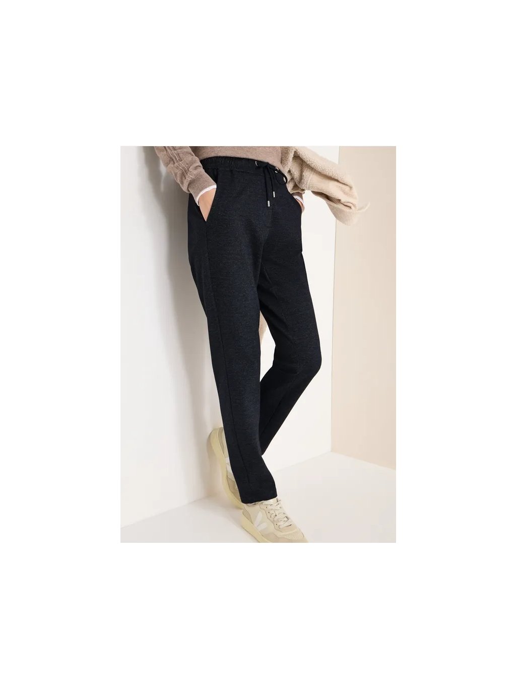 Tyto úzké kalhoty od značky CECIL pro ženy ve stylu Tracey nabízejí pohodlný a ležérní střih se středním pasem a elastickým lemem se stahovací šňůrkou. Směs viskózy s přidanou strečovou úpravou zajišťuje příjemný pocit. Jednobarevné provedení usnadňuje jejich kombinaci s dalšími outfity – ať už do kanceláře nebo na volný čas.