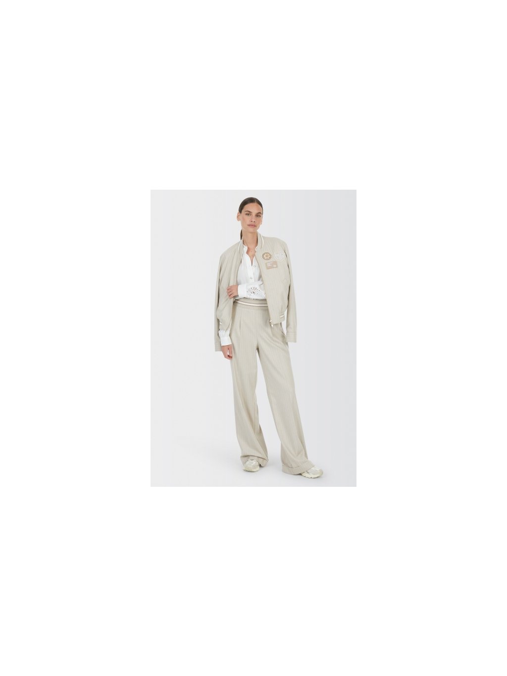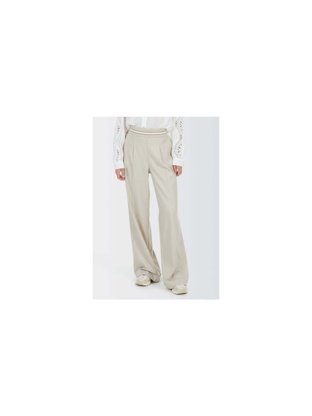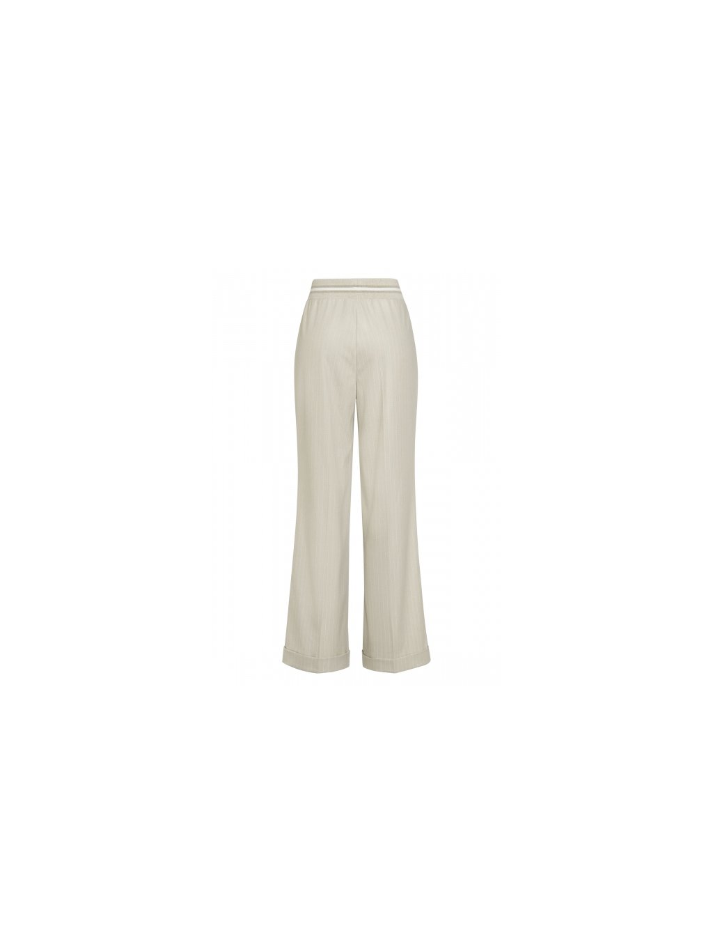 Tyto kalhoty jsou vyrobeny z lehké směsi viskózy a kombinují klasický styl s moderním pohodlím. Jemné proužky jim dodávají kalhotům sofistikovaný vzhled, zatímco pružný pas zajišťuje pohodlné nošení. Dekorativní pas z žebrovaného žebrování dodává kalhotám zvláštní akcent, zatímco sklady a kapsy na dotvářejí stylový design.