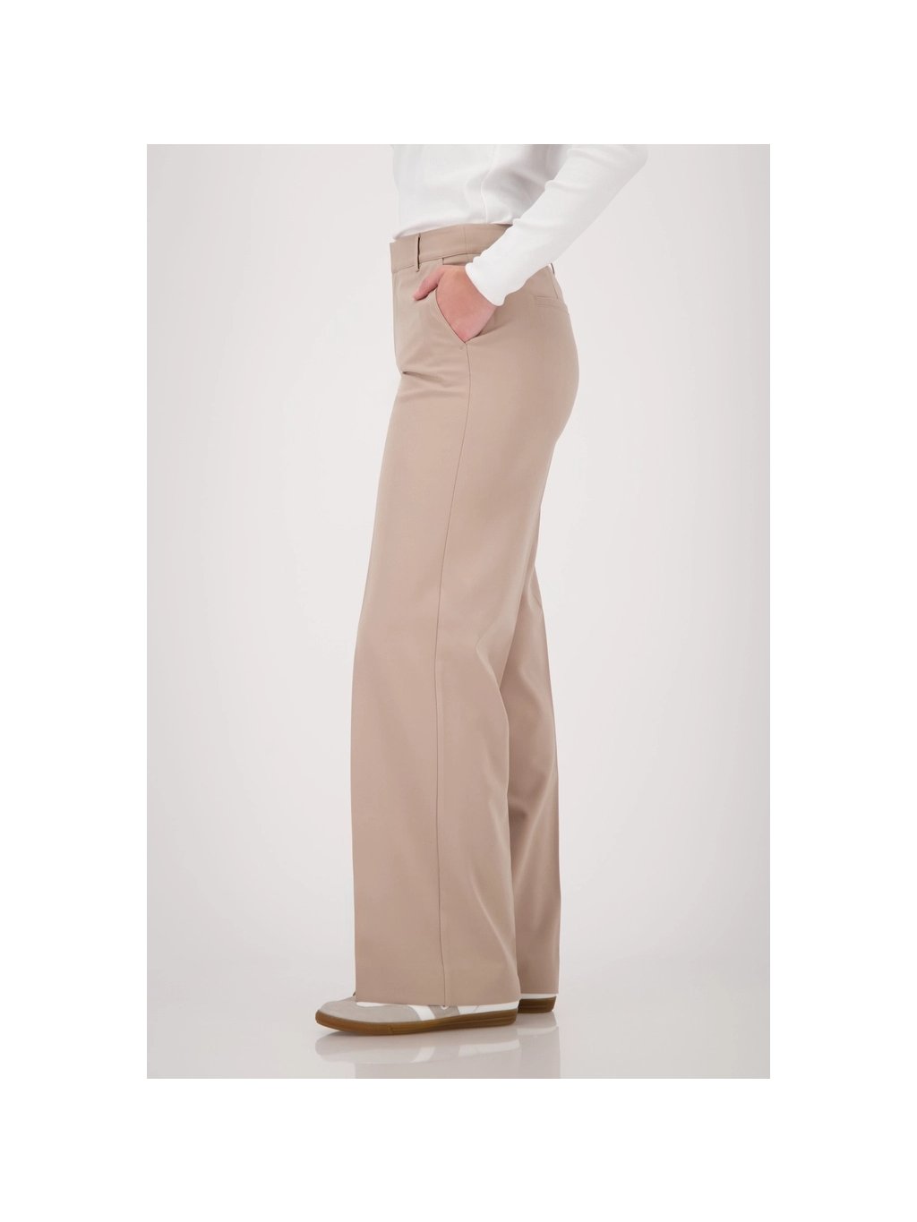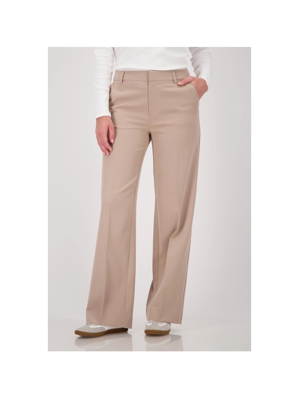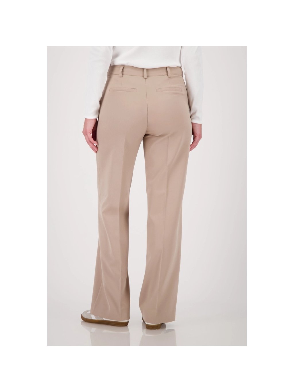 Elegantní kostýmkové kalhoty rovného střihu z strečového materiálu s nažehlovacími sklady, bočními kapsami a stylovými falešnými zadními kapsami – pro každou příležitost.