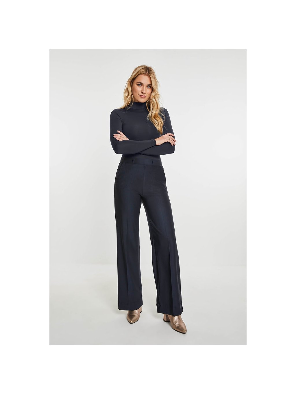 Kalhoty Mira z elastického keprového žerzeje mají vysoký pas, jsou volné kolem stehen a mají extra rozšířené nohavice.