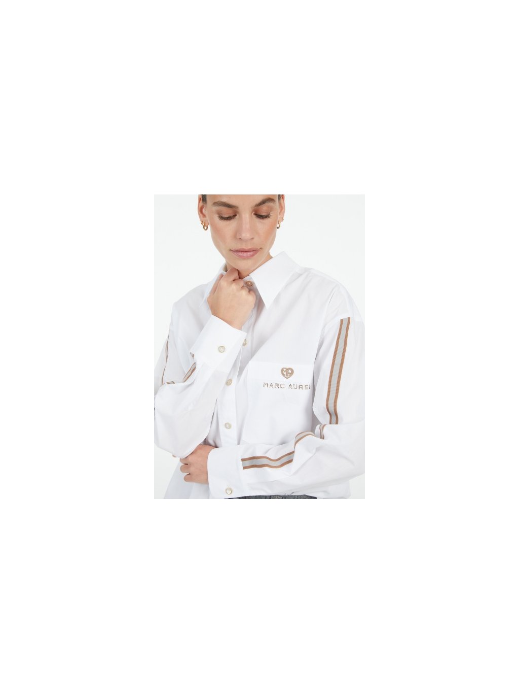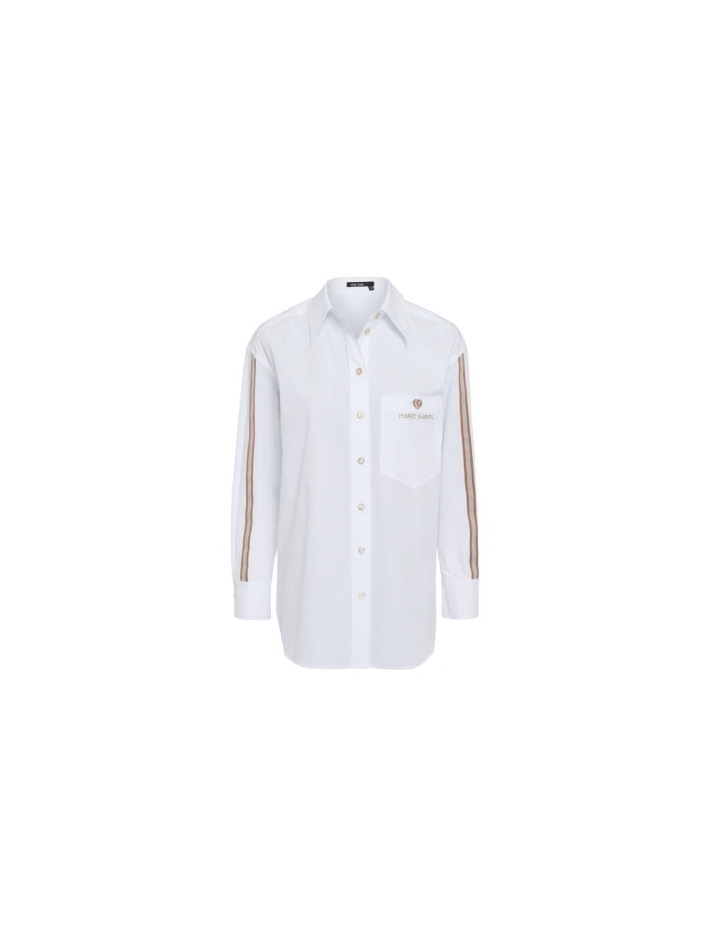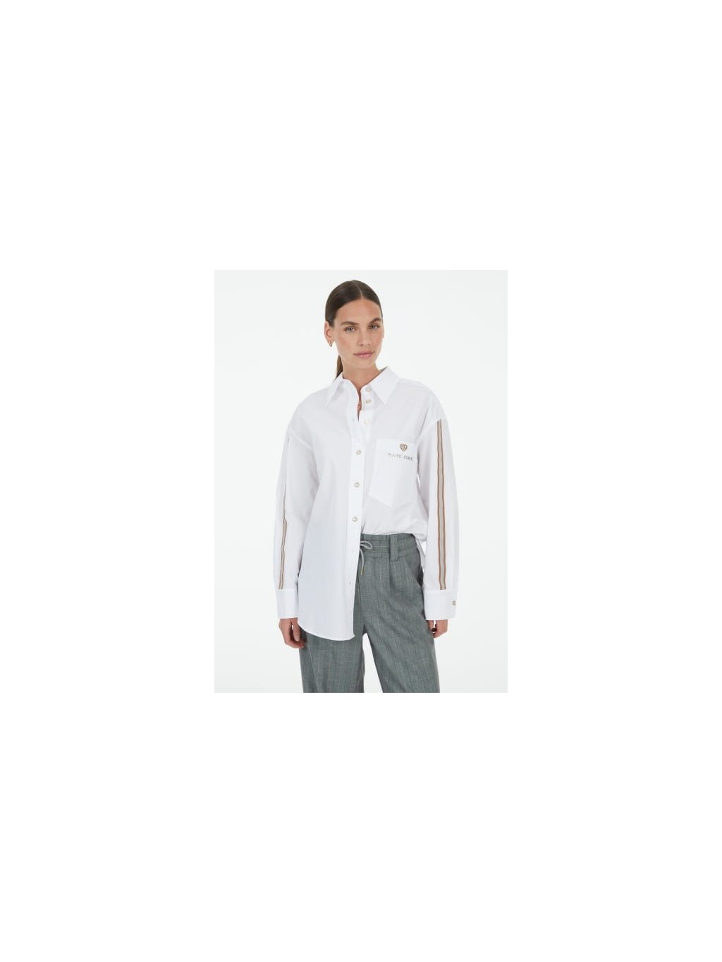 Tato dlouhá bavlněná popelínová košile se pyšní sofistikovaným vzhledem a propracovanými detaily. Jemná ozdobná stuha podél zapínání na knoflíky dodává košili stylový akcent, zatímco klasický košilový límec a náprsní kapsa dotvářejí design. Zadní sedlo s plisováním vytváří splývavou siluetu.
