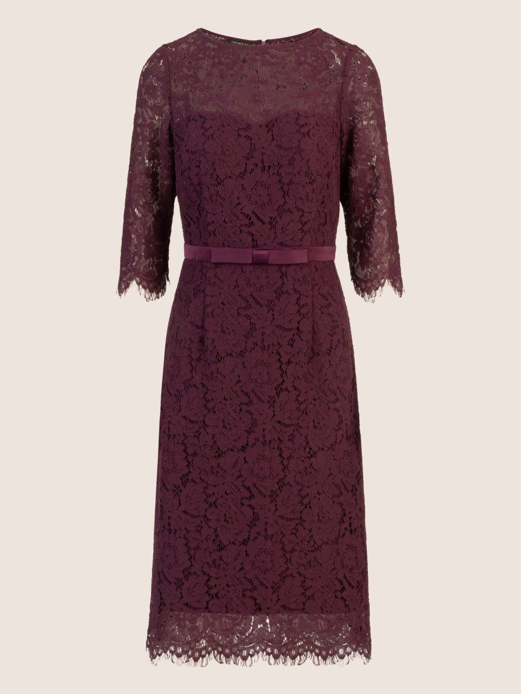 Tyto šaty, vyrobené z krajky v italské délce, okouzlují ženskou sofistikovaností. Kulatý výstřih z jemné krajky vpředu i vzadu a spodnička ve tvaru srdce vytvářejí romantický vzhled. Rukávy a lem v délce k loktům mají jemné vroubkované okraje. Úzký pas z lehce třpytivého materiálu, zdobený jemnou mašlí, dodává šatům stylový nádech. Úzká sukně zdůrazňuje ženskou siluetu. Šaty mají zadní zip a plně podšitý střih. Délka: cca 108 cm.