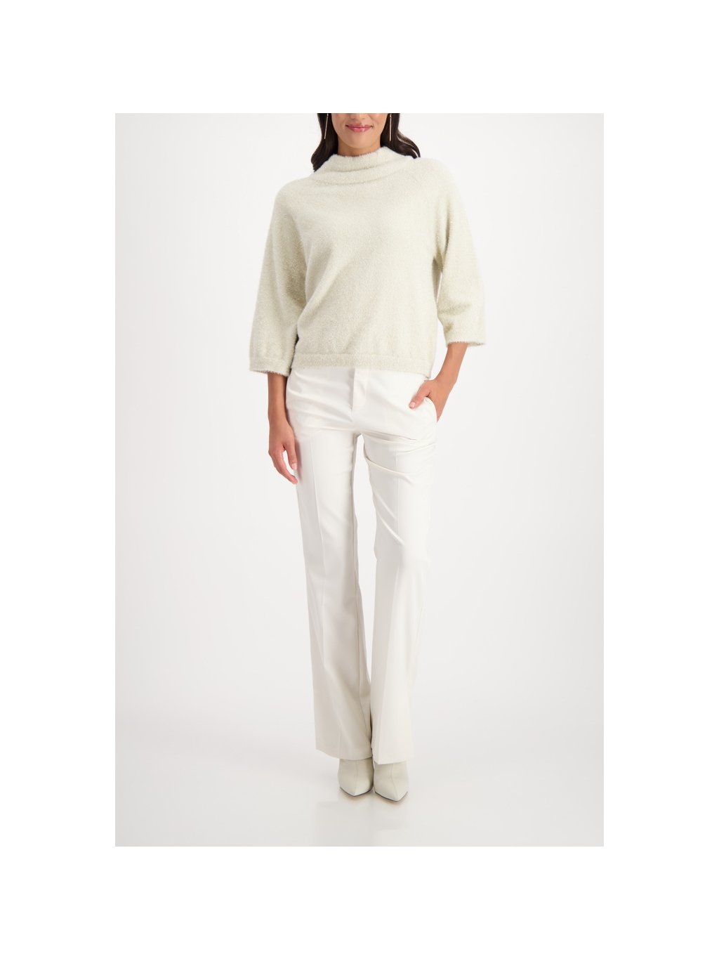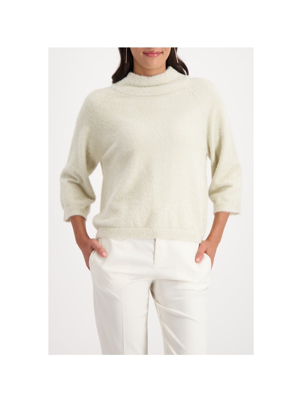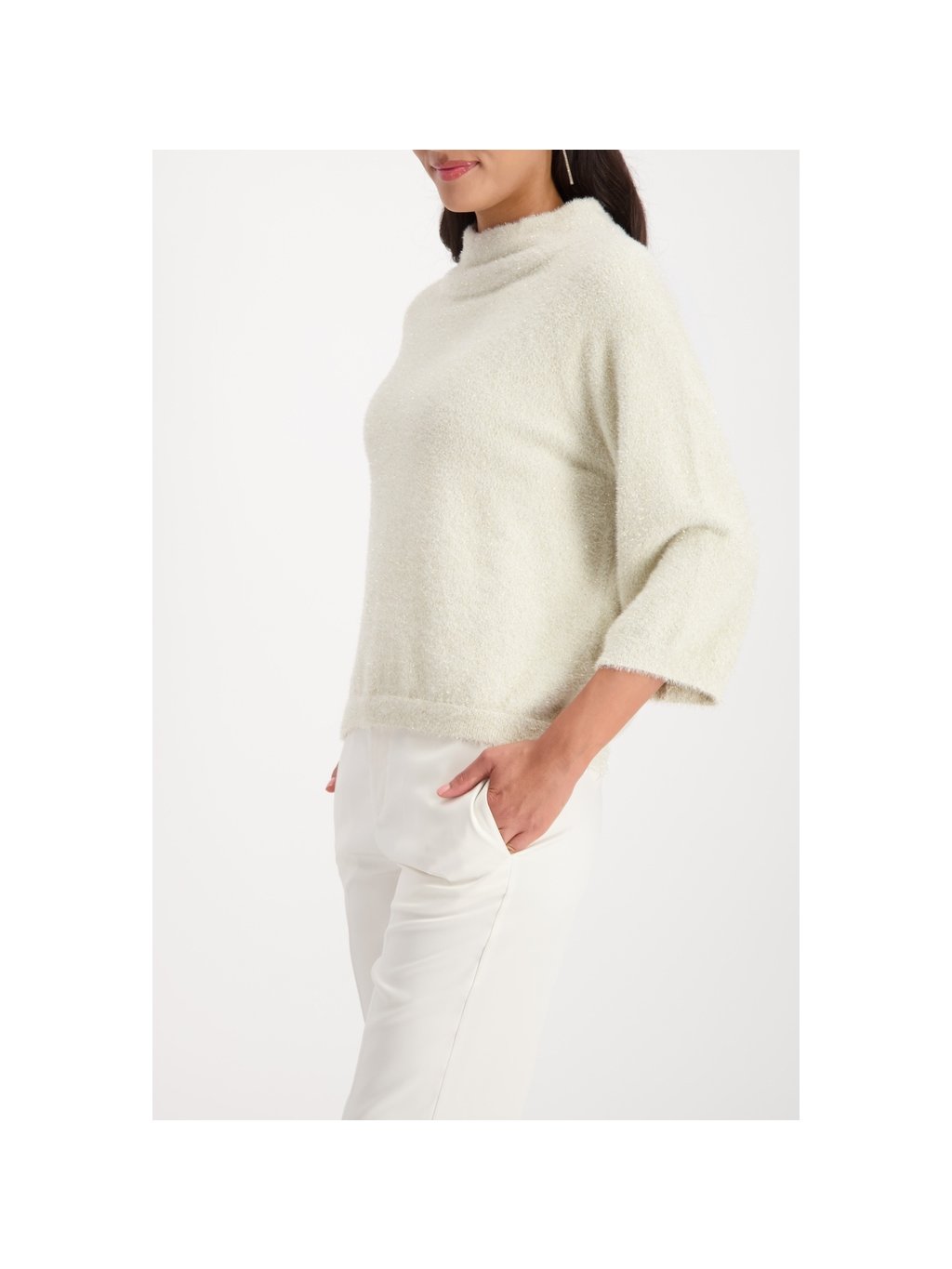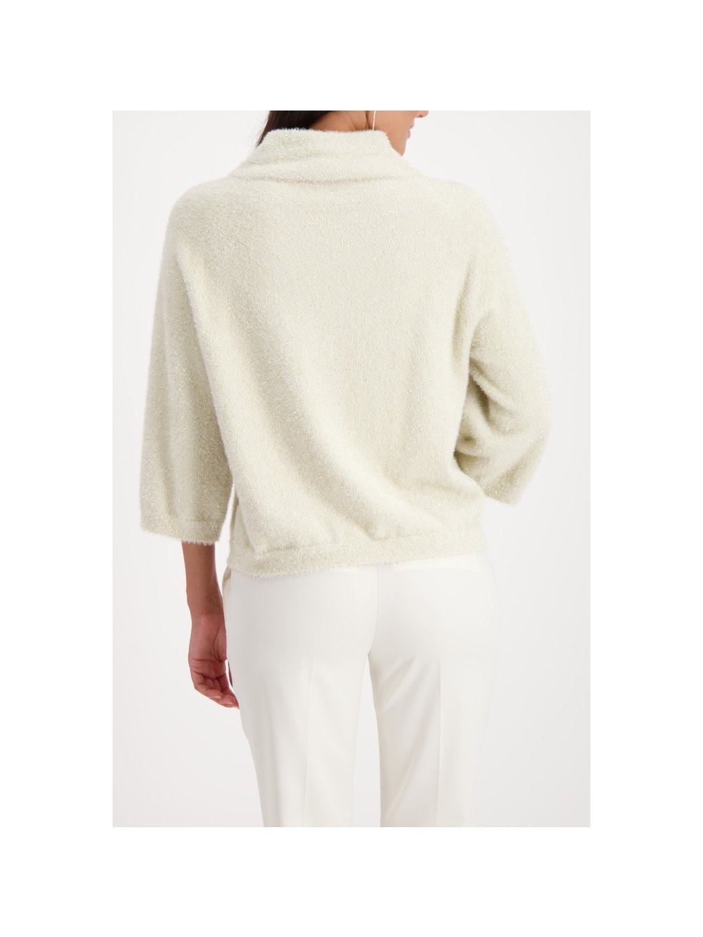 Nadýchaný svetr s lesklým lurexem a ¾ rukávy – stylový must-have pro moderní módní nadšence.