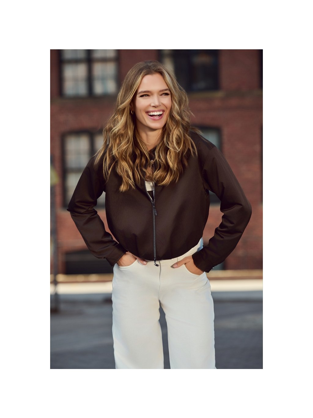 Stylová nylonová bunda se stojáčkem, řasením a elegantním zipem pro moderní akcenty.