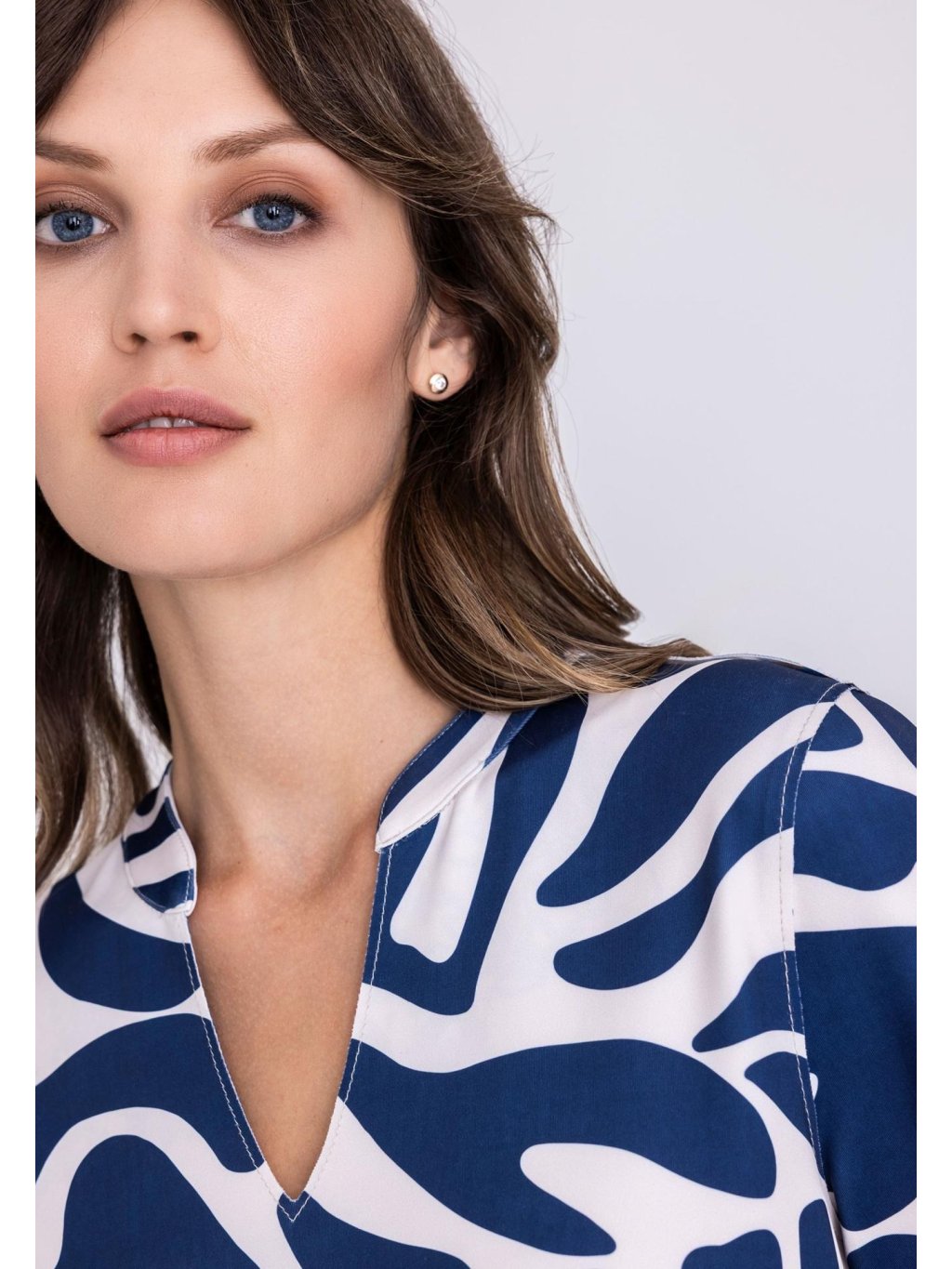 Oboustranné šaty s grafickým vzorem a krátkými rukávy, výstřihem do V s malým rozparkem.