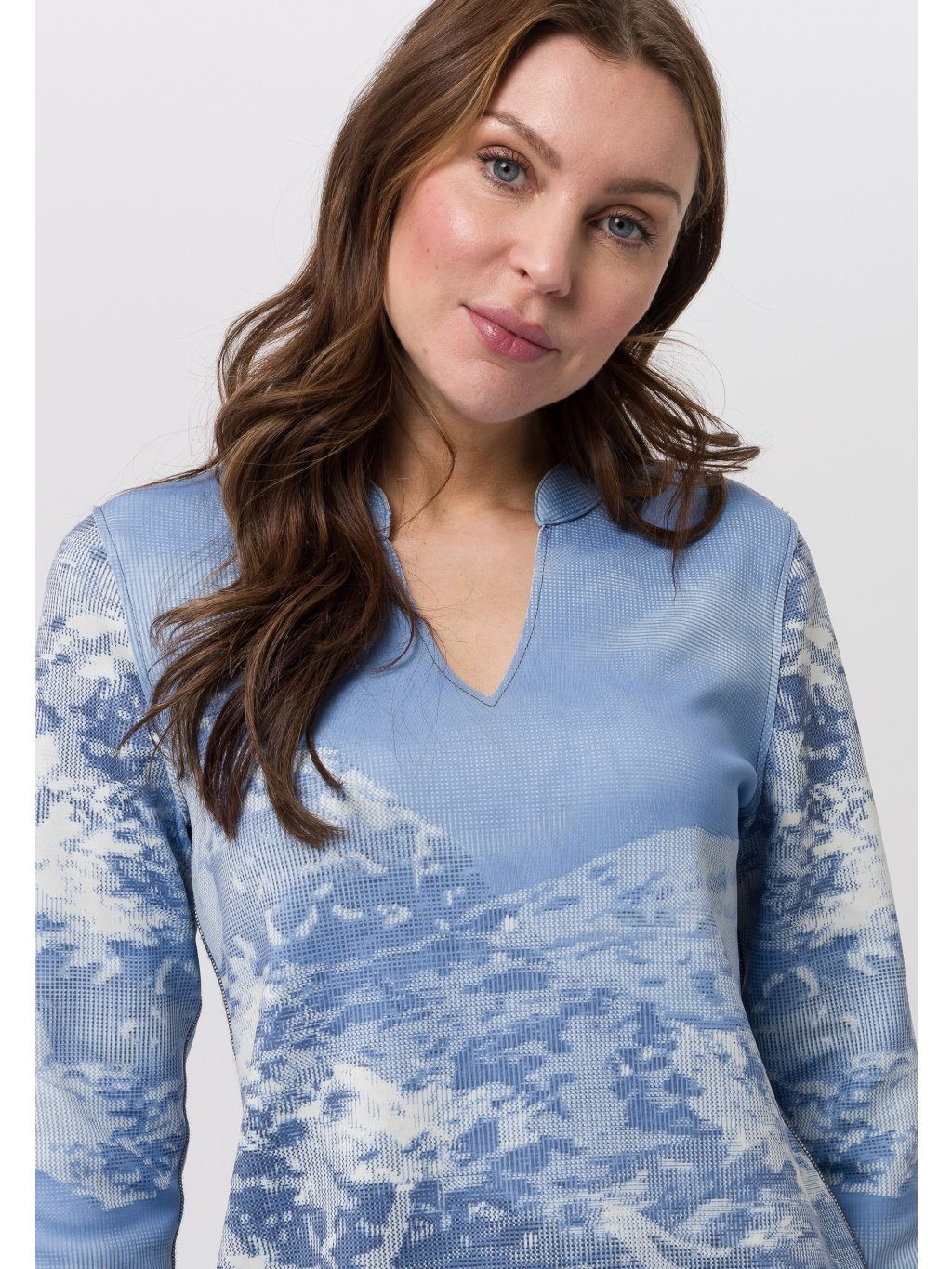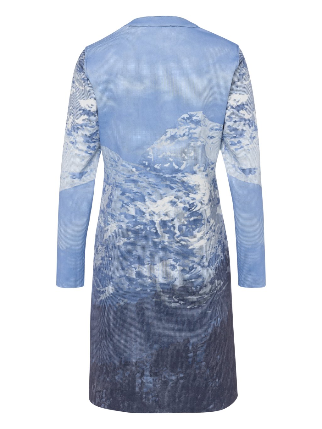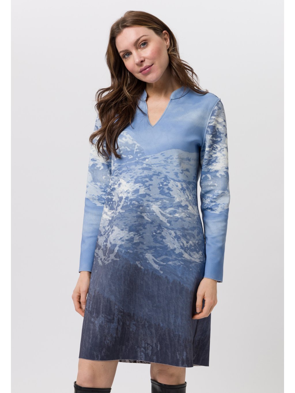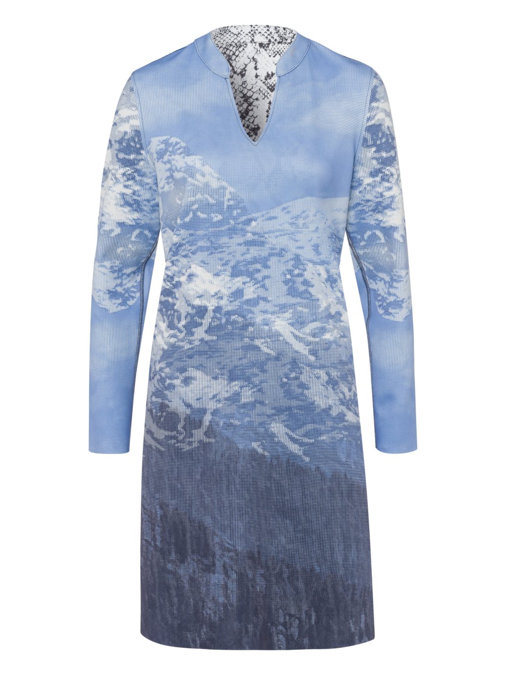 Tyto šaty mají vše, co potřebujete k tomu, abyste udělali dojem! Vzrušující celoplošný vzor s horským motivem doplněný pohodlnou strečovou tkaninou zajišťuje spolehlivě přiléhavý a nemačkavý střih. Výstřih do V je doplněn úzkým stojáčkem. Všestranně povedené šaty pro denní i večerní outfity
