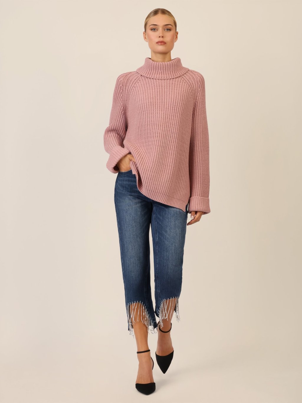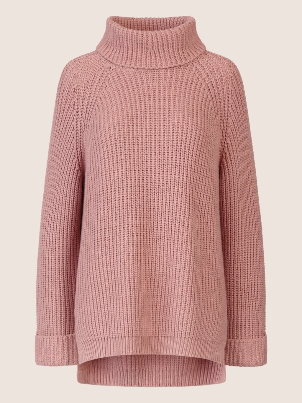 Útulné a luxusní! Tento oversize pletený svetr vyrobený z měkké směsi viskózy a kašmíru je perfektním módním kouskem pro stylové a příjemné chvíle. Široký kulatý výstřih je doplněn vysokým, velkorysým rolákem – super měkkým a super trendy. Dlouhé raglánové rukávy s krásnými plnými detaily a širokým ohrnutím dodávají outfitu módní ležérnost. Rovný, mírně zkrácený přední díl ladí s prodlouženými zády a hlubokými bočními rozparky – moderní verze klasického úpletu. Délka zad je přibližně 74 cm a je pletený trendy položebrovým stehem – tento svetr je vaší nezbytností pro pohodové dny se zaručeným stylem!