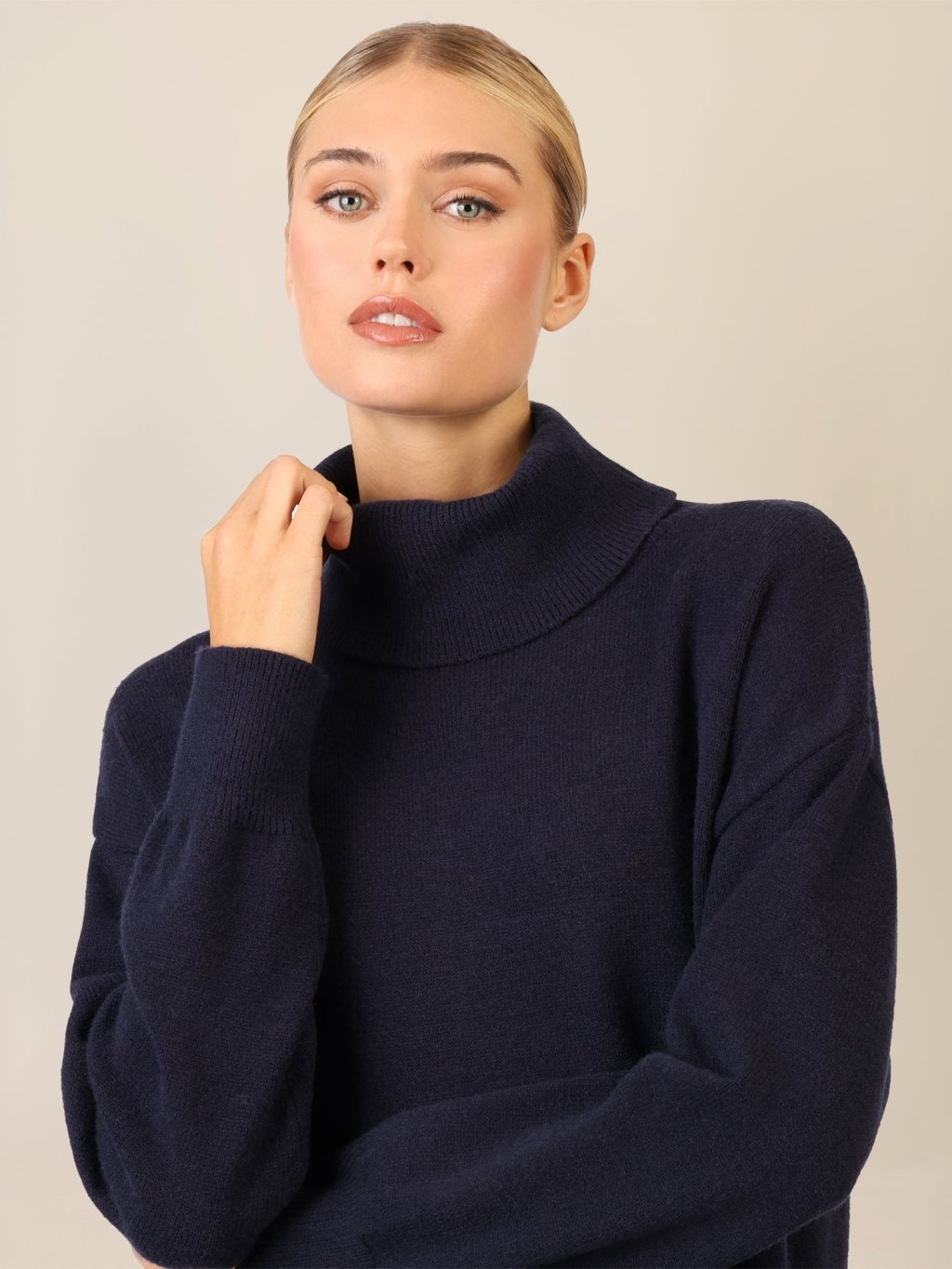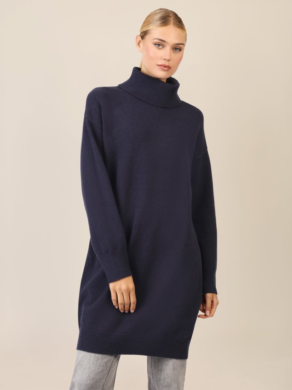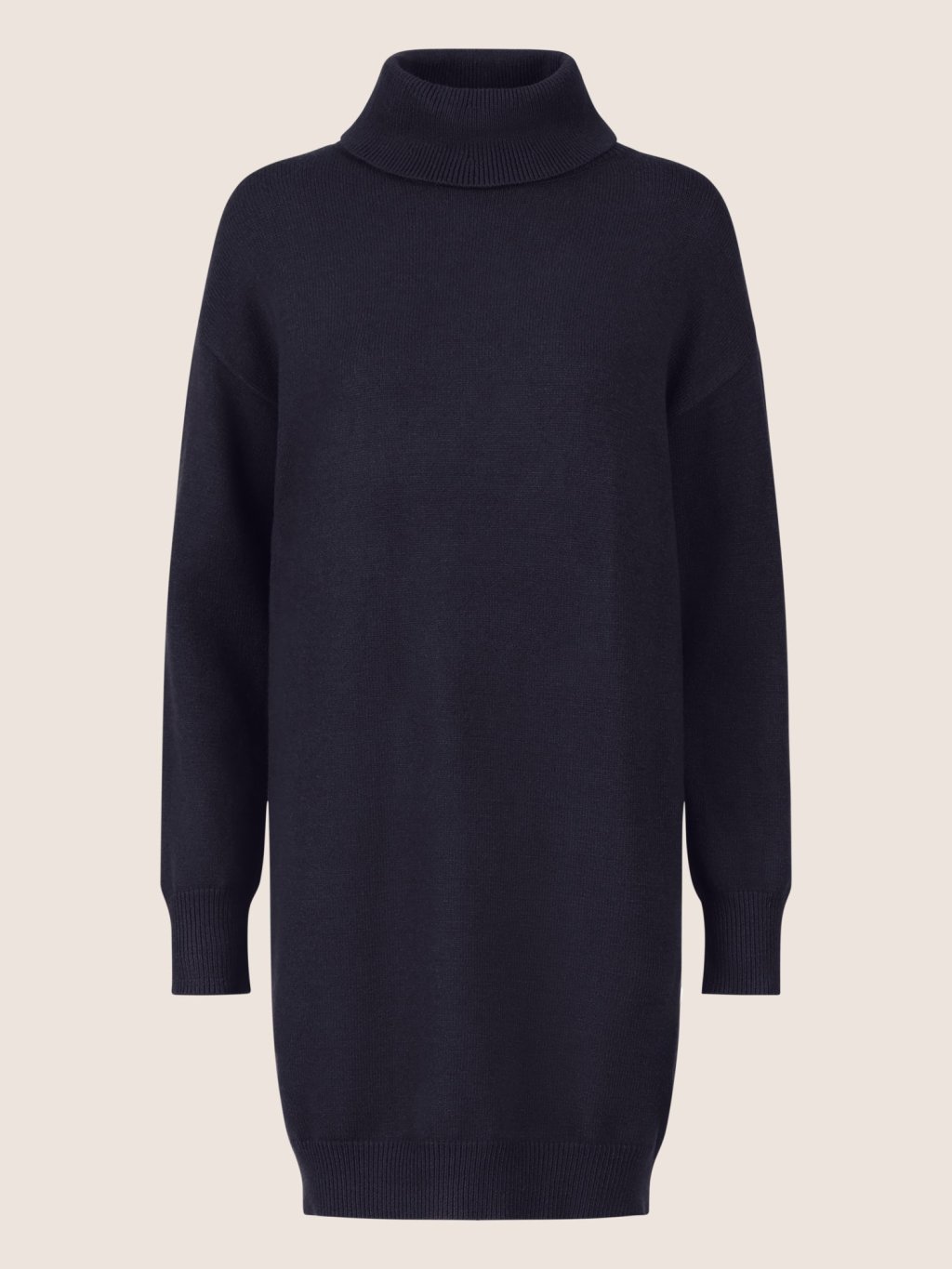Tyto krátké pletené šaty se pyšní ležérním, oversized vzhledem – ideální pro pohodové módní chvíle. Vysoce kvalitní, měkká směs viskózy a kašmíru zajišťuje hladký, příjemný pocit, zatímco velký žebrovaný rolák dodává komfort. Se spuštěnými rameny a širokými rukávy jsou ideálním kouskem pro chladné dny. Rovná, ležérní silueta je doplněna žebrovanými manžetami na lemu a rukávech. Délka: cca 94 cm.
