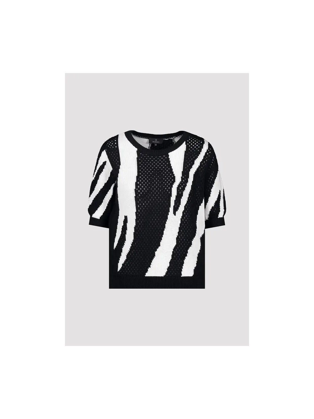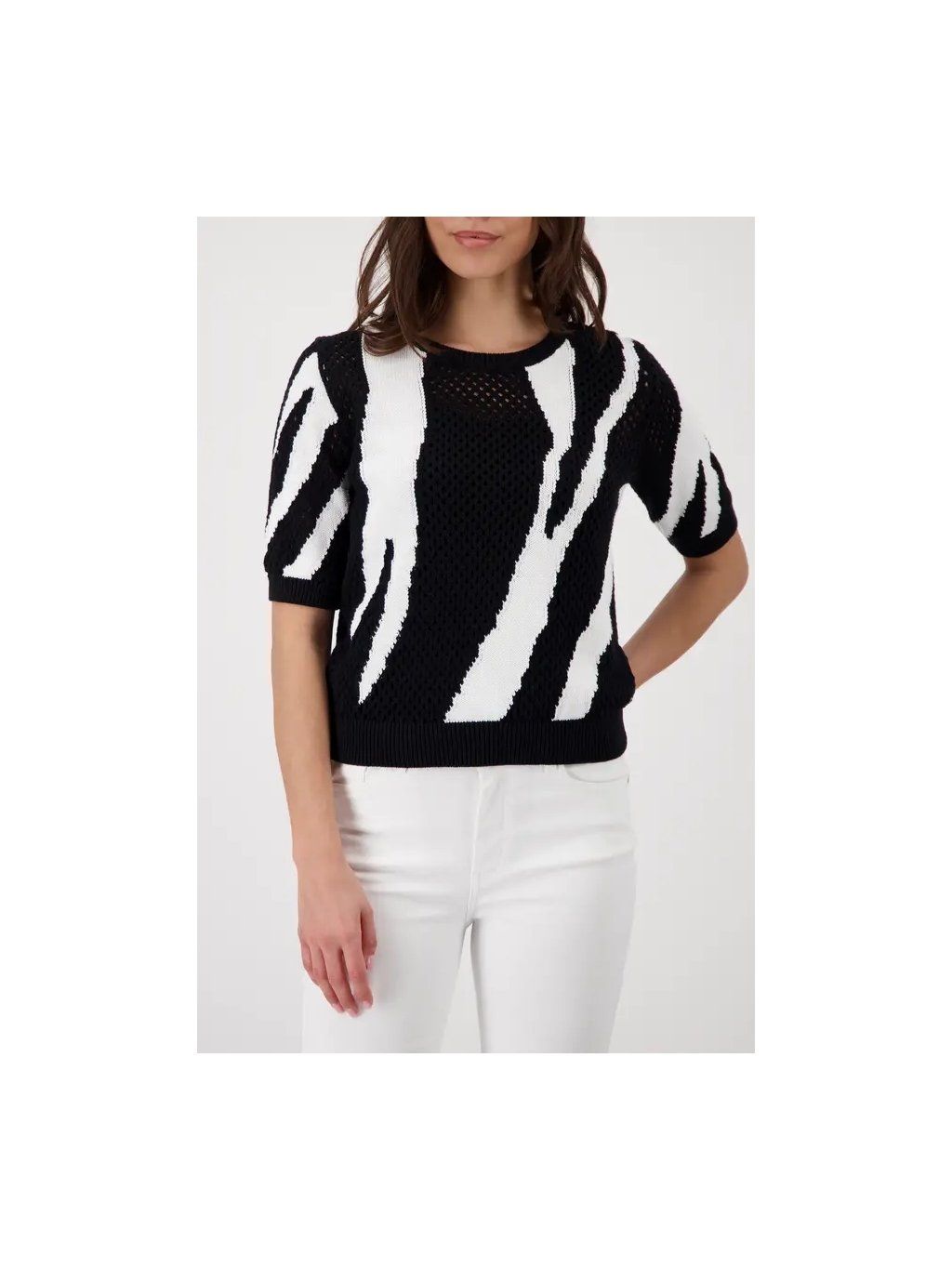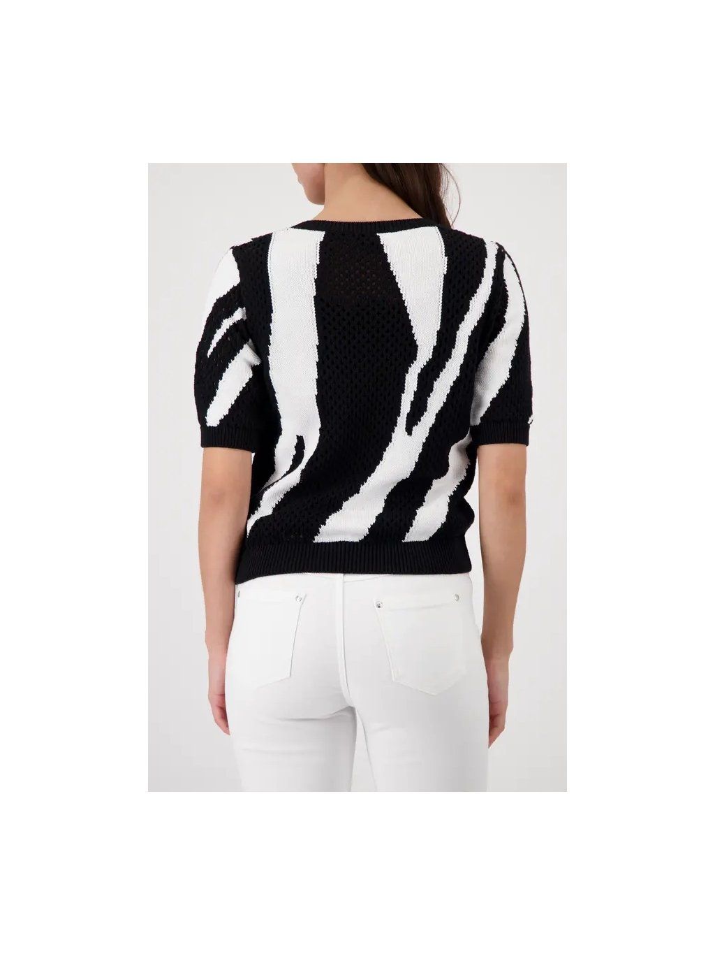 Elegantní pletený svetr z AJOUR ze 100% bavlny, zdobený fascinujícím tygřím intarzním vzorem, v moderním regular střihu s kulatým výstřihem.