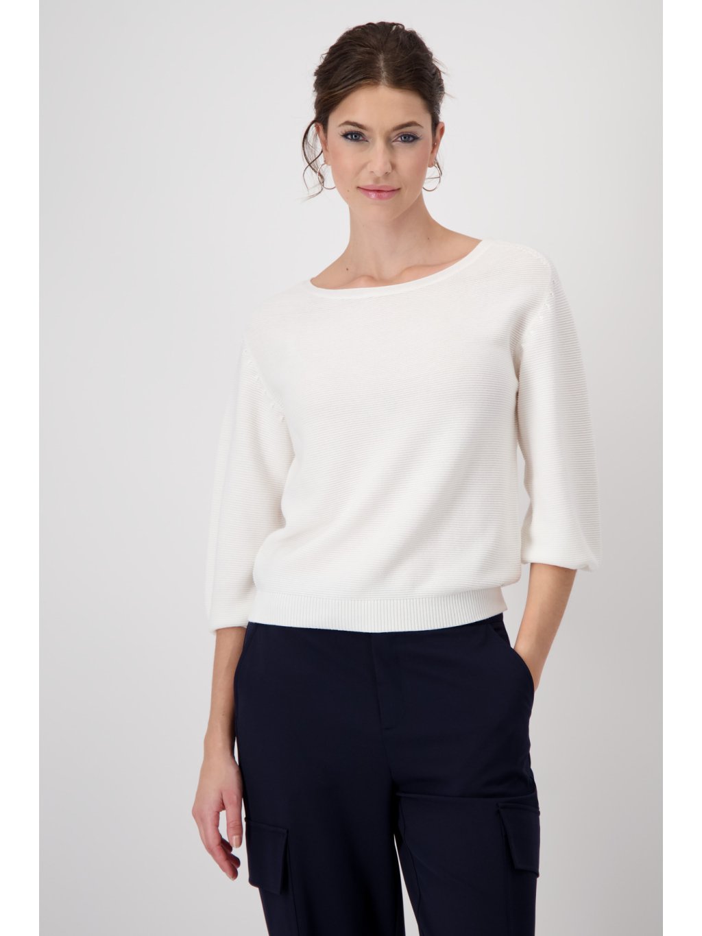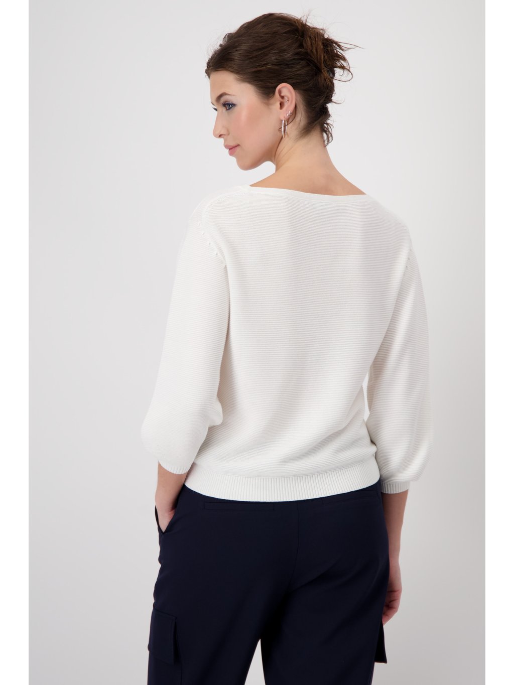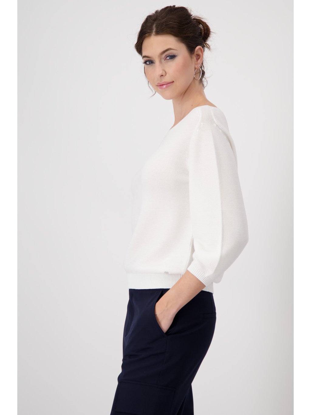 Tento pletený svetr ze 100% bavlny zaujme svým úpletovým lemem a výstřihem. Se ¾ rukávy a žebrovanými manžetami a lemem jde o nadčasovou klasiku.