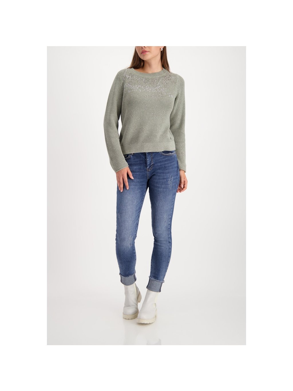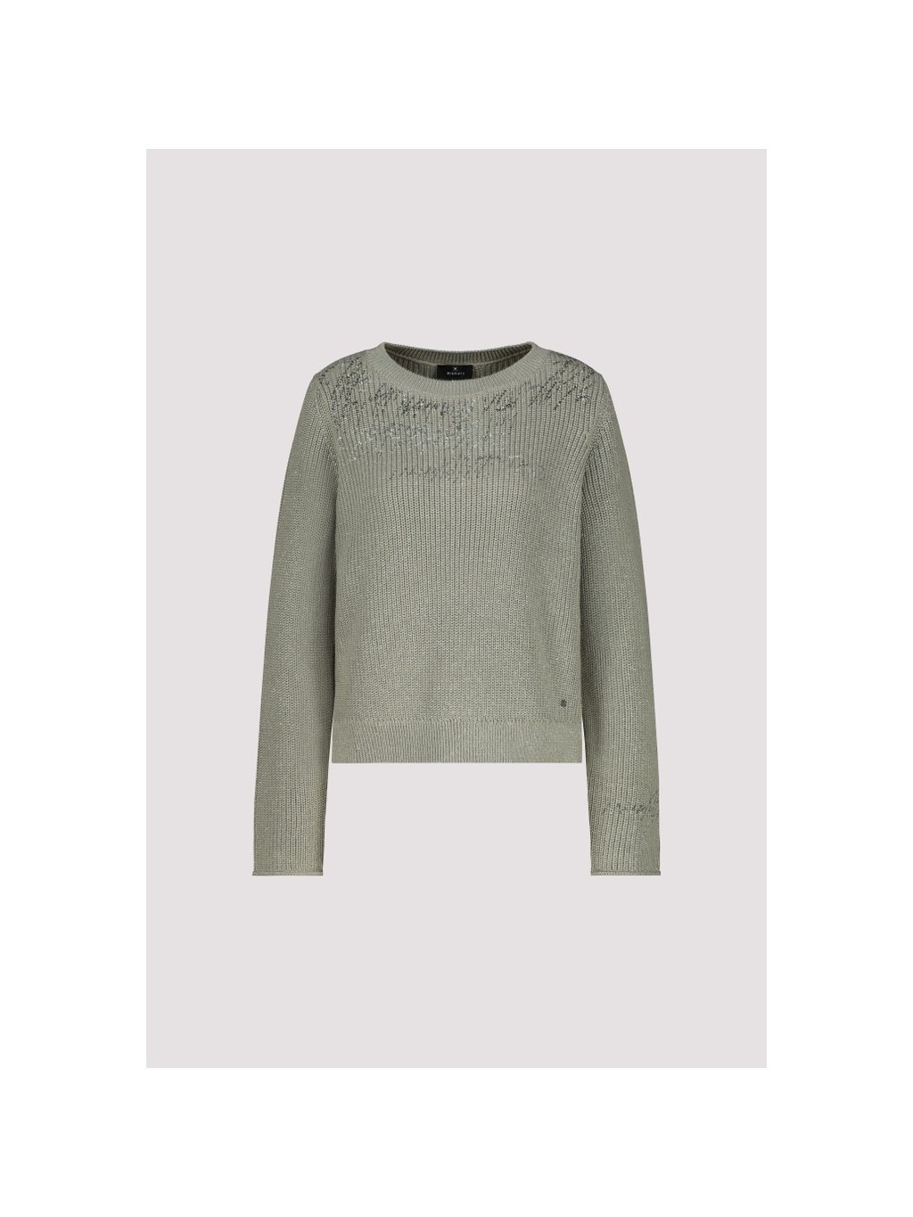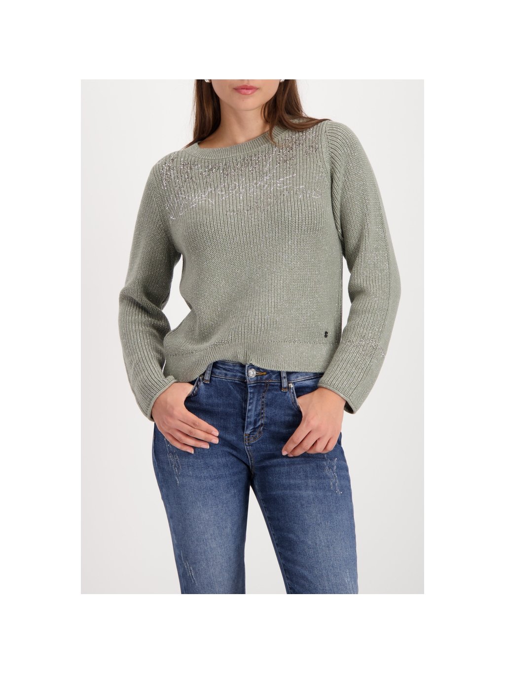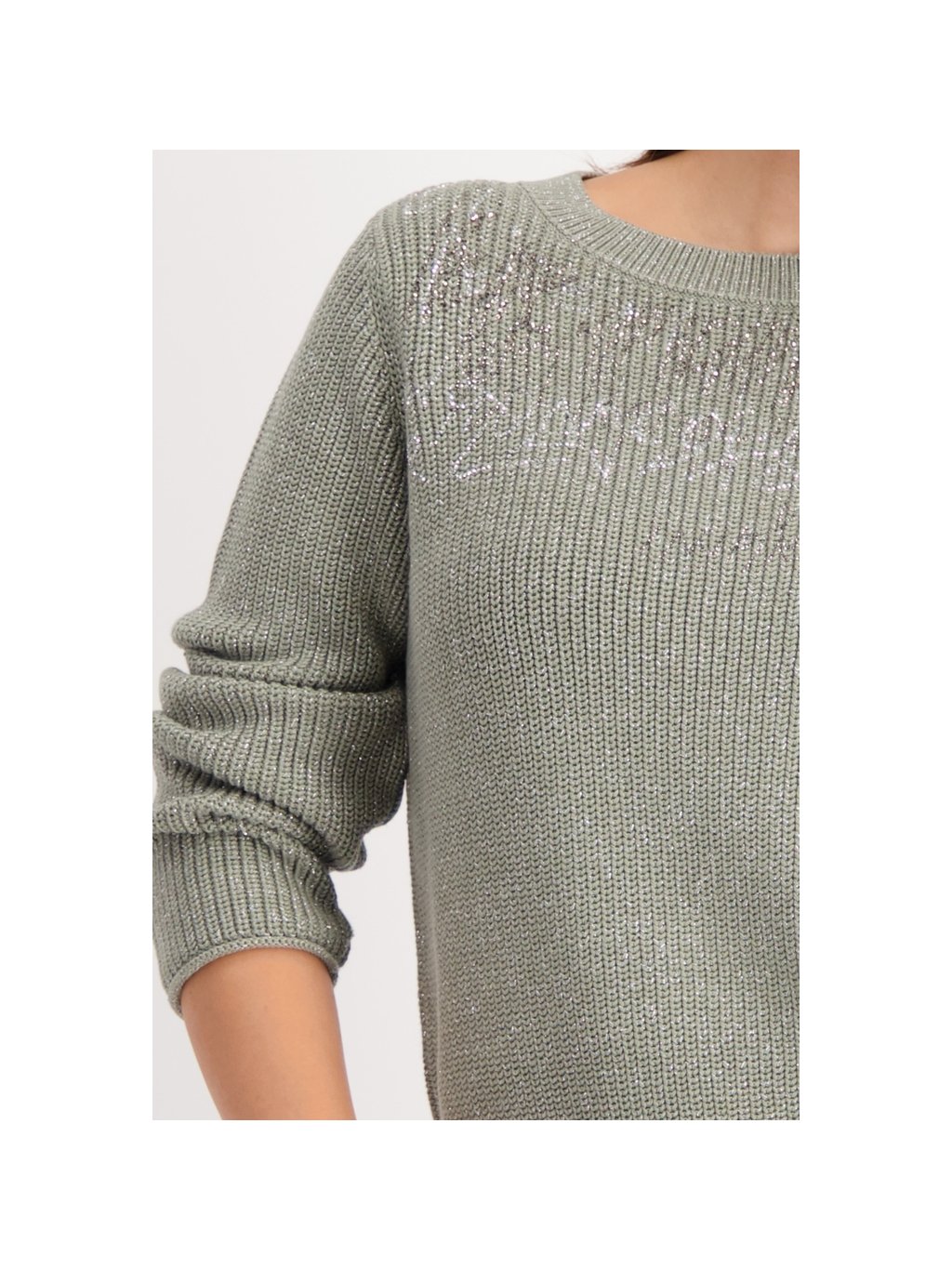 Elegantní pletený svetr vyrobený z vysoce kvalitní bavlněné směsi, zdobený lesklým lurexem, kamínky a stylovým nápisovým vzorem.
