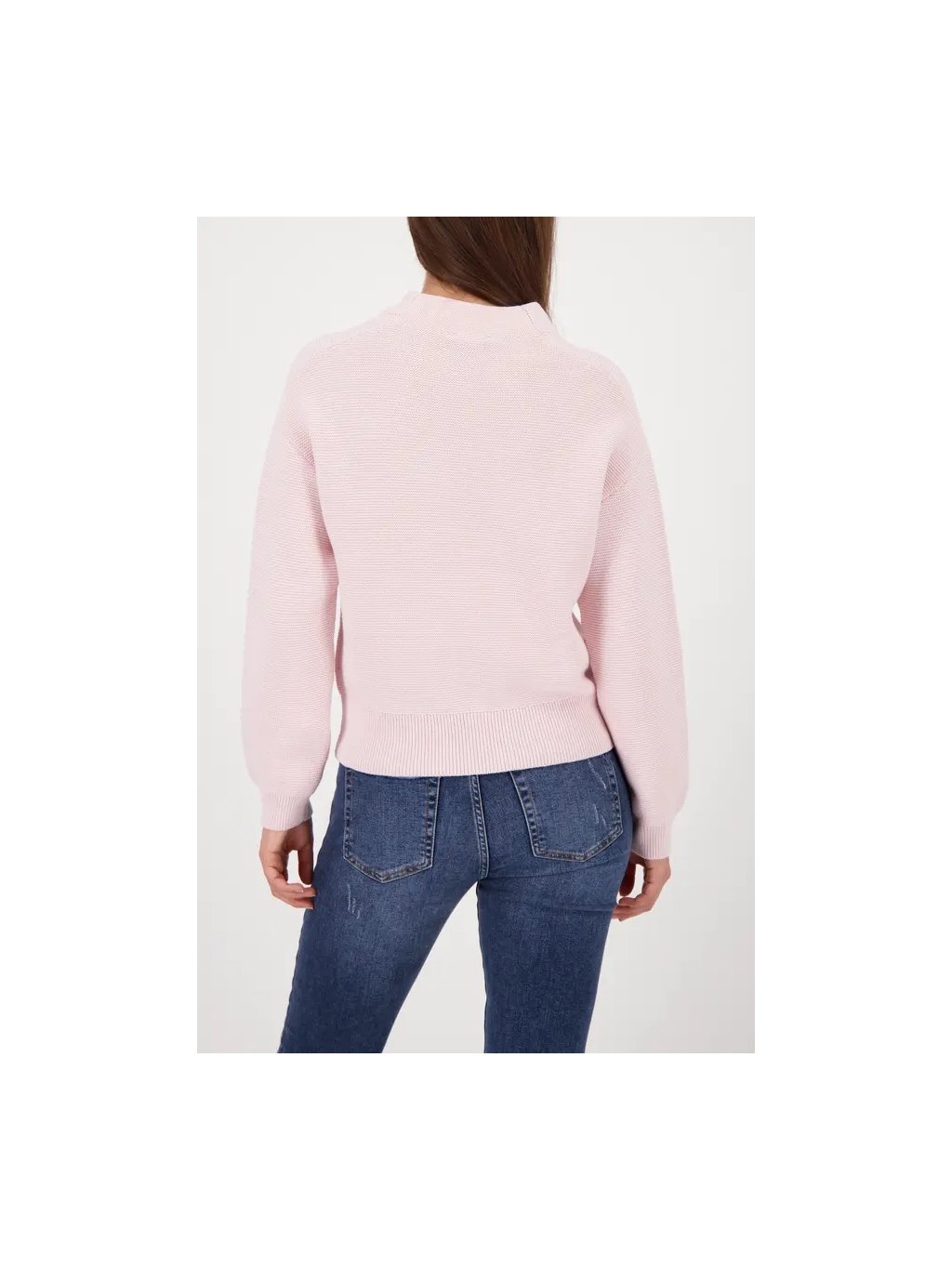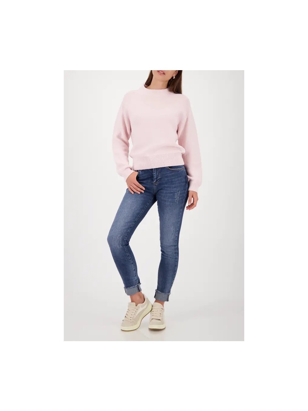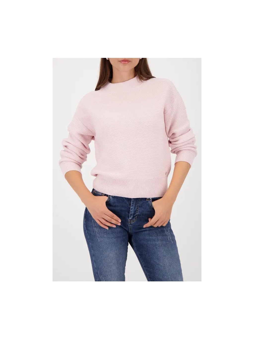 Tento stylový základní pletený svetr vyrobený z vysoce kvalitní bavlněné směsi se stojáčkem a žebrovanými lemy ztělesňuje nadčasovou eleganci a moderní pohodlí.