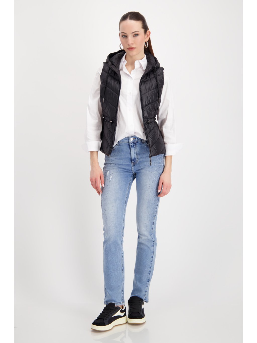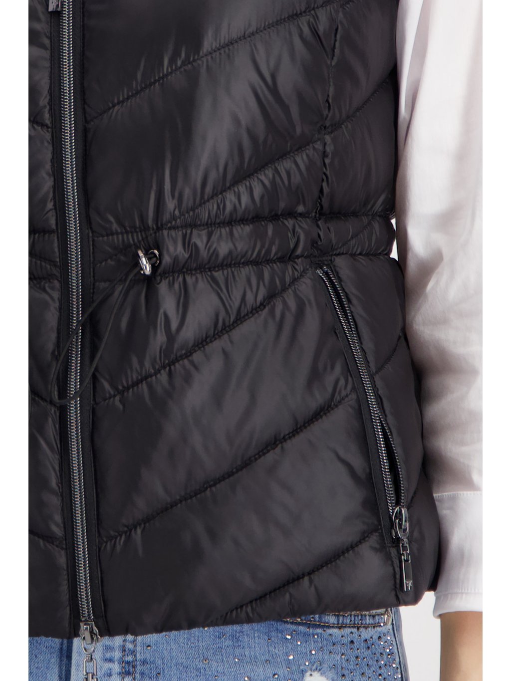 Prošívaná vesta má zeštíhlující střih. Je vyrobena z lehkého materiálu. Vesta se přizpůsobí vaší postavě díky nastavitelné šňůrce v pase.