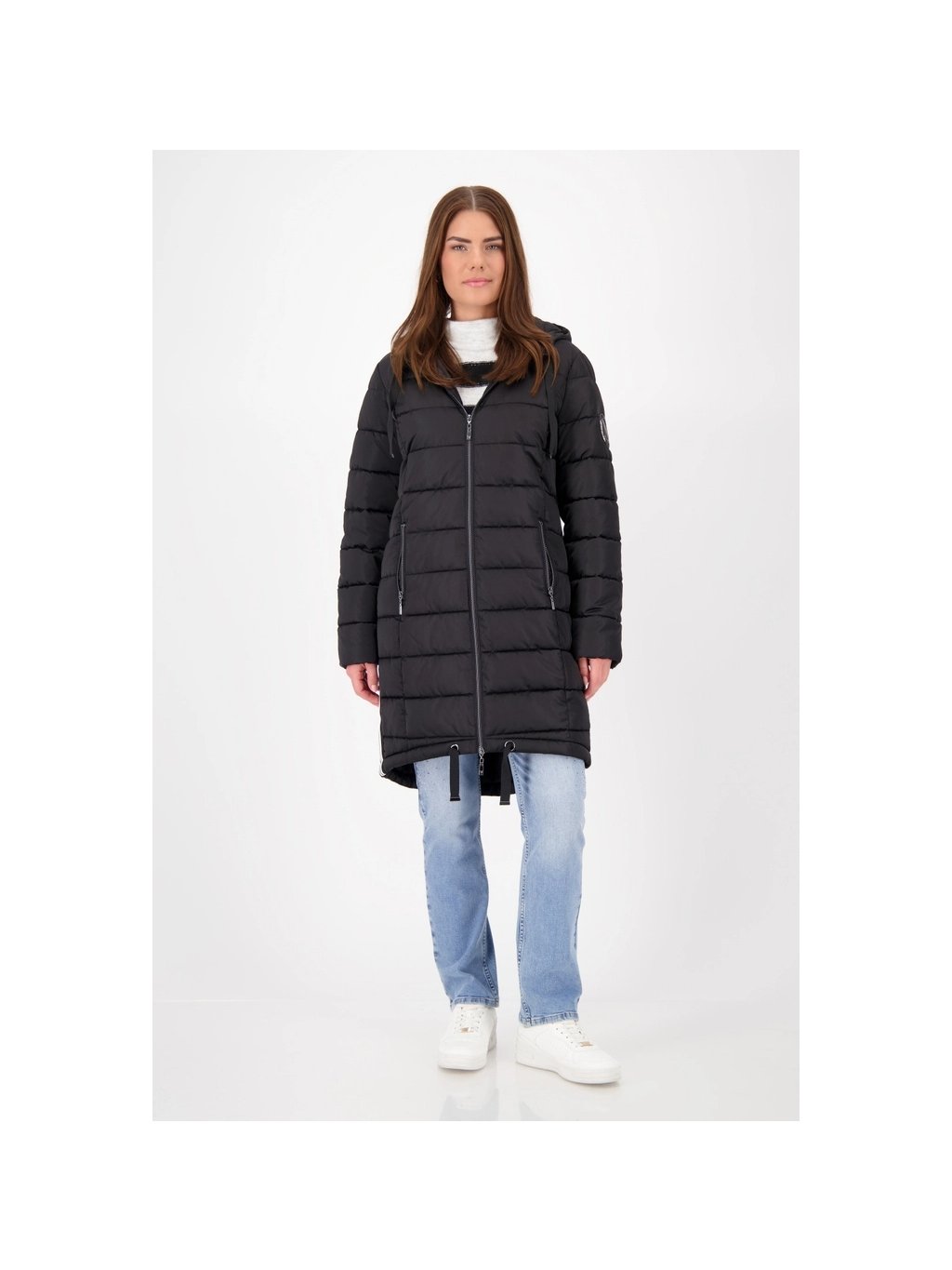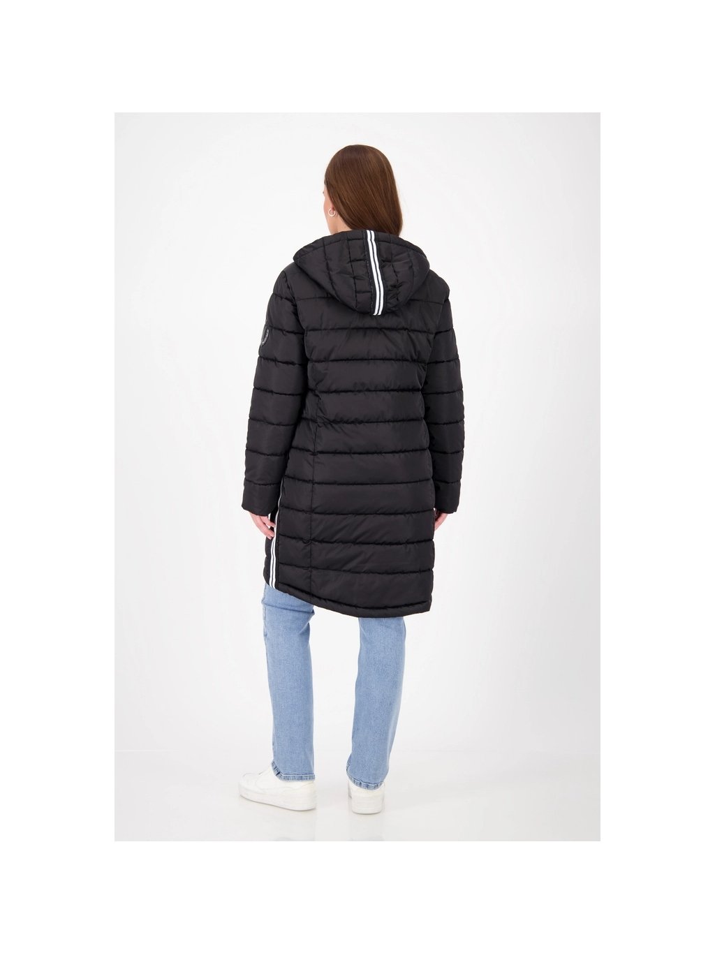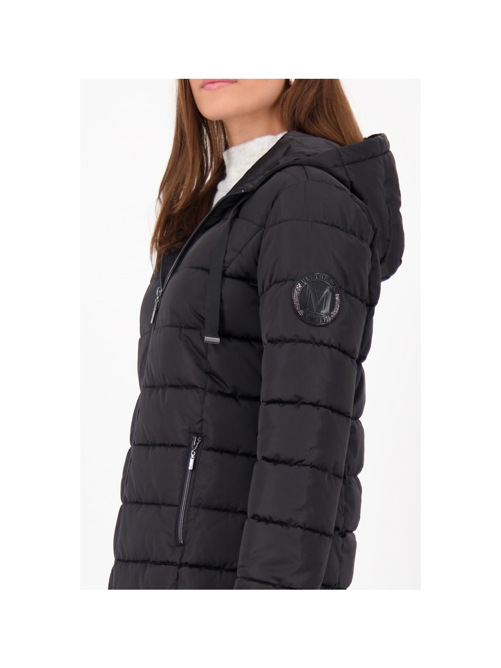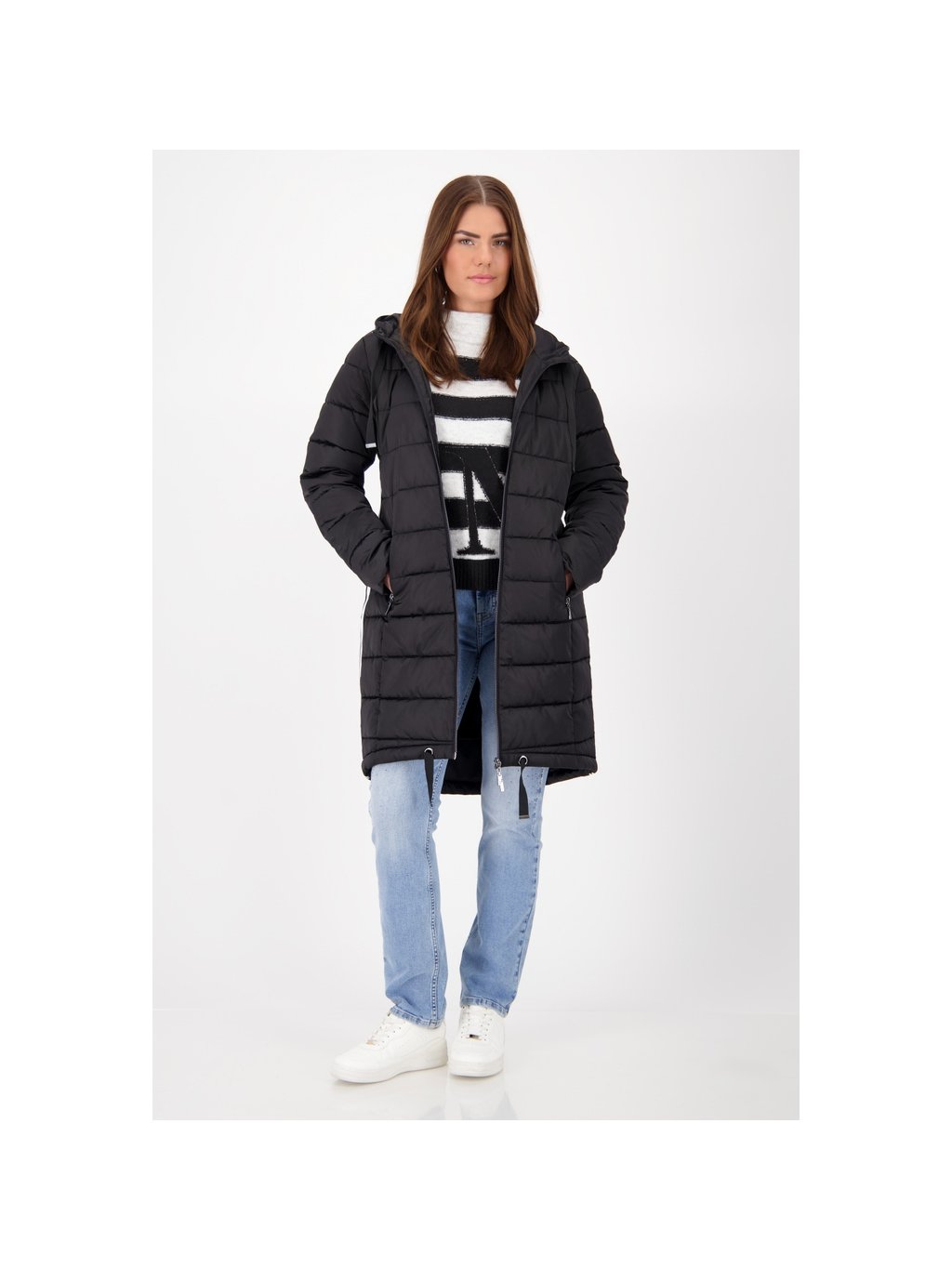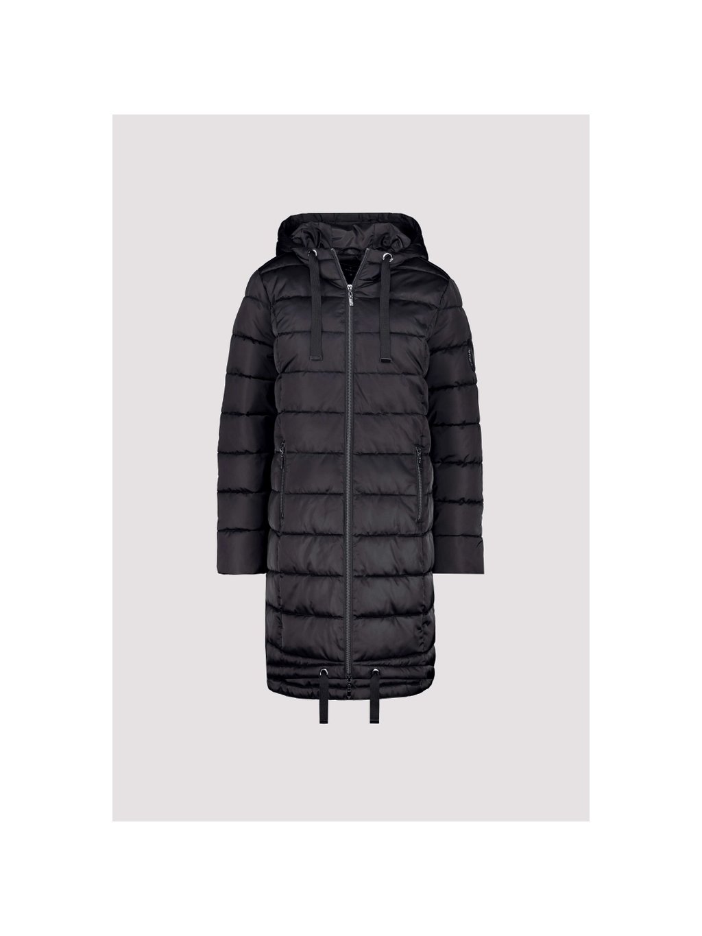 Tento moderní prošívaný kabát kombinuje pohodlí se stylem. Lesklé lurexové pruhy dodávají kabátu módní akcenty, zatímco kapuce s vázáním vpředu a prodloužená záda poskytují pohodlí a teplo. Běžný střih zajišťuje pohodlné a nadčasové nošení.