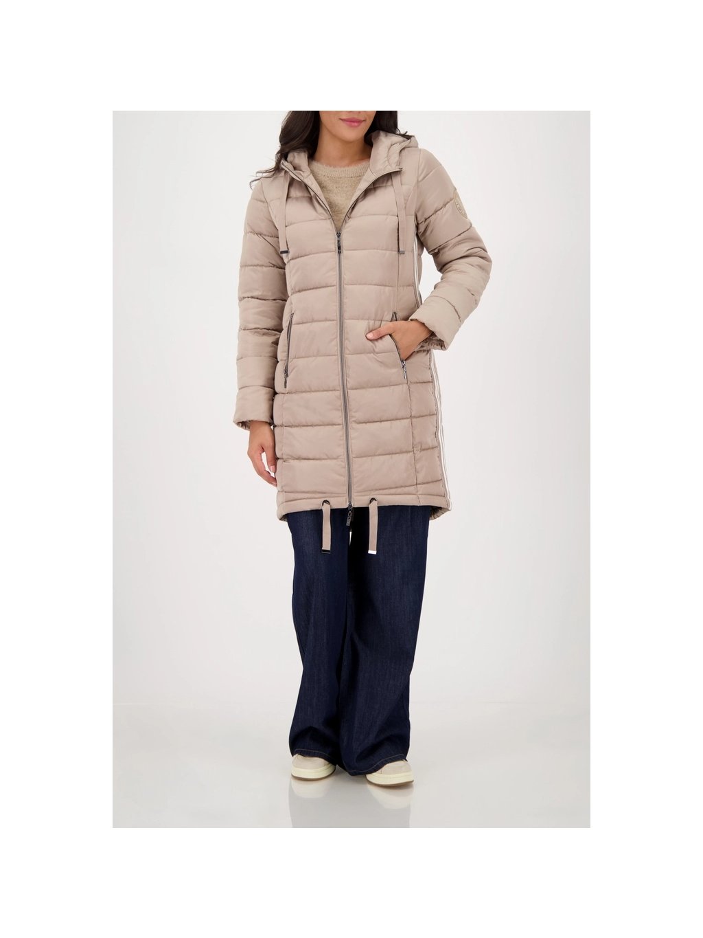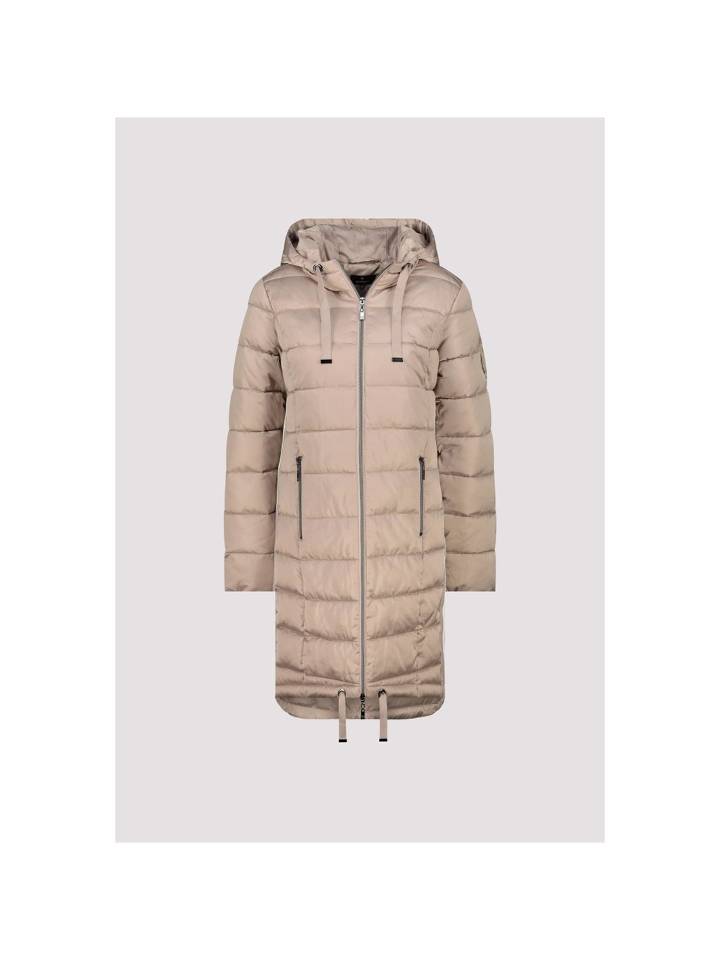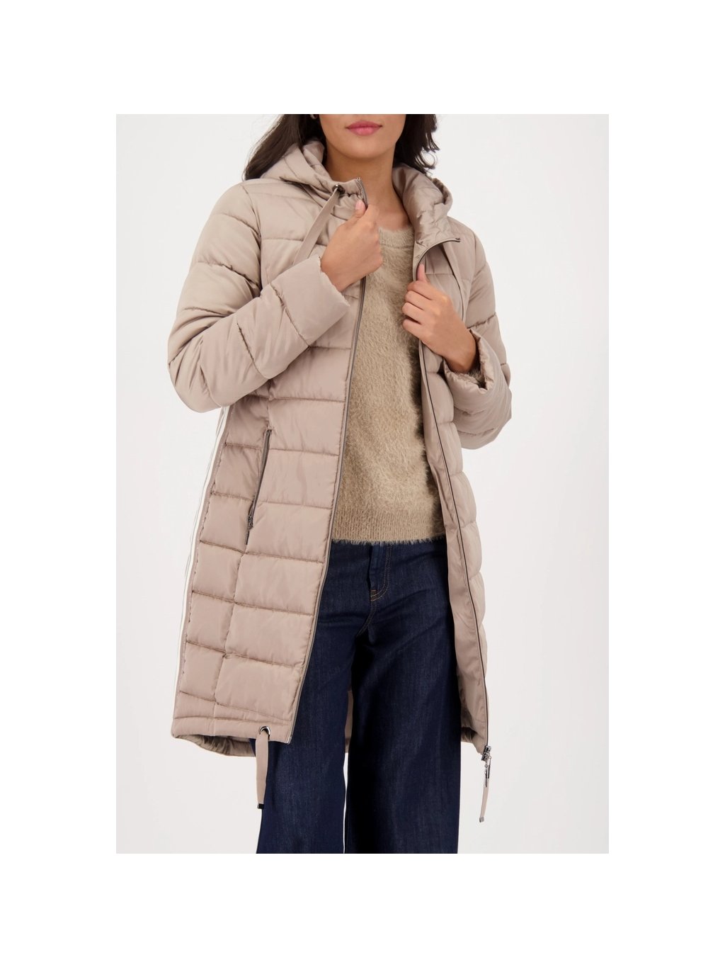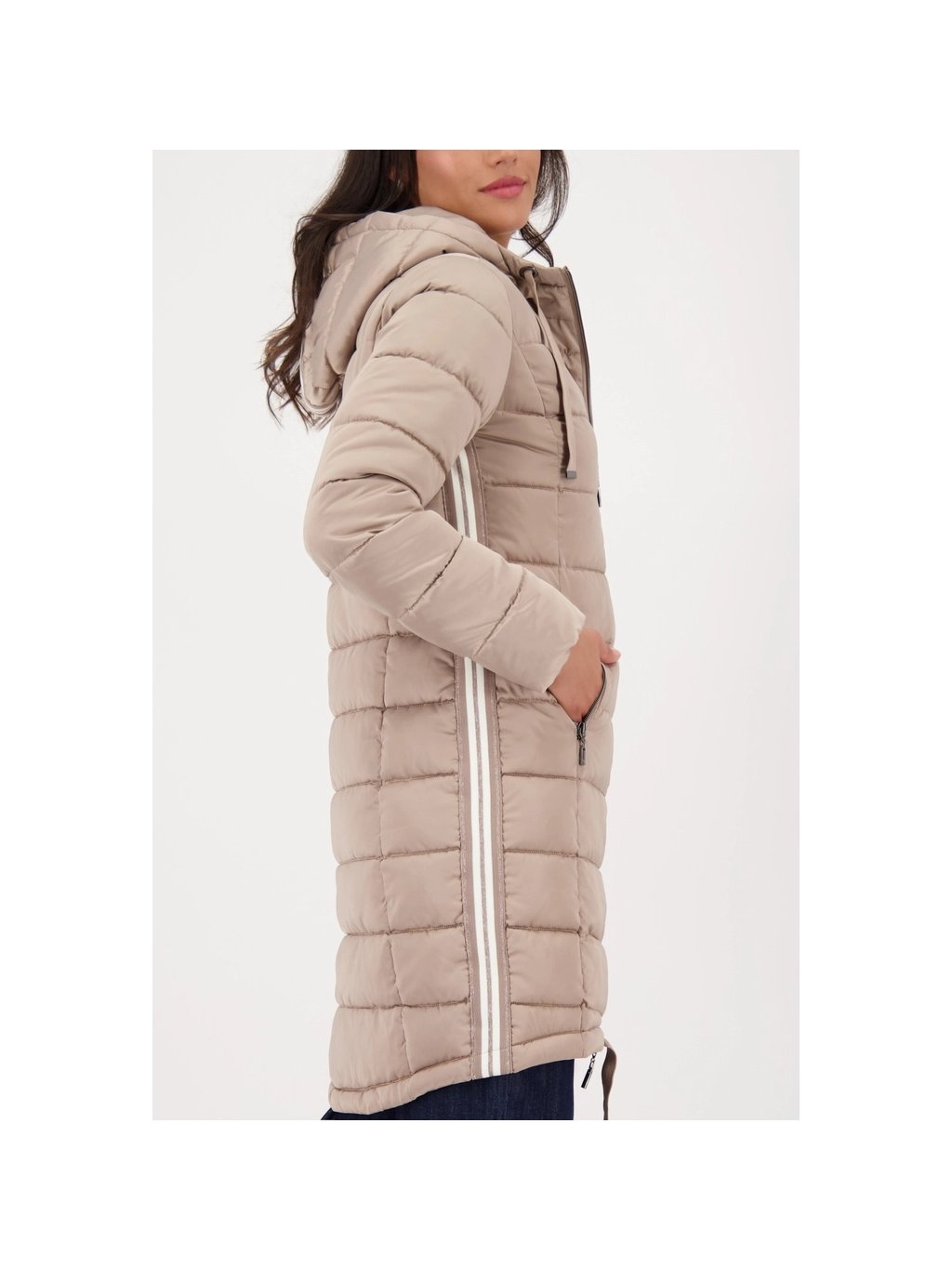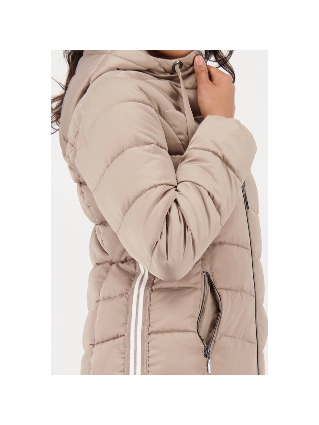 Tento moderní prošívaný kabát kombinuje pohodlí se stylem. Lesklé lurexové pruhy dodávají kabátu módní akcenty, zatímco kapuce s vázáním vpředu a prodloužená záda poskytují dodatečné krytí. Běžný střih zajišťuje pohodlné a nadčasové nošení.