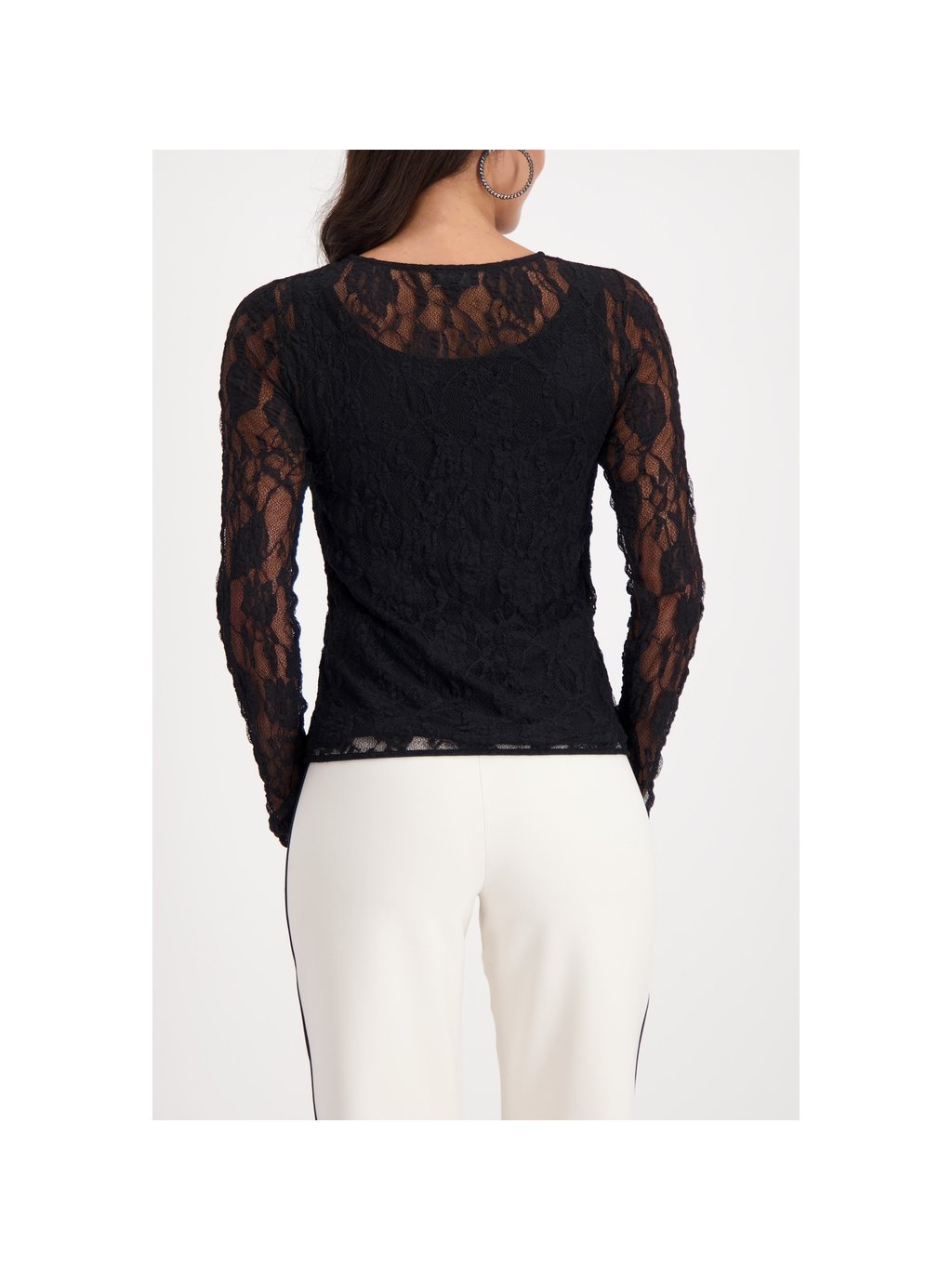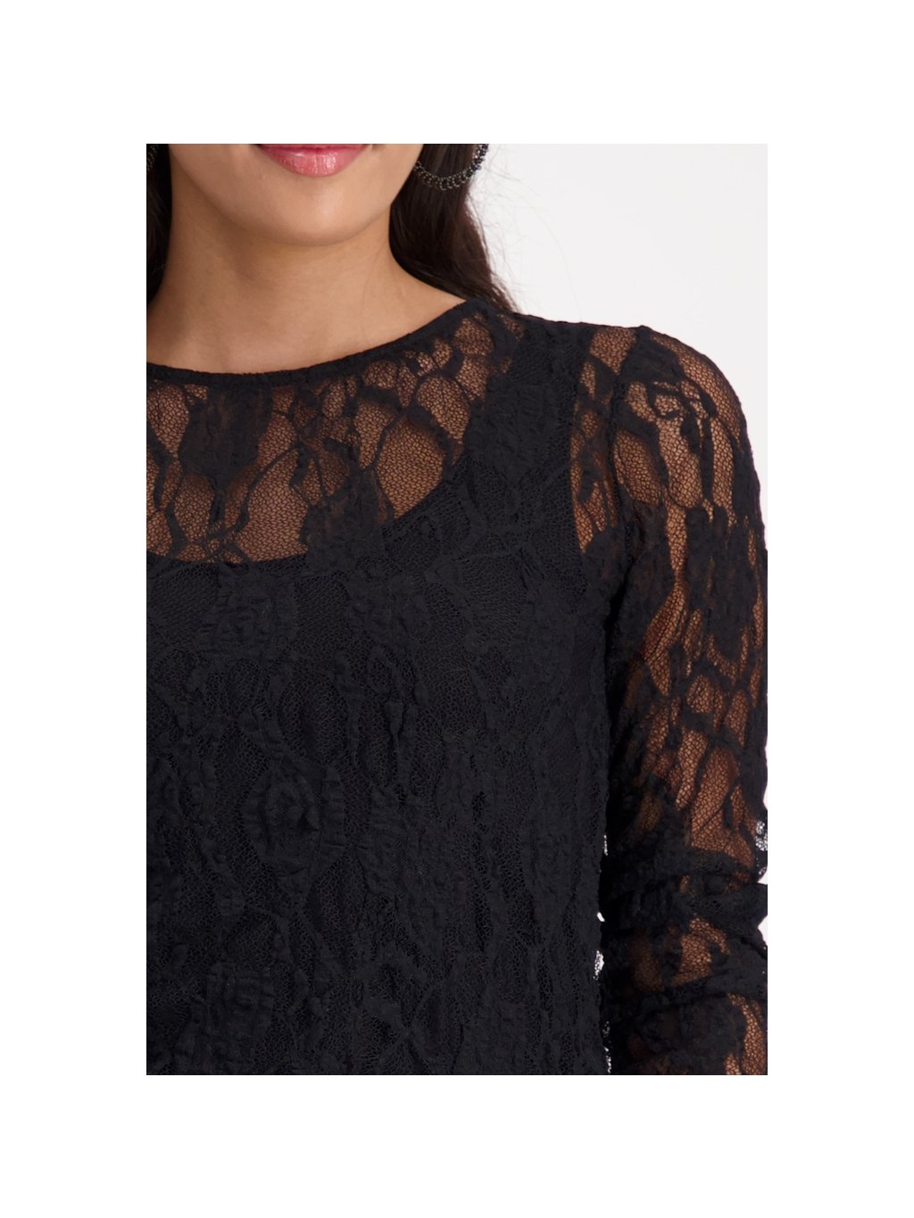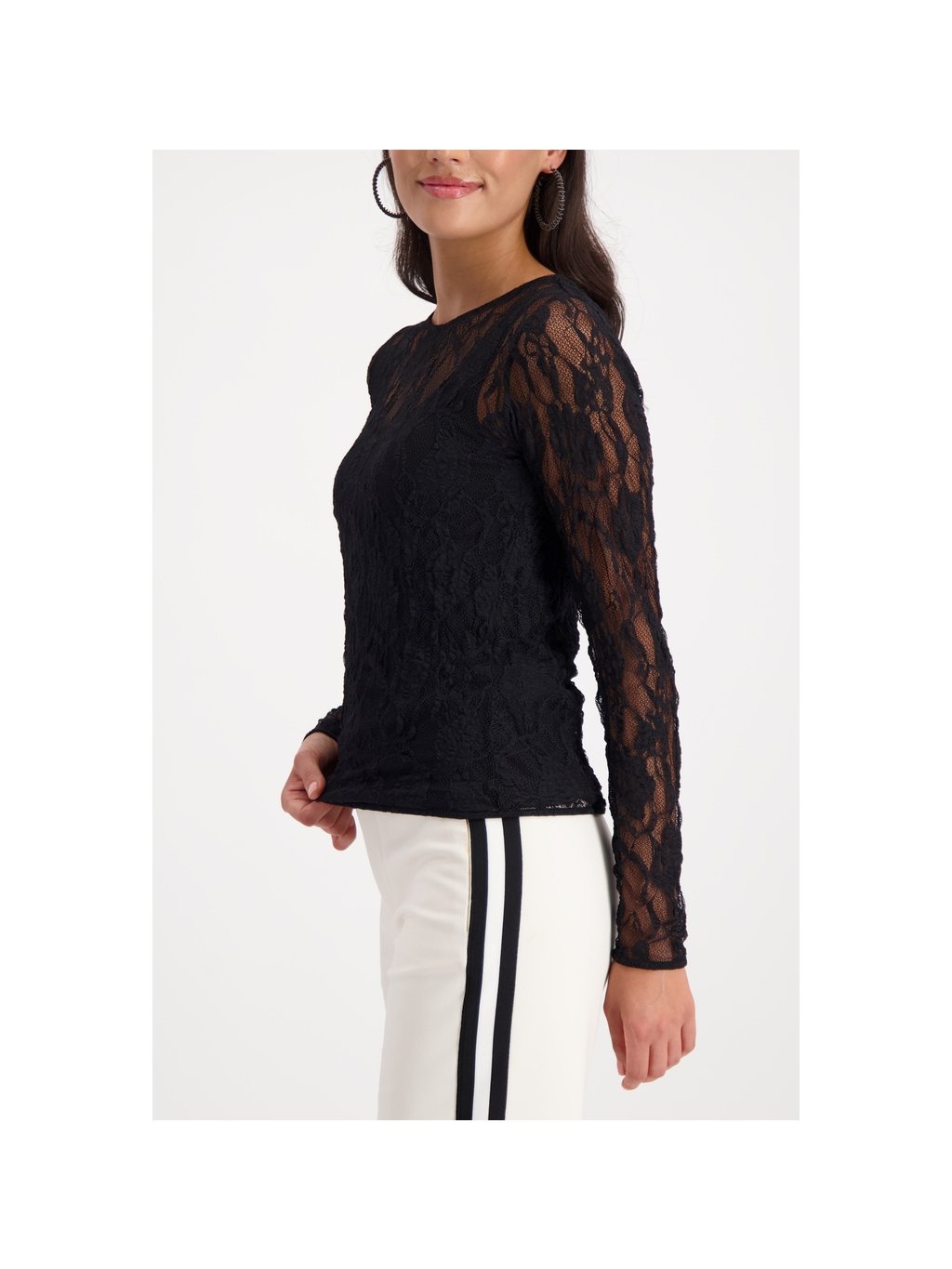 Tato průhledná halenka s dlouhým rukávem z elastické květinové krajky jemně obepíná siluetu a dodává každému outfitu ženský nádech.