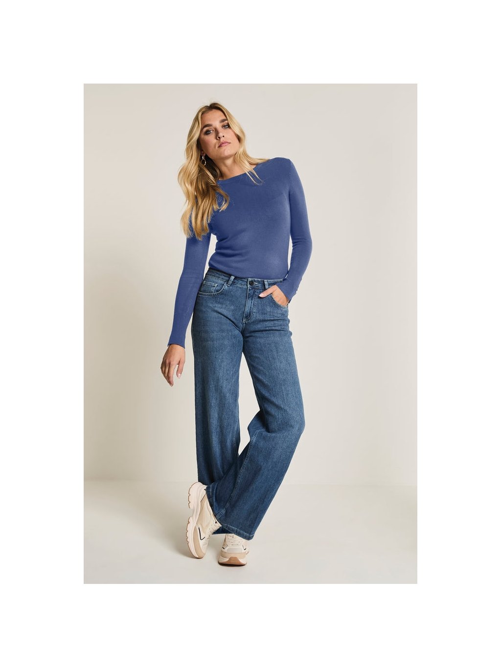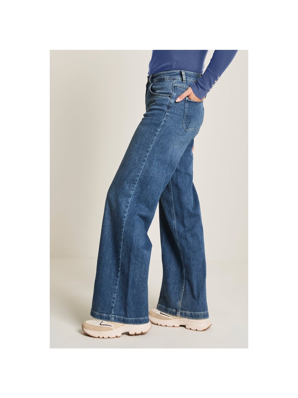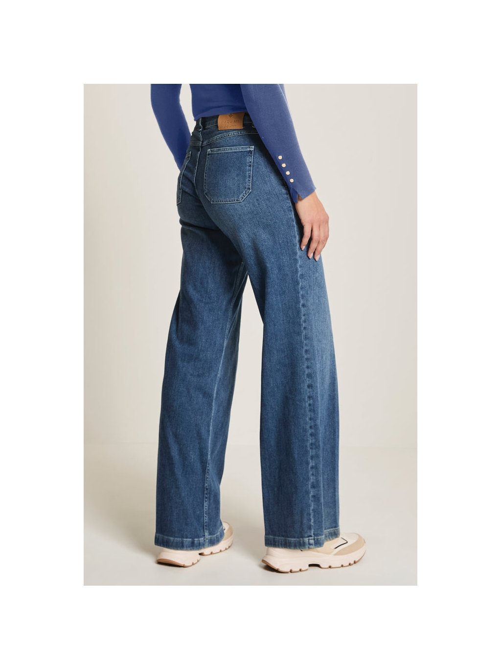 Mira má vysoký pas. Kalhoty jsou volné kolem stehen a mají extra široké rozšířené nohavice.