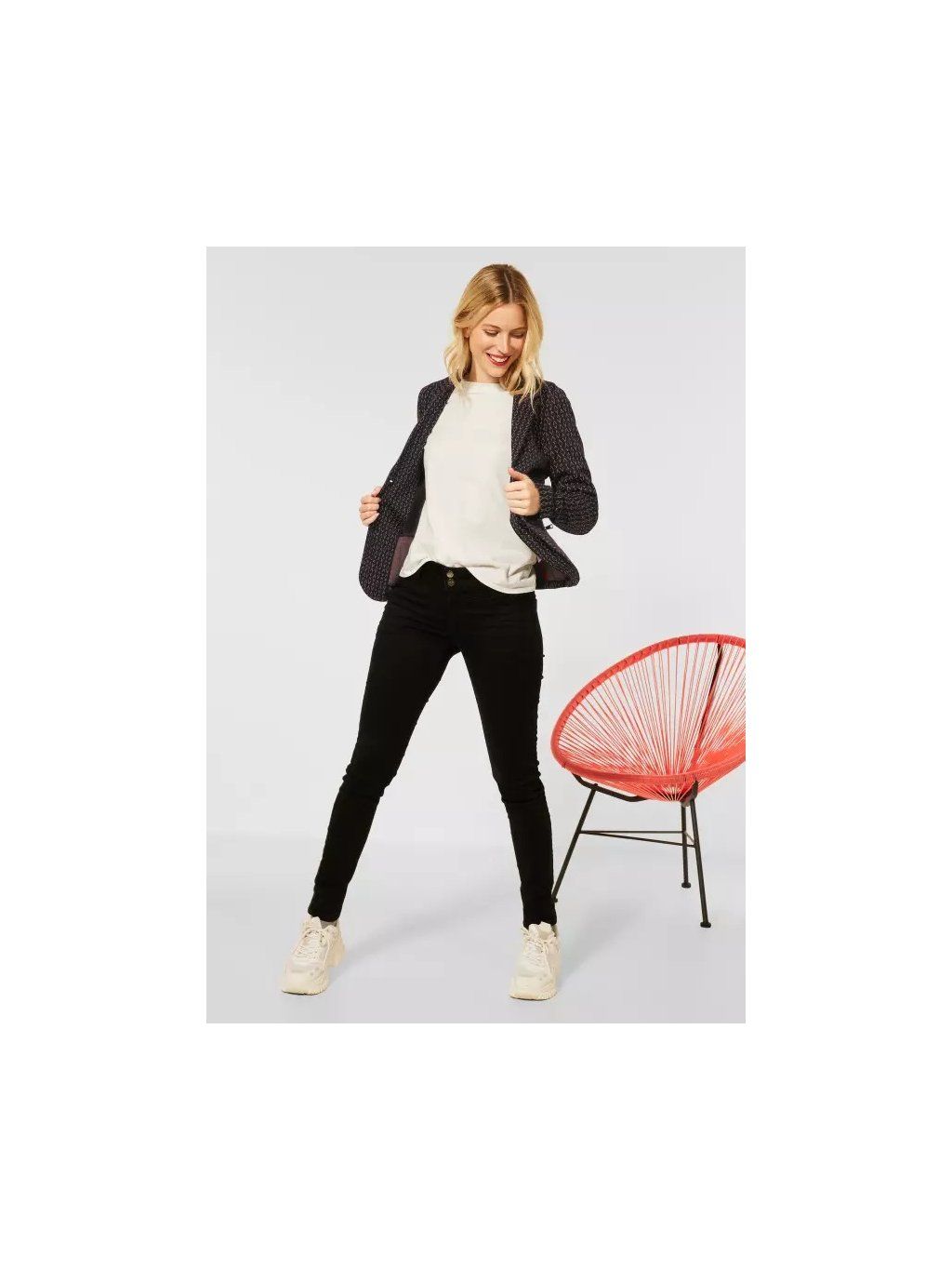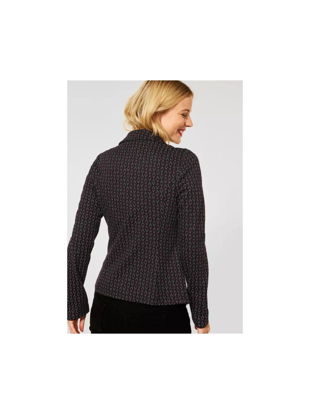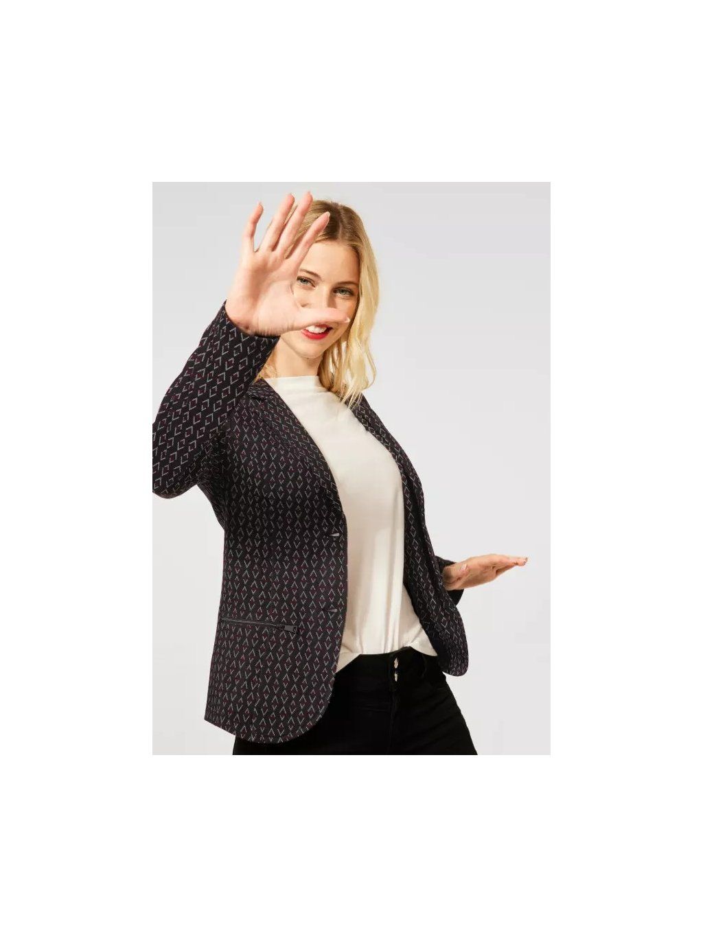 Dámské sako Street One s minimalistickým kosočtvercovým vzorem. Díky svému klasickému tvaru s klopovým límcem a zapínáním na dva knoflíky je toto sako vhodné jak do kanceláře, tak i pro volný čas. Sako je příjemně lehké a pohodlné na nošení.