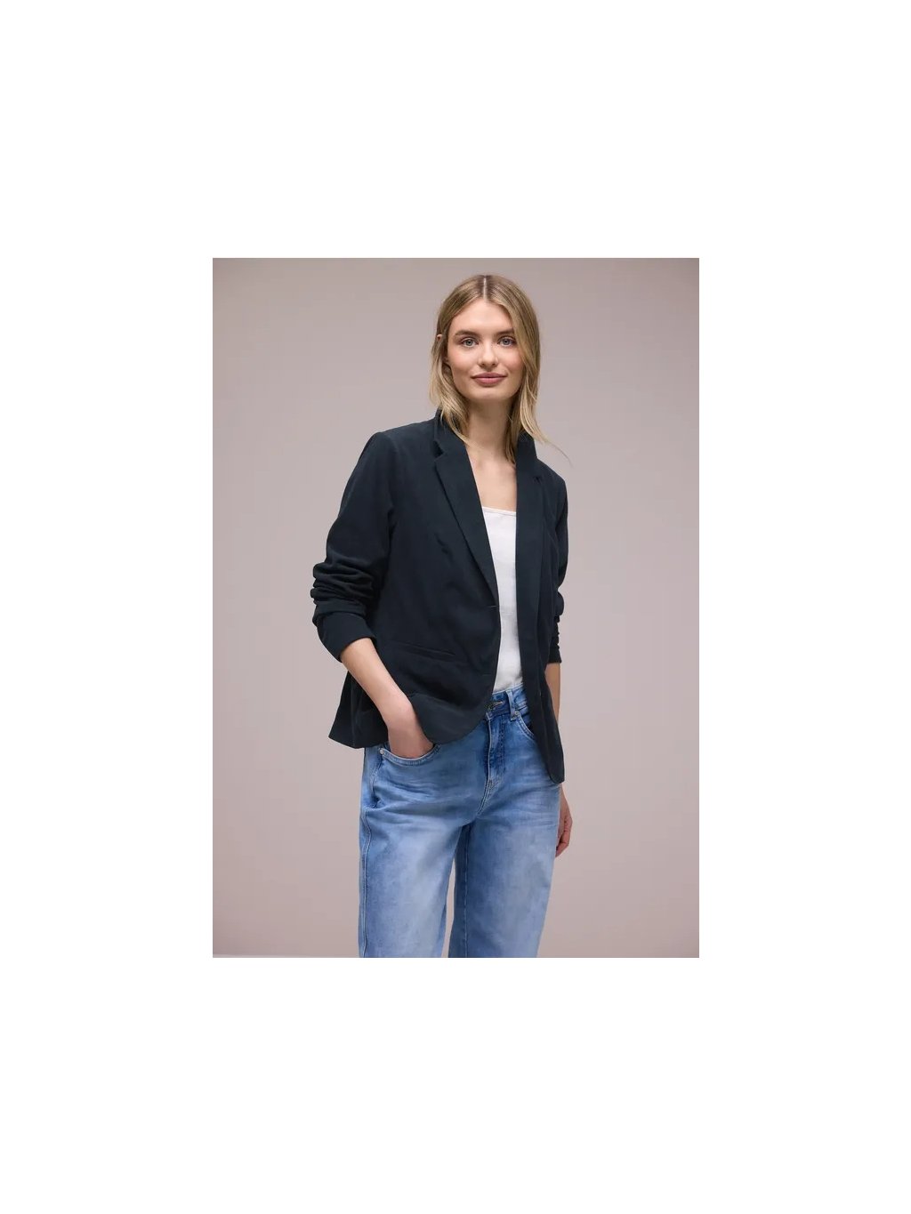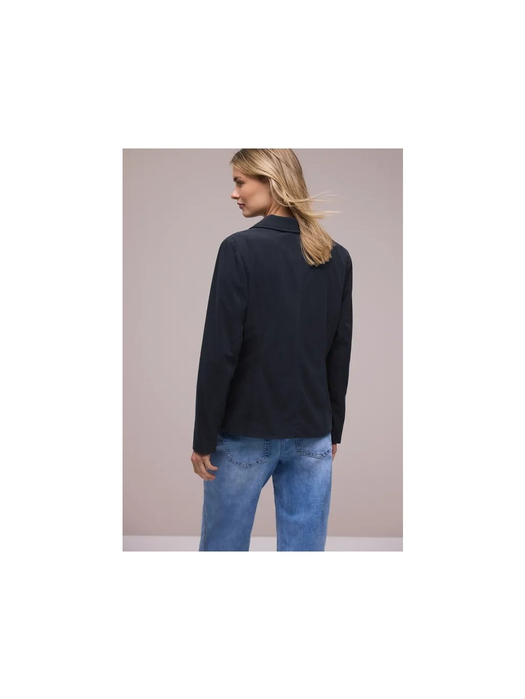 Toto dlouhé sako od Street One pro ženy zaujme svou jemnou texturou a moderním jednobarevným designem. Vroubkovaná klopa a zapínání na knoflíky mu dodávají klasický obchodní vzhled, zatímco boční kapsy nabízejí každodenní pohodlí. Pohodlná látka ho činí mimořádně příjemným na nošení – ideální do kanceláře i pro elegantní ležérní vzhled. Sebevědomý společník pro stylové outfity.