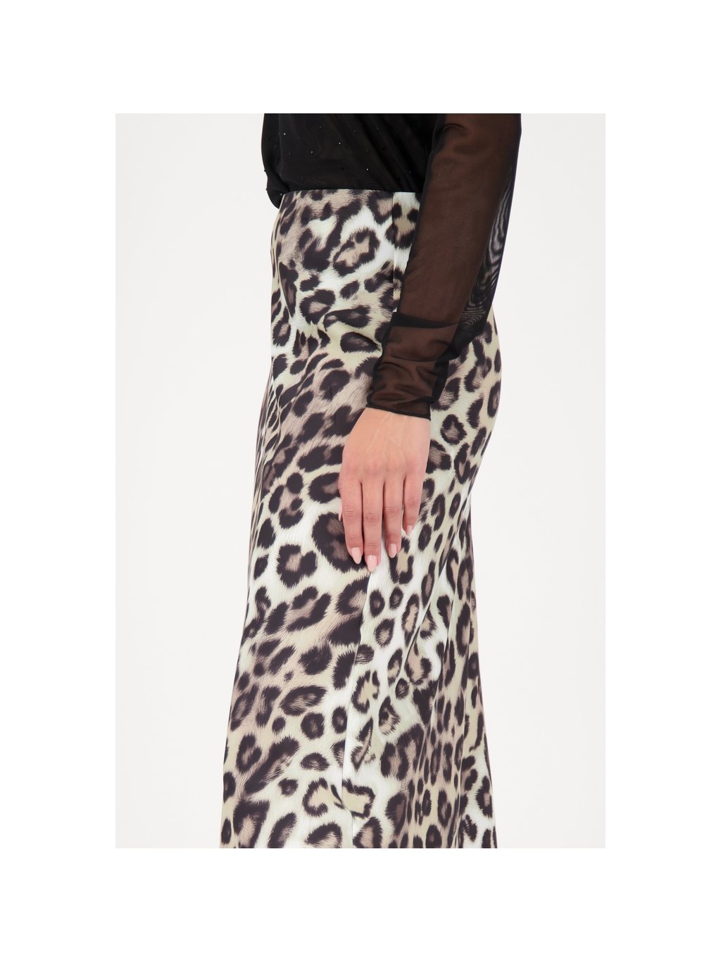 Tato saténová sukně zaujme svým leopardím potiskem a elastickým pasem.