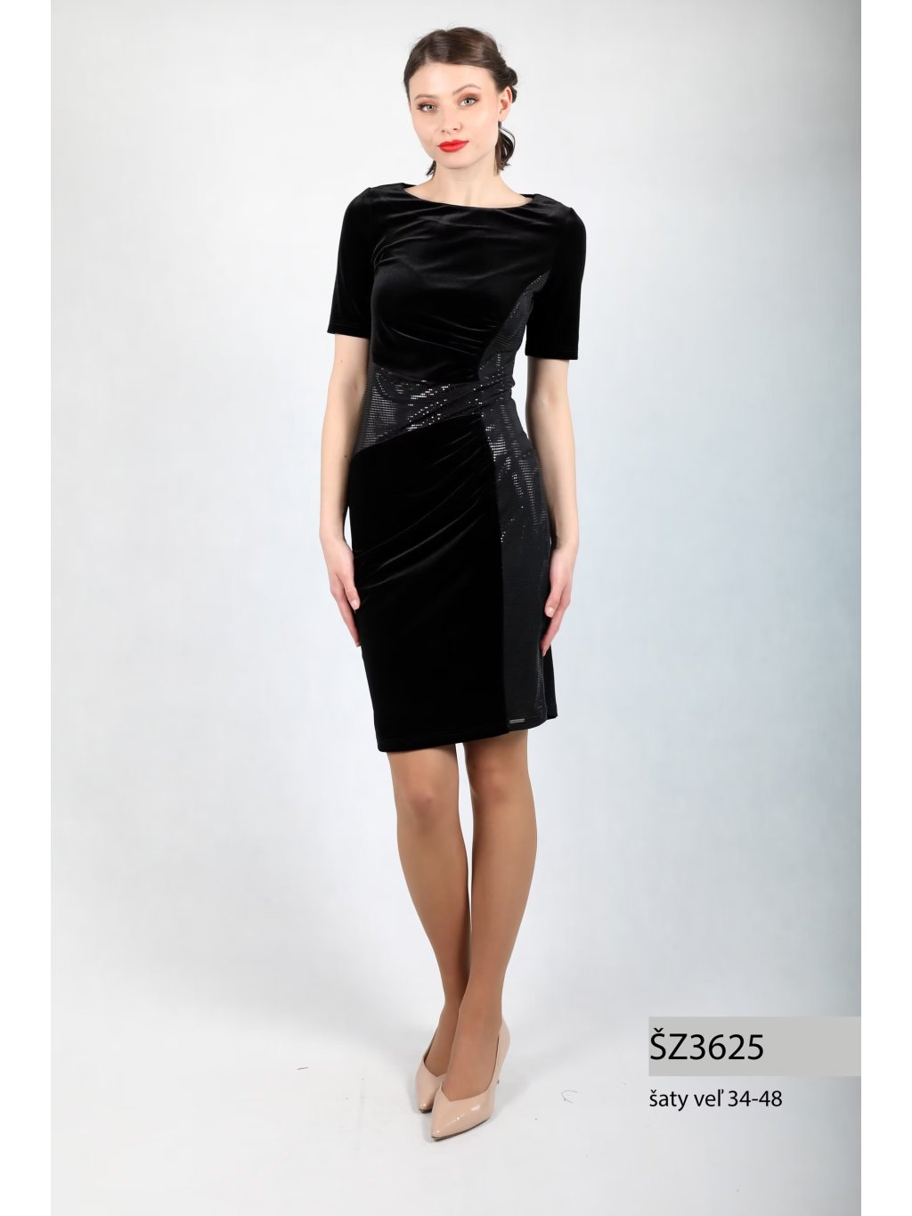 Sametové společenské šaty Andrea Martiny z aktuální kolekce mají řasení na bříšku a boční zeštíhlující pruh, který zvýrazní ženskou siluetu. Šaty mají krátké rukávy, délku nad kolena a jsou nadčasovým kouskem do vašeho šatníku.