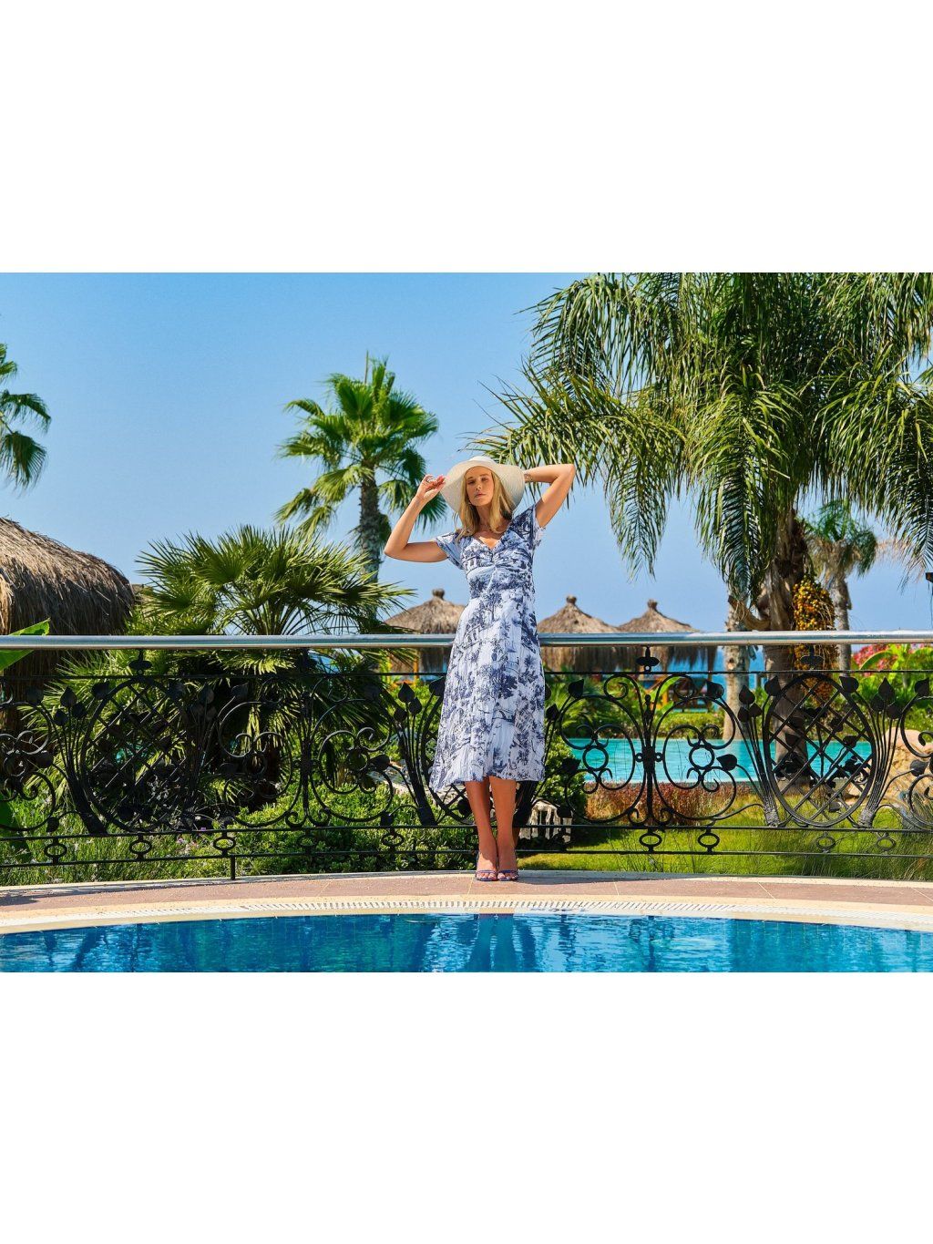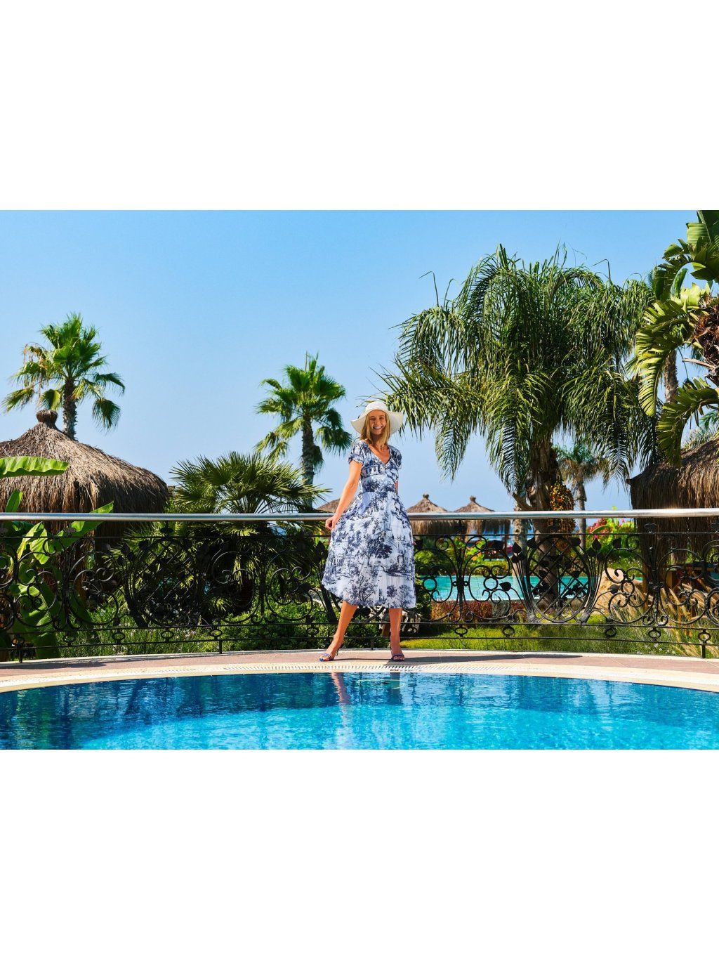 Letní šaty Dolcezza Provence jsou vyrobené ze vzdušné 100 % bavlny, mají výstřih do V, krátké rukávy a na zádech jsou pružné /žabičky/, takže se přizpůsobí postavě. Přiléhavý pružný živůtek kontrastuje s rozšířenou sukní, takže podtrhuje ženskost a styl.