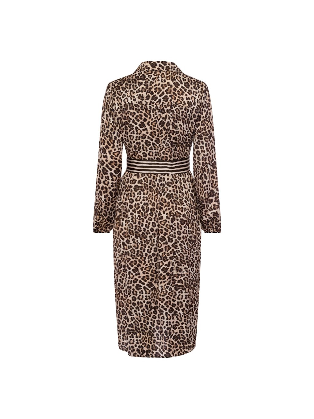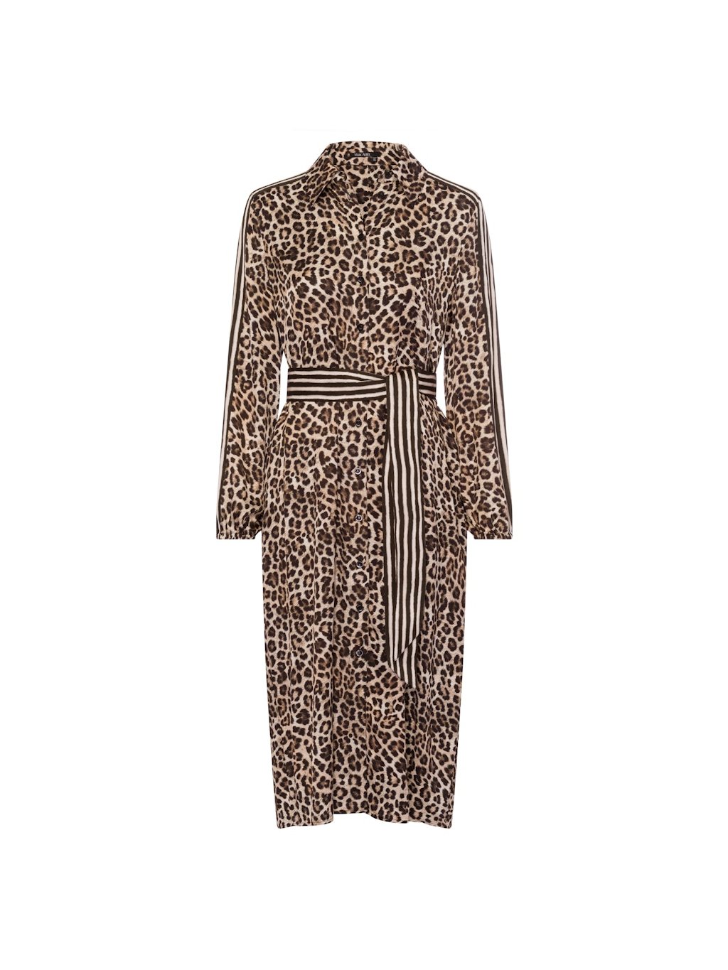 Moderní nezbytnost: Tyto šaty z viskózového saténu kombinují leopardí vzor s pruhovaným patchworkem na ramenou a rukávech. Kapsy ve švech a poutka na pásek dodávají funkční detail. Ideální pro ležérní a zároveň stylový vzhled. Kombinace luxusu a pohodlí...