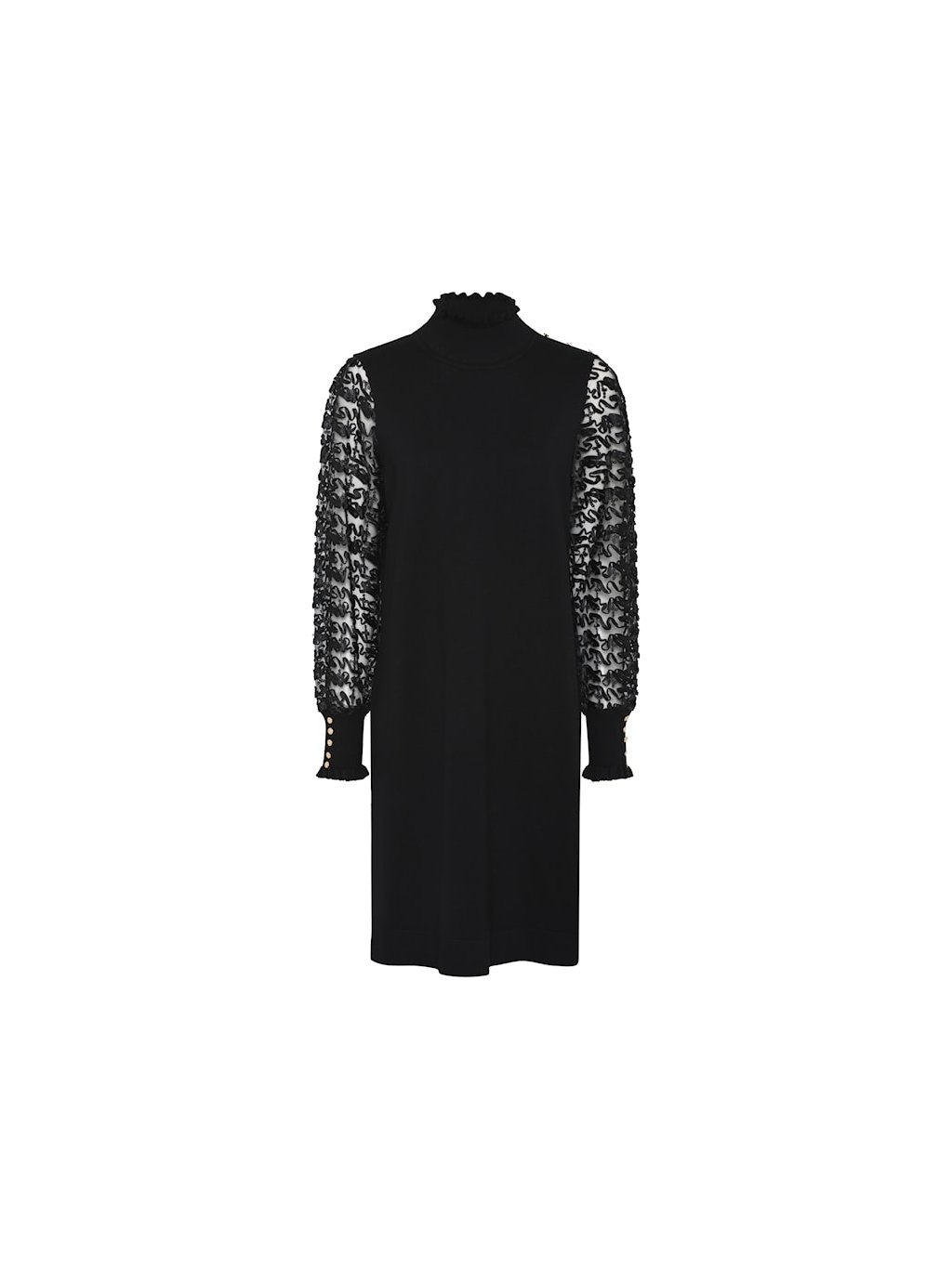 Šaty z aktuální kolekce jsou z jemného úpletu a mají stojáček. Poutavým prvkem jsou krajkové rukávy zakončené širokou manžetou.