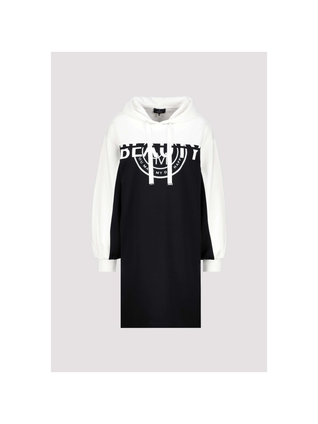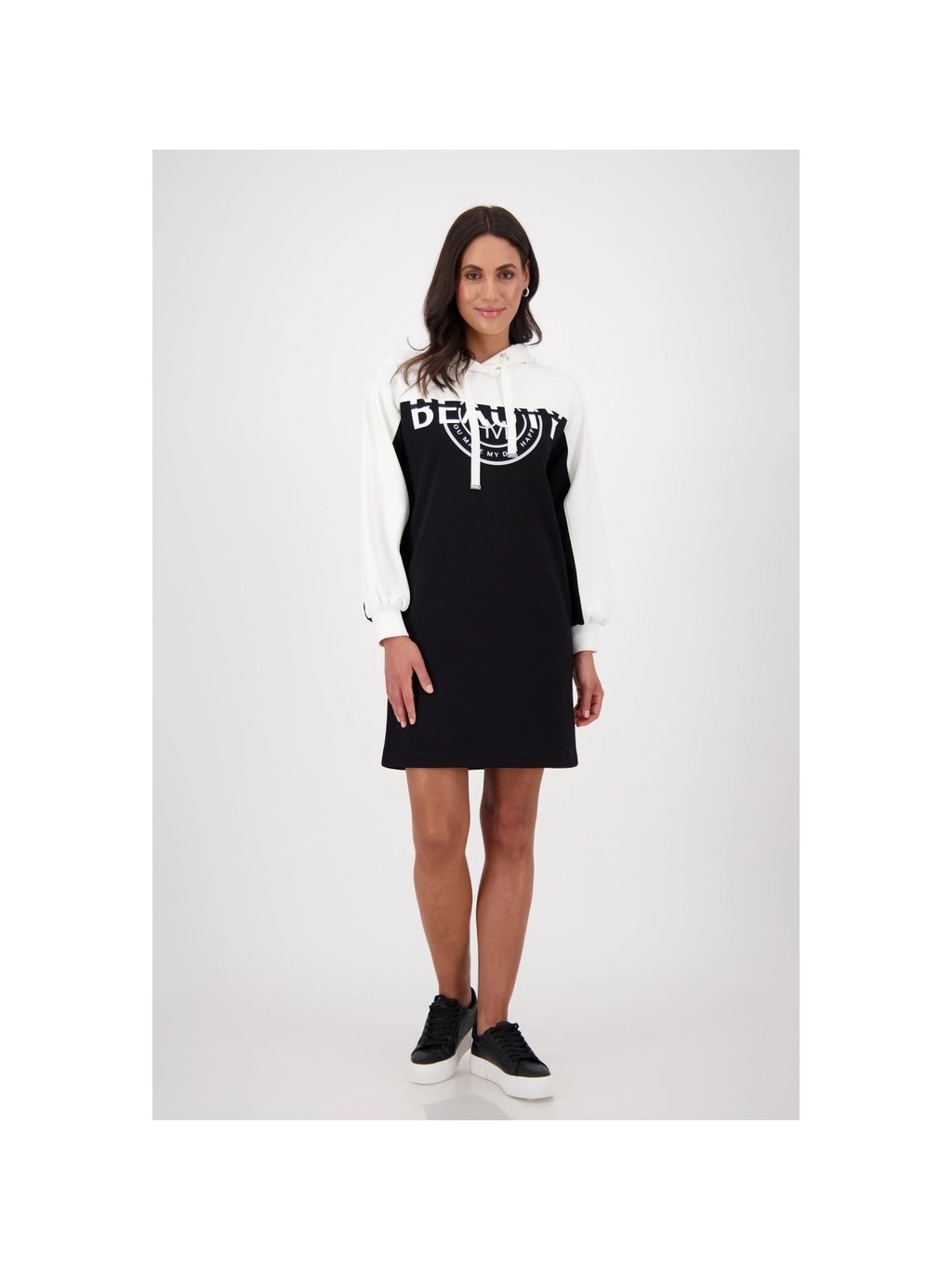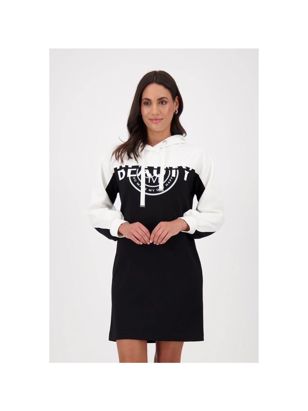 Tyto šaty vyrobené ze splývavé viskózy a pružné látky kombinují pohodlí s módním šmrncem. Nápis „Beauty“ s třpytivými kamínky a moderní barevné kombinace dodávají šatům stylové akcenty. Kapuce se zavazováním dokonale doplňuje sportovně-ženský vzhled – ideální pro ležérní a zároveň poutavé outfity.