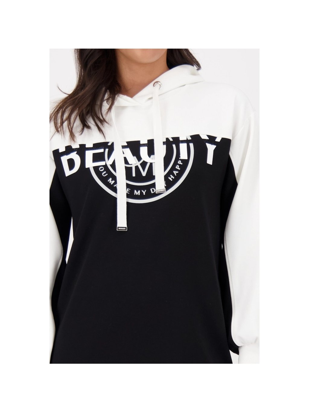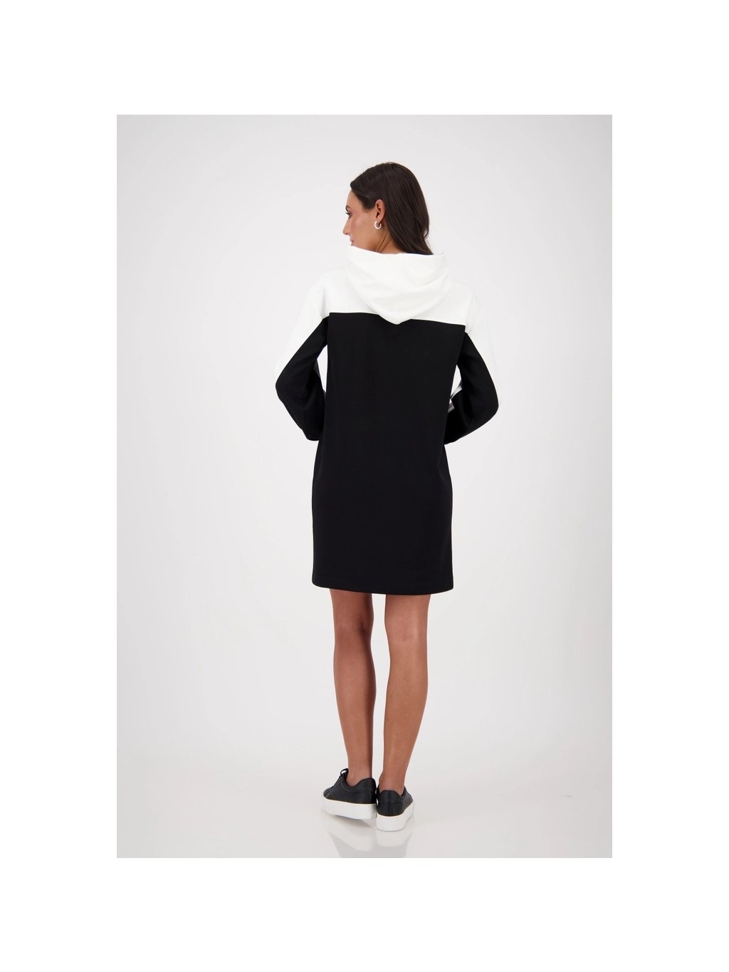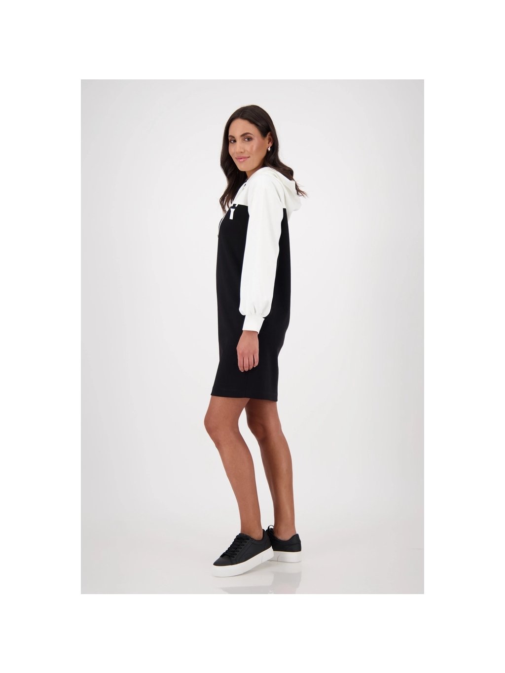 Tyto šaty vyrobené ze splývavé viskózy a pružné látky kombinují pohodlí s módním šmrncem. Nápis „Beauty“ s třpytivými kamínky a moderní barevné kombinace dodávají šatům stylové akcenty. Kapuce se zavazováním dokonale doplňuje sportovně-ženský vzhled – ideální pro ležérní a zároveň poutavé outfity.