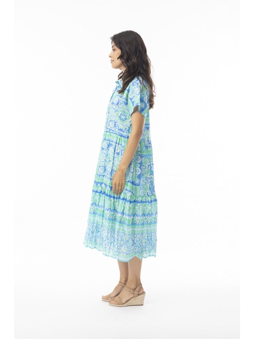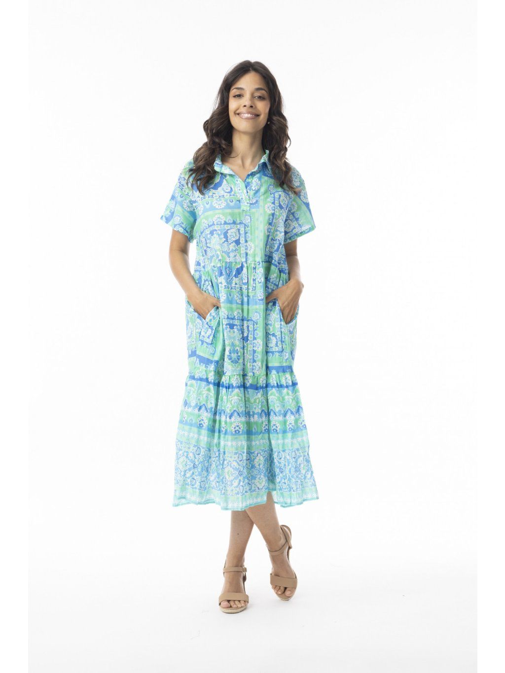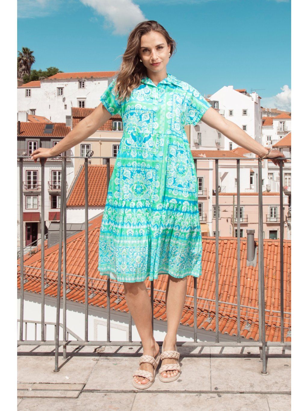 Osvěžte svůj vzhled s našimi stylovými vrstvenými šaty Montevideo Aqua s límečkem. Šaty mají límeček a krátké rukávy, elegantně padají v délce midi, což jim dodává klasický a sofistikovaný nádech. Kombinace krásných potisků a barev s praktickými bočními kapsami dodává stylu praktický prvek. Ať už se jedná o ležérní výlet nebo zvláštní příležitost, tyto šaty jsou perfektním doplňkem pro horké dny.