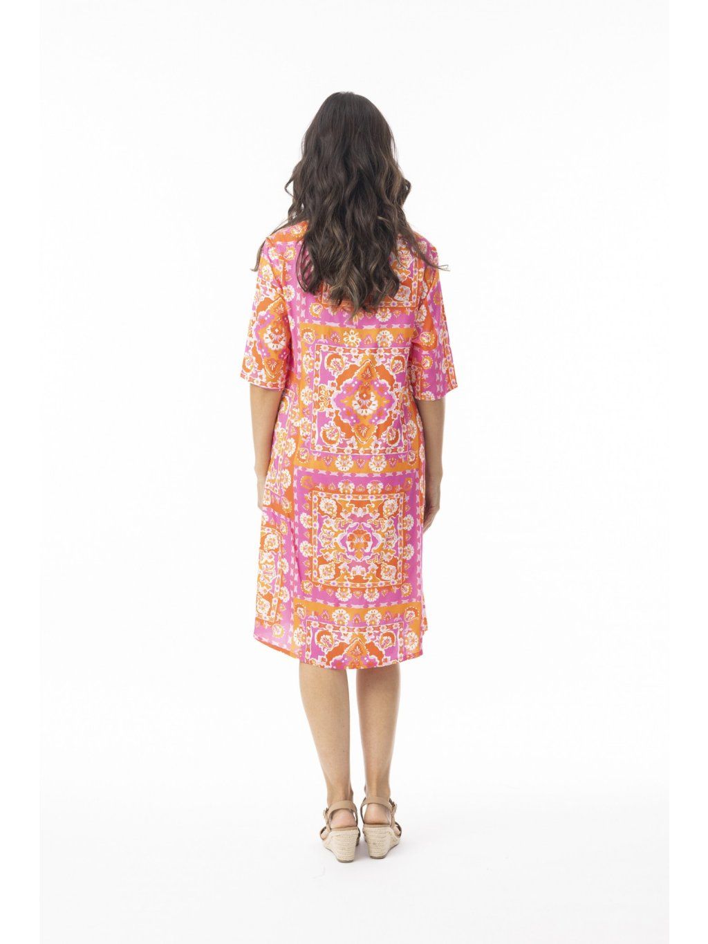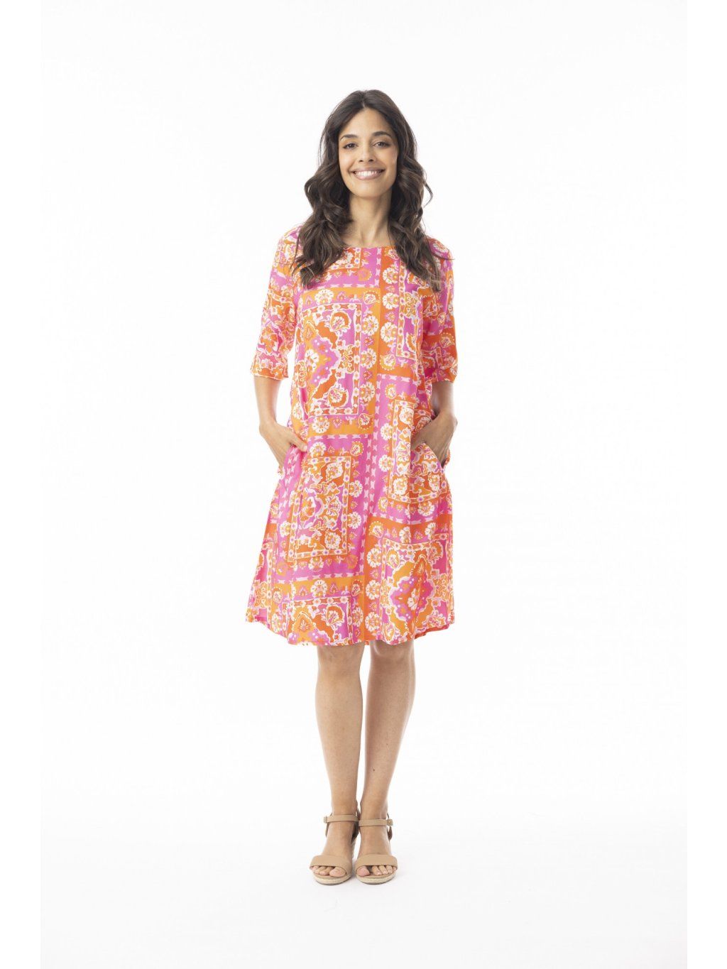 Osvěžte svůj letní styl s našimi krásnými moderními šaty Montevideo Pink. Tyto šaty s barevným, poutavým vzorem se pyšní volným střihem s polovičními rukávy a lichotivým lemem po kolena. Jsou vyrobeny z lehké a prodyšné látky, takže jsou ideální do teplého počasí. Kulatý výstřih a praktické boční kapsy dodávají šatům funkční eleganci, takže jsou ideální jak pro neformální výlety, tak pro dovolenou na pláži.
