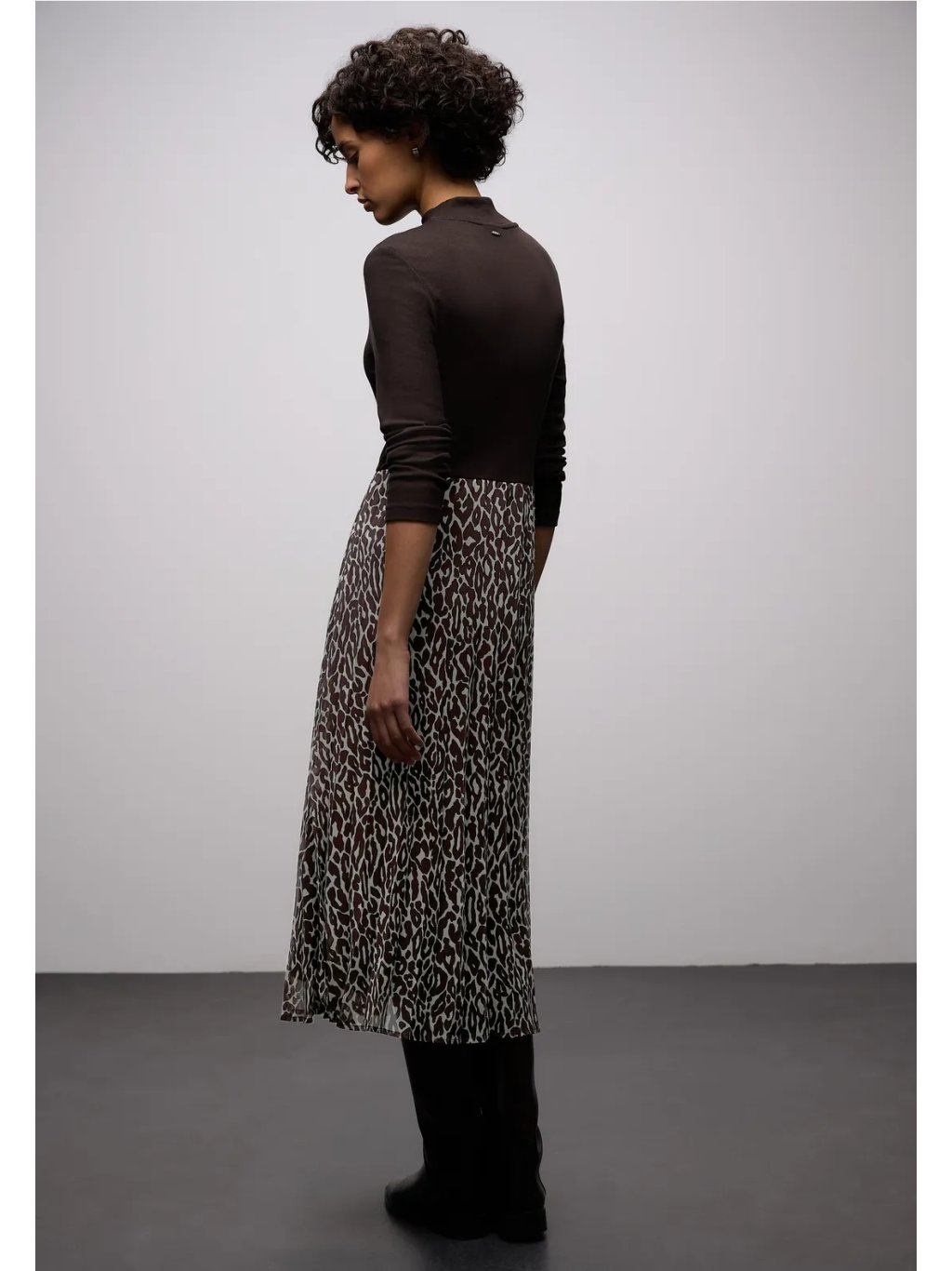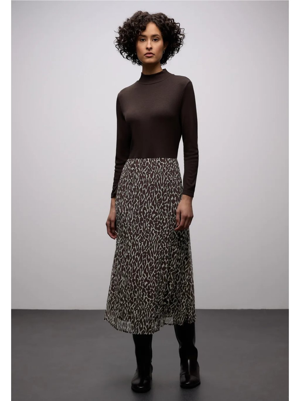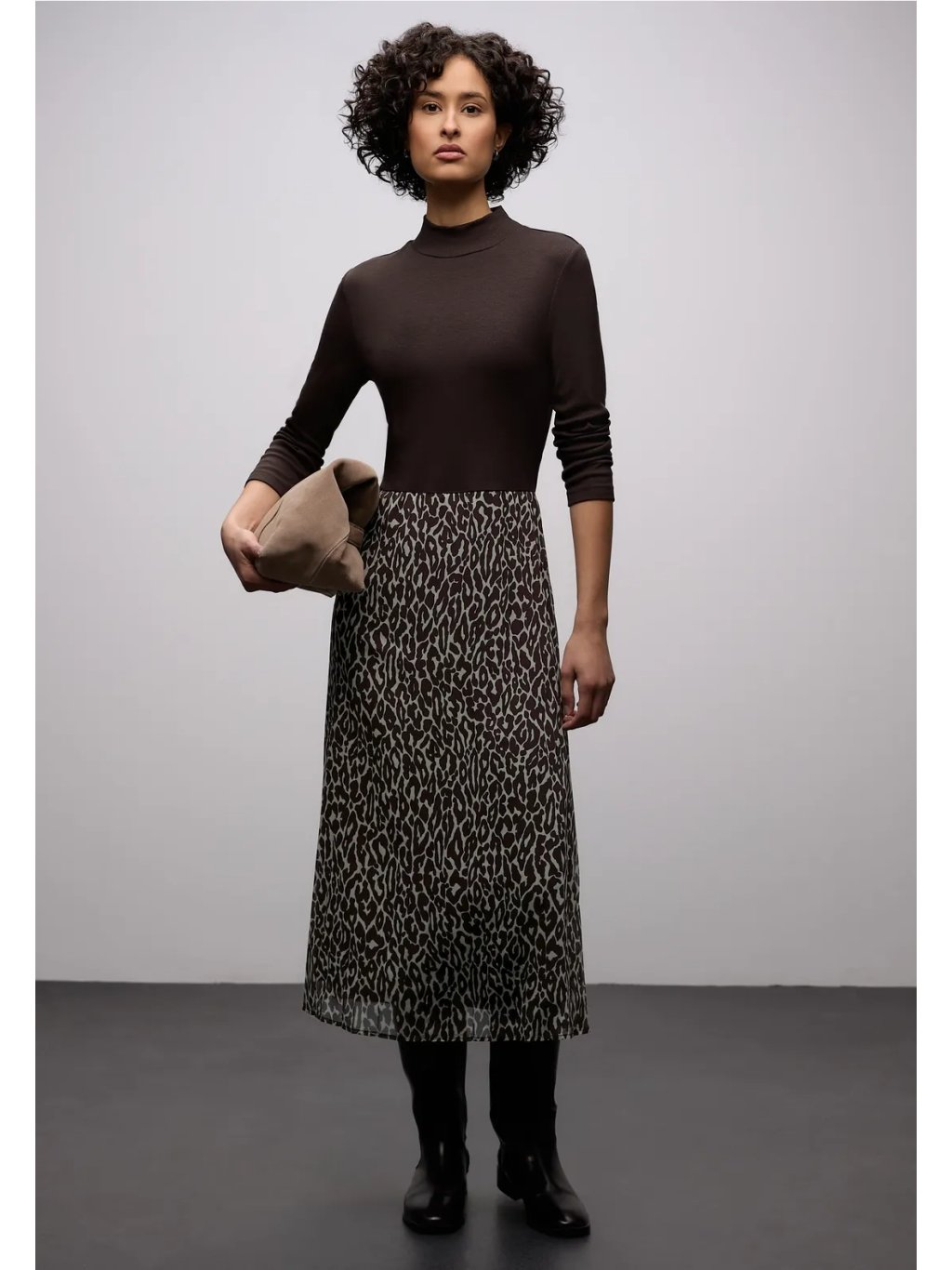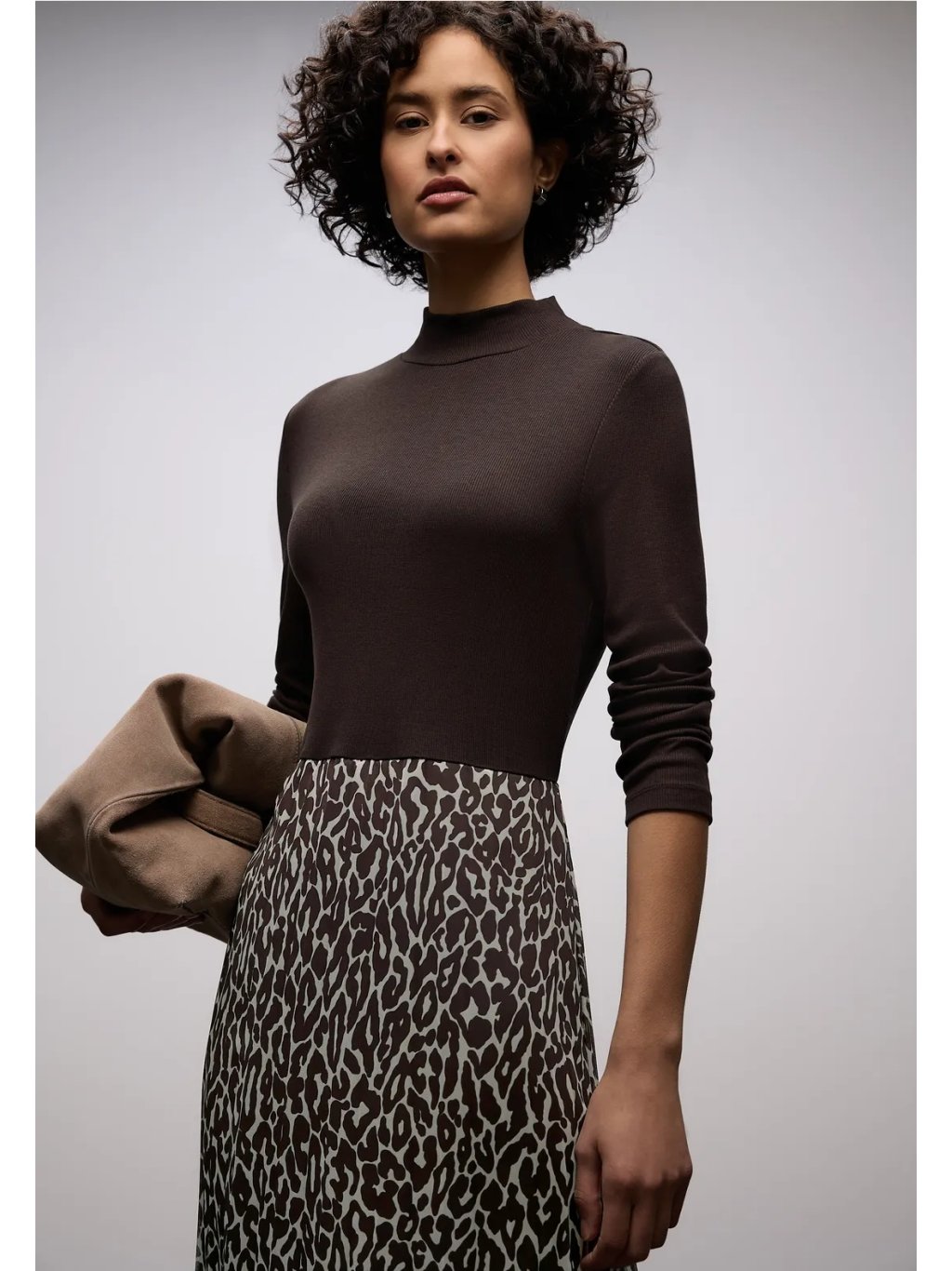 Tyto dámské šaty od Street One kombinují jemně žebrovaný žerzejový top v jednobarevné barvě s ženskou plisovanou sukní s leopardím vzorem – moderní a stylové. Šaty se pohodlně nosí a dají se módně stylizovat. Pohodlný střih a výrazný zvířecí vzor dělají z těchto šatů skutečný poutač ve vašem šatníku.