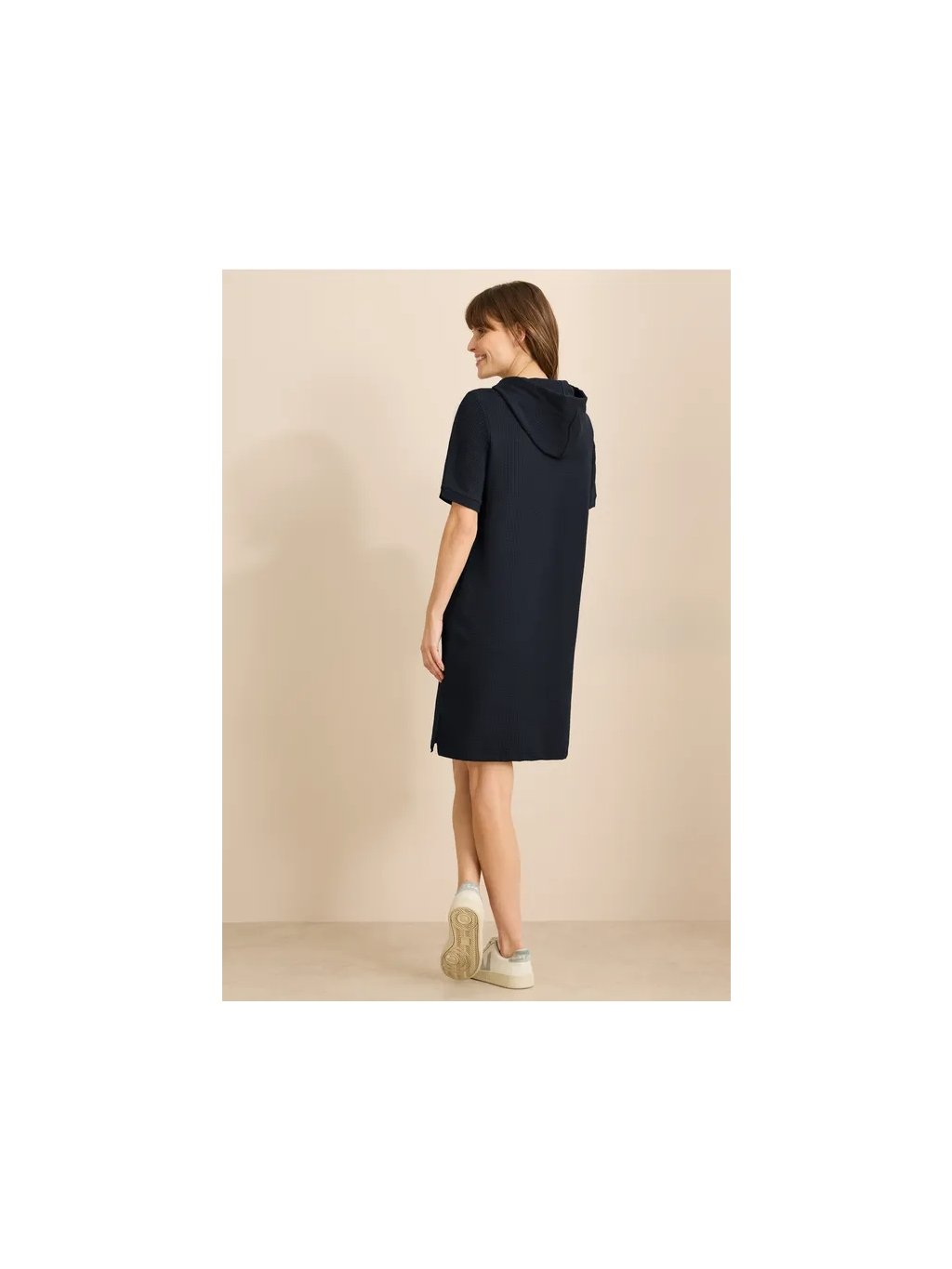 Strukturované dámské šaty Cecil s kapucí dodají vašemu šatníku sportovní akcenty. Kapuce se stahovací šňůrkou, krátké rukávy a boční rozparky v lemu dělají ze šatů po kolena pohodlného a ležérního společníka. Směs bavlny se strečem zajišťuje pohodlné nošení.