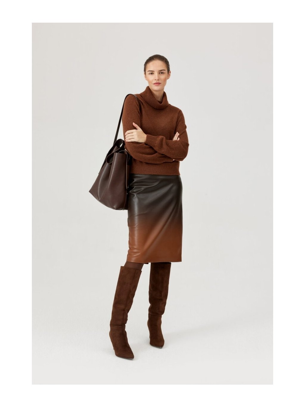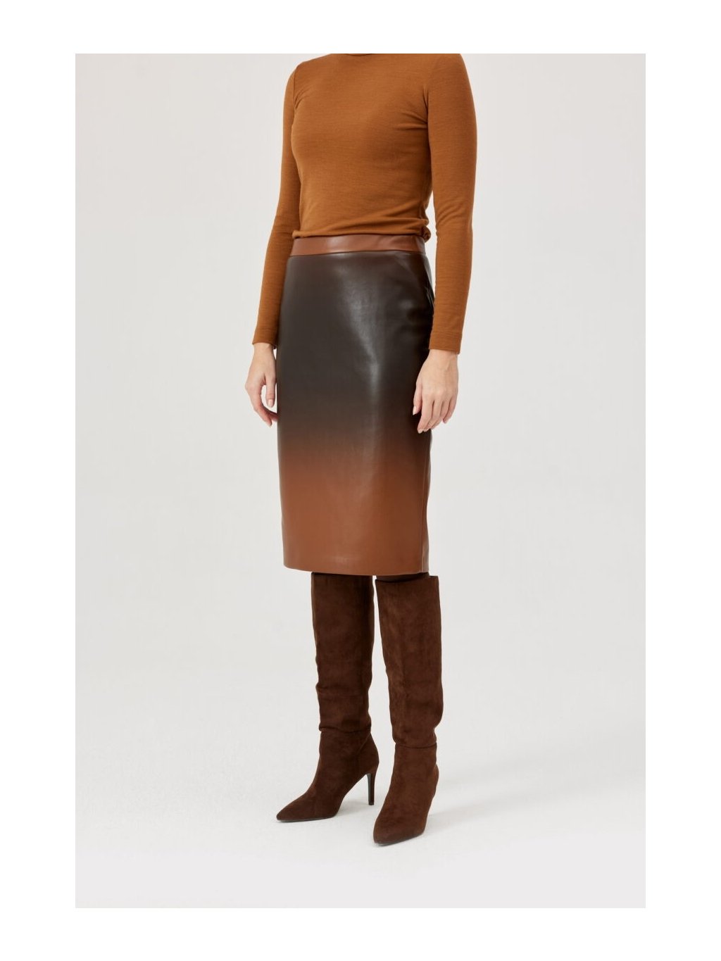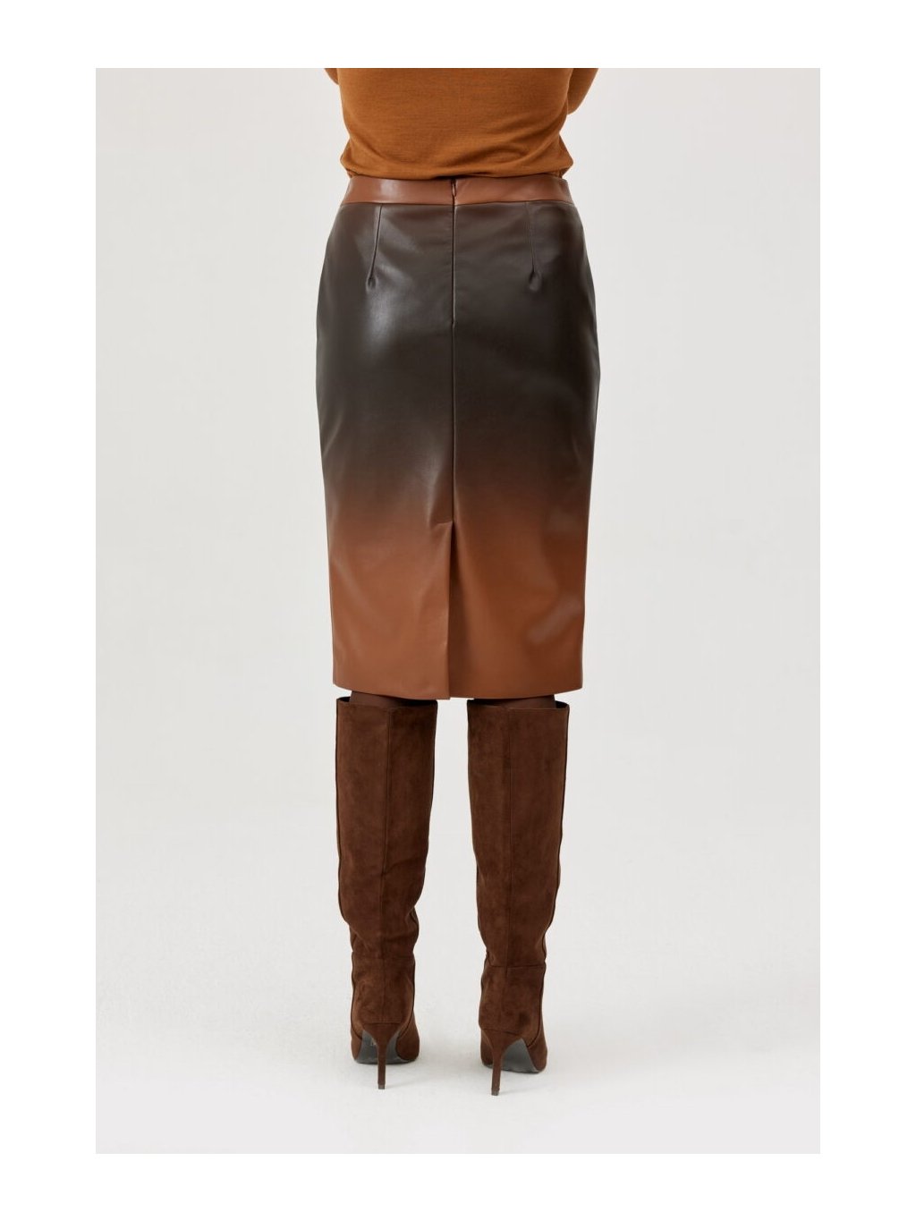 Ombré sukně FÉRIA – moderní klasika s nádechem sofistikovanosti. Tato rovně střižená sukně je vyrobena z měkké umělé kůže s jemným leskem. Zaujme svým výrazným barevným přechodem – od tmavě hnědé nahoře po teplou karamelovou dole. Délka ke kolenům a hladký pas zdůrazňují elegantní charakter kousku. Krásně se hodí jak k přiléhavé halence, tak k oversized svetru – perfektní volba pro kancelářský i večerní outfit.