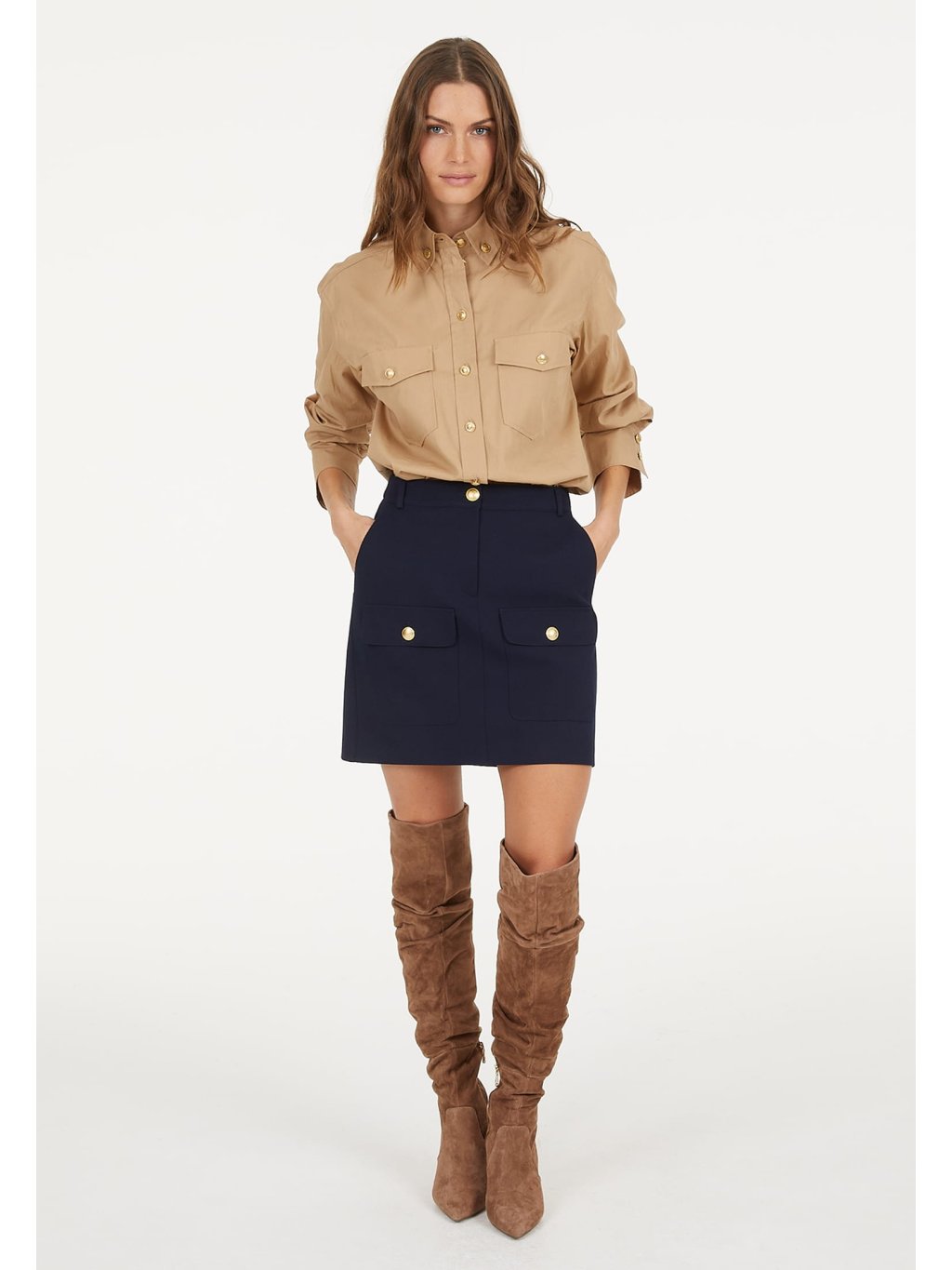 Tato krátká sukně zaujme svým perfektně padnoucím střihem a zlatými knoflíky. Ideální kousek pro stylový a moderní vzhled.