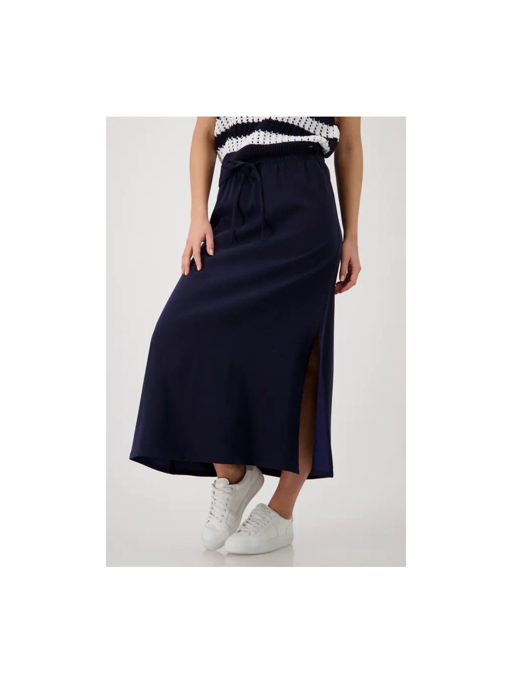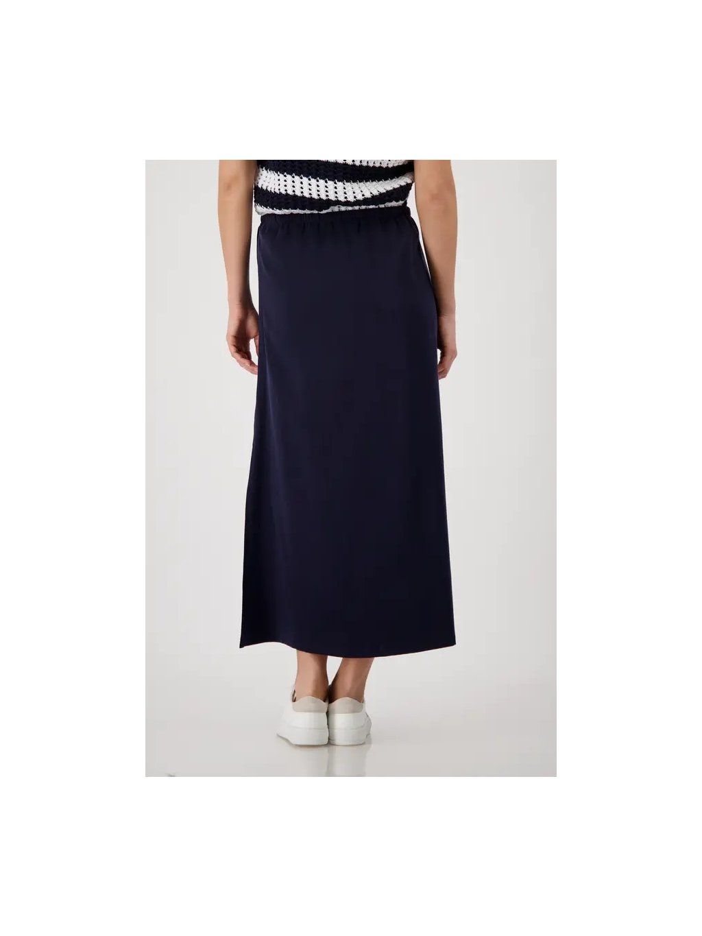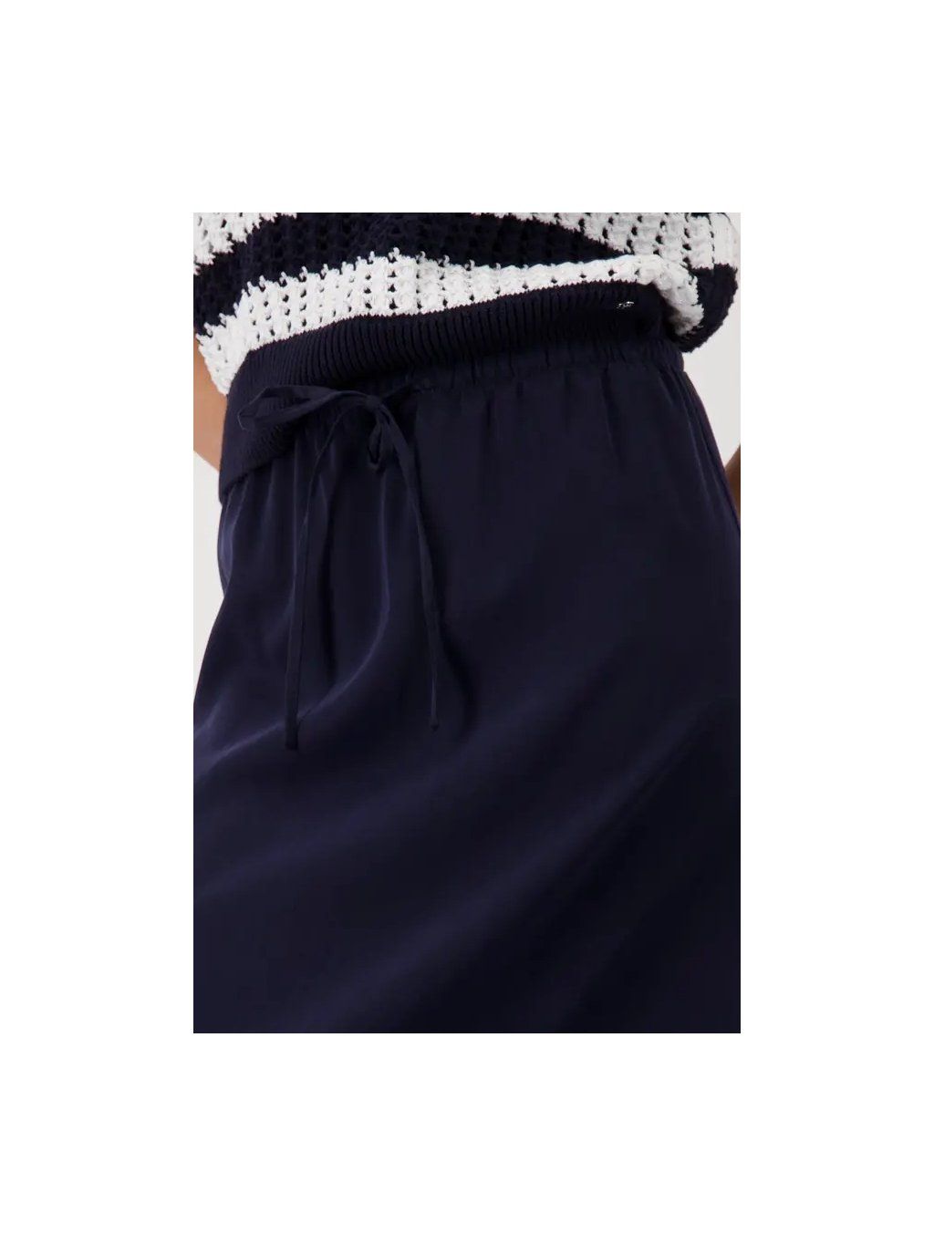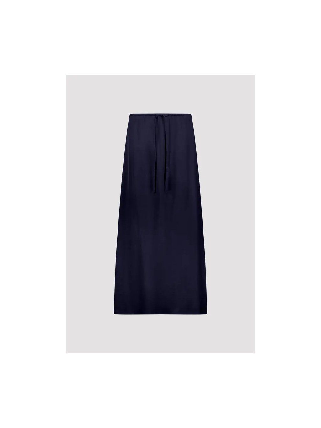 Elegantní, hedvábná midi sukně vyrobená z vysoce kvalitní bavlny a měďnatého vlákna se stahovací šňůrkou a bočním rozparkem pro módní styl. |