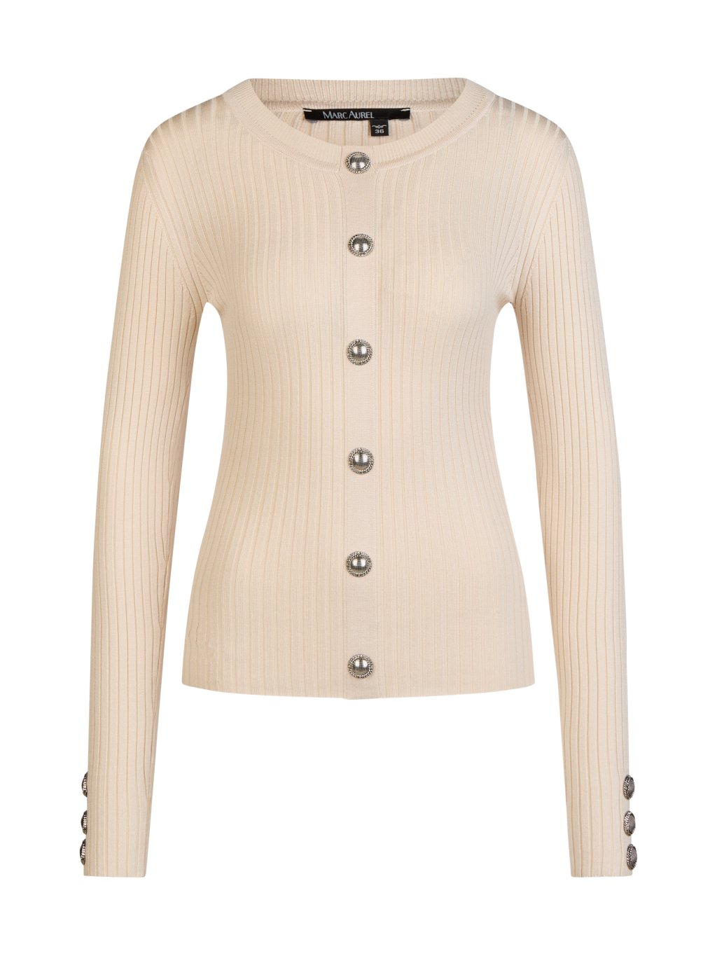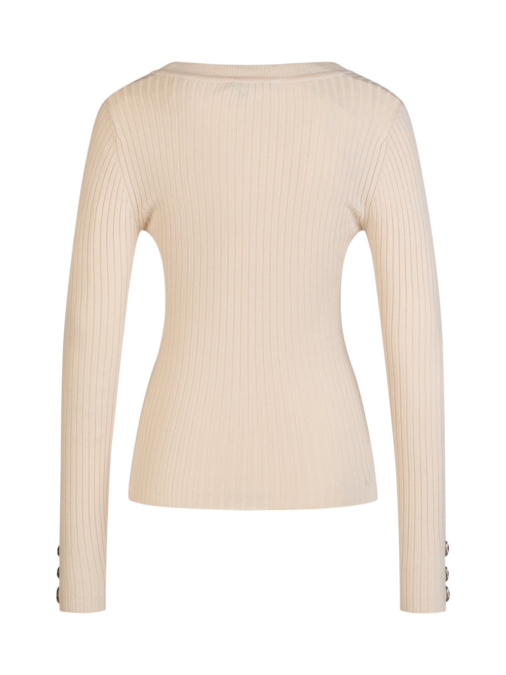 Jemné ozdobné knoflíky dodávají tomuto svetru decentní akcenty. Plochá žebrovaná struktura z měkké směsi viskózy zajišťuje pohodlné nošení, zatímco klasický kulatý výstřih harmonicky doplňuje design.
