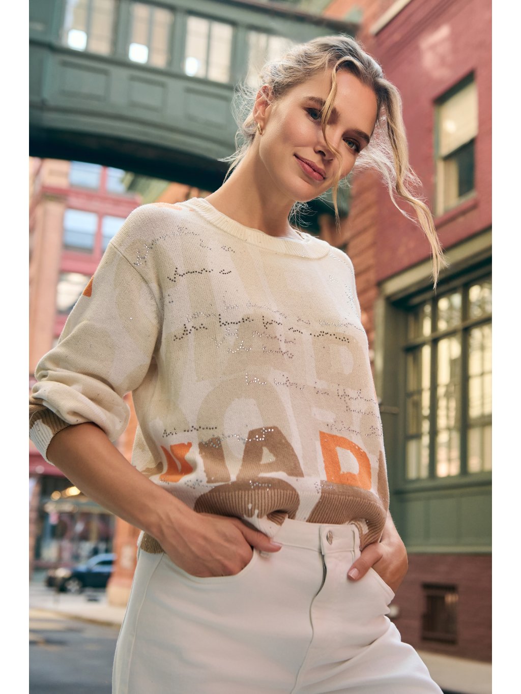 Pletený svetr z vysoce kvalitní bavlny s třpytivými flitry a kamínky, jemný na dotek a má módní vzor s písmeny.